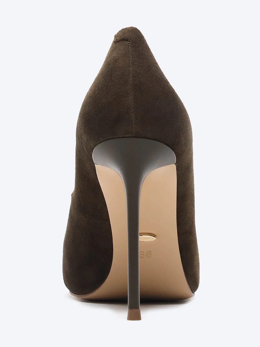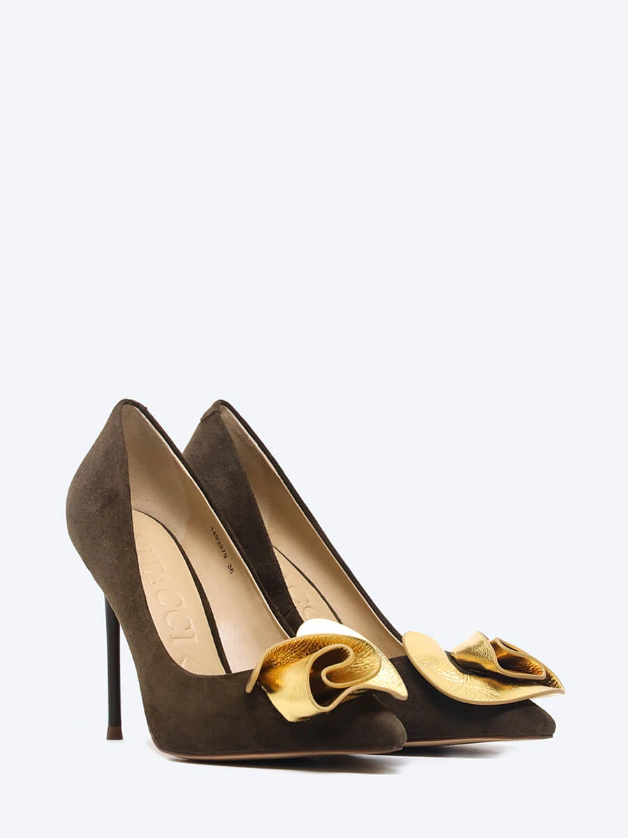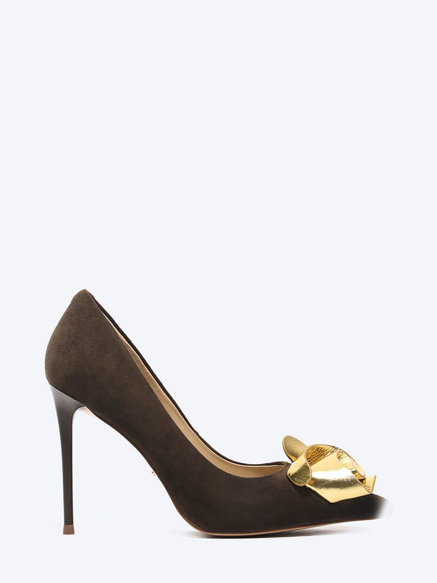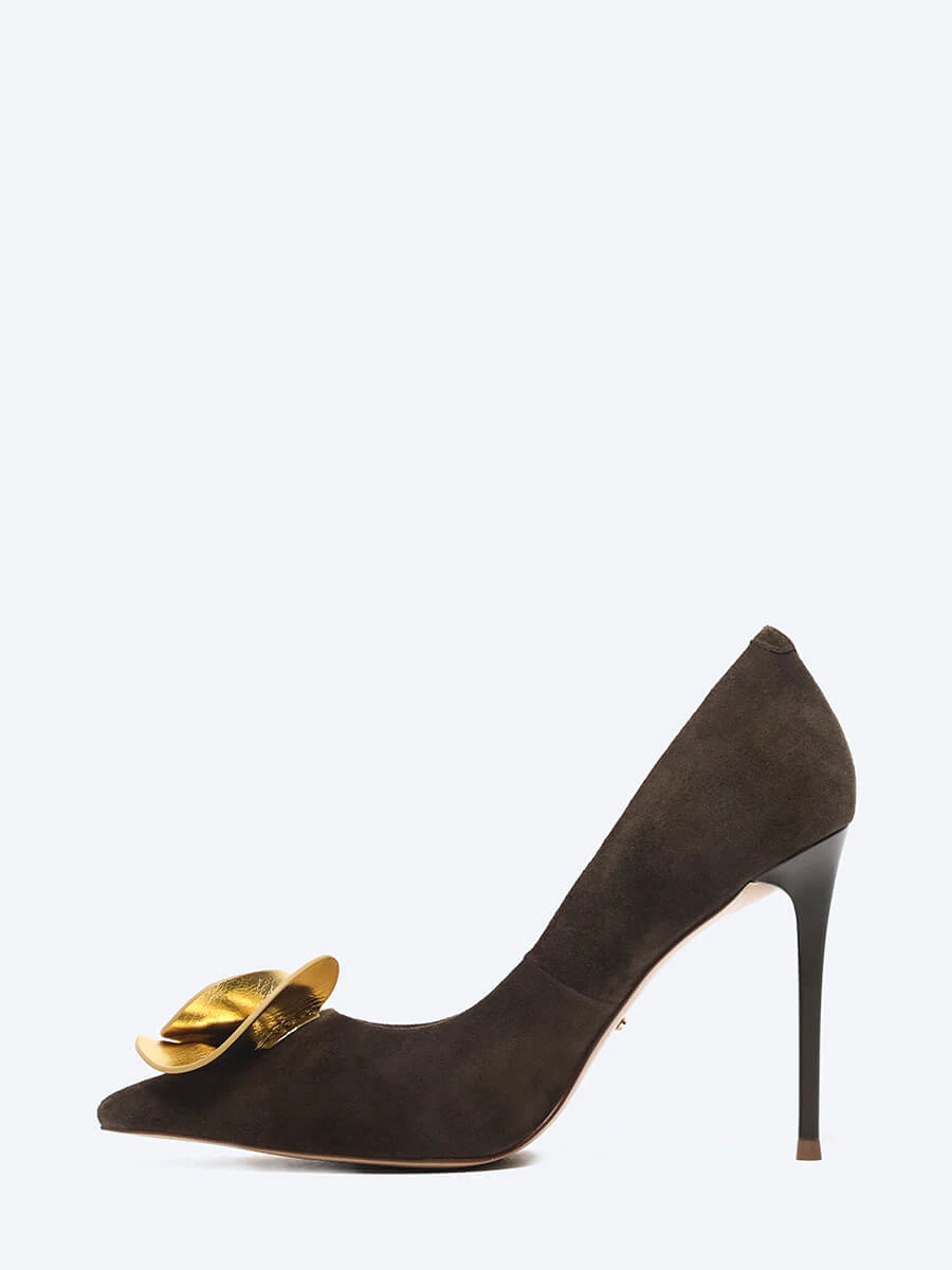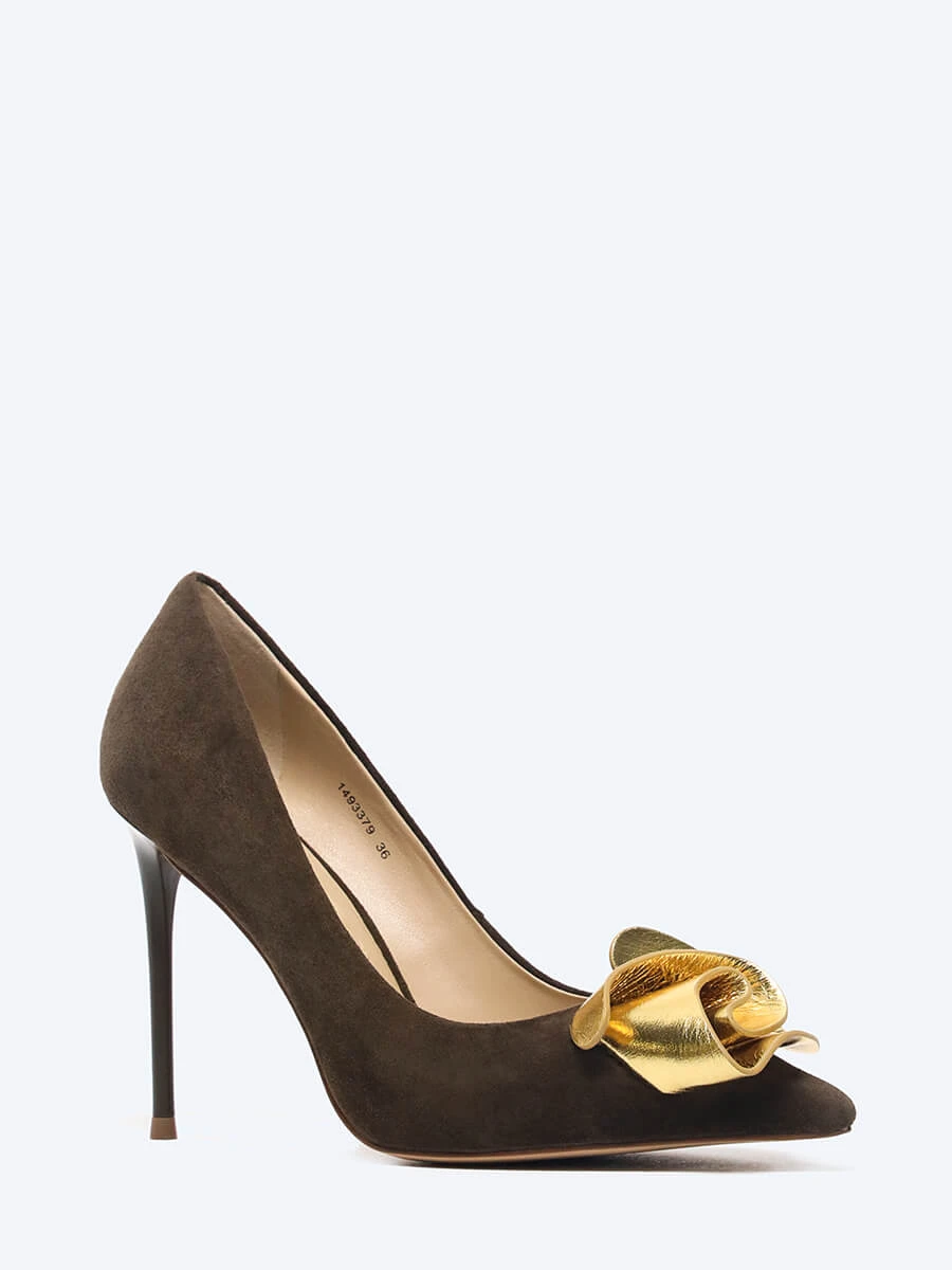 Туфли-лодочки выполнены из натурального велюра. Стелька из натуральной кожи. Особенности модели: острый носок с декором, высокий каблук-шпилька.
