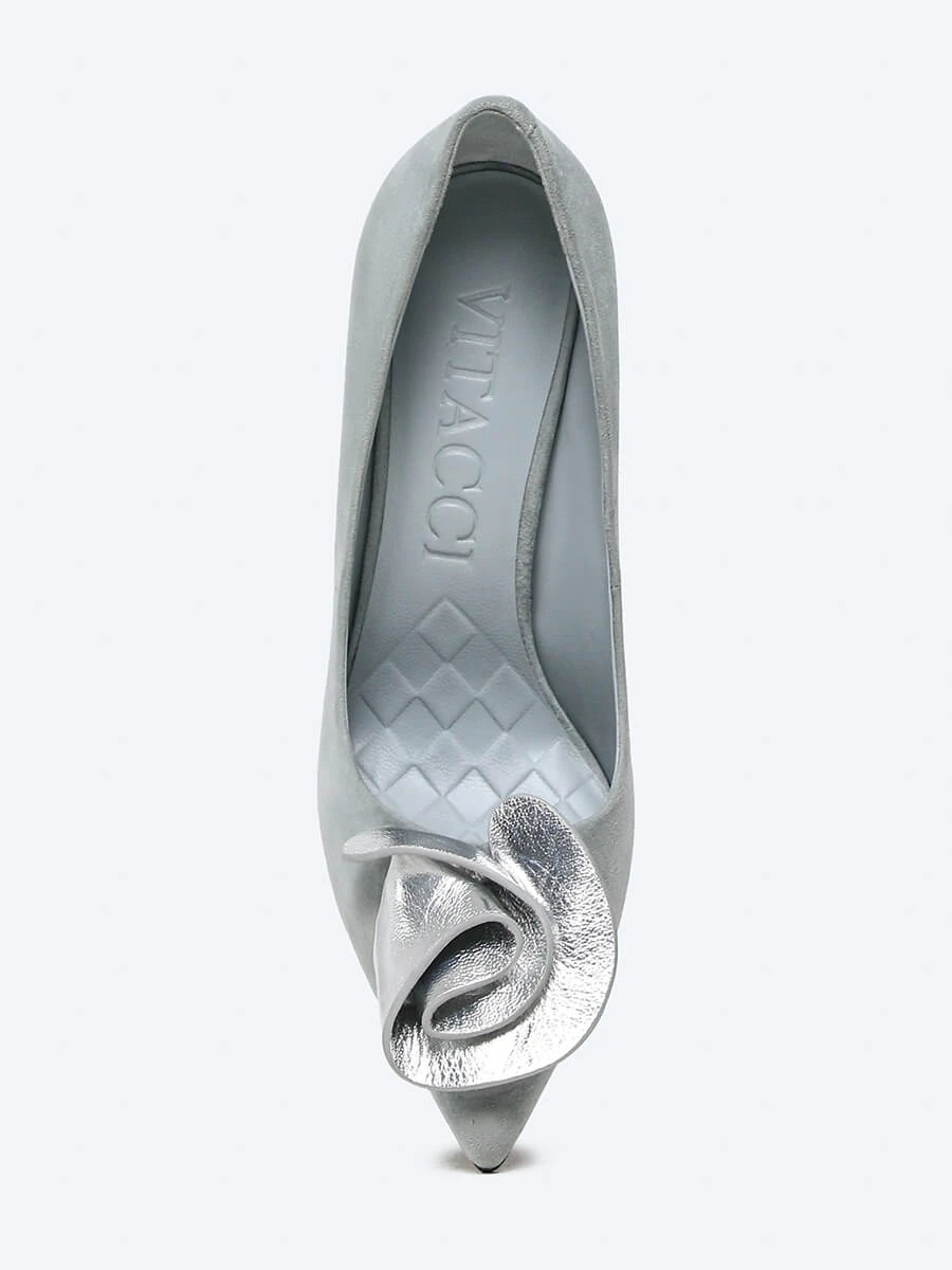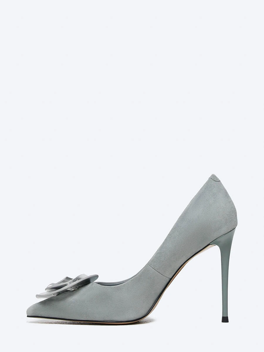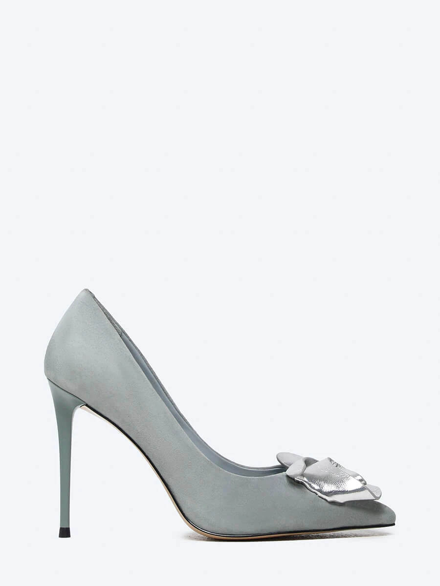 Туфли-лодочки выполнены из натурального велюра. Стелька из натуральной кожи. Особенности модели: острый носок с декором, высокий каблук-шпилька.