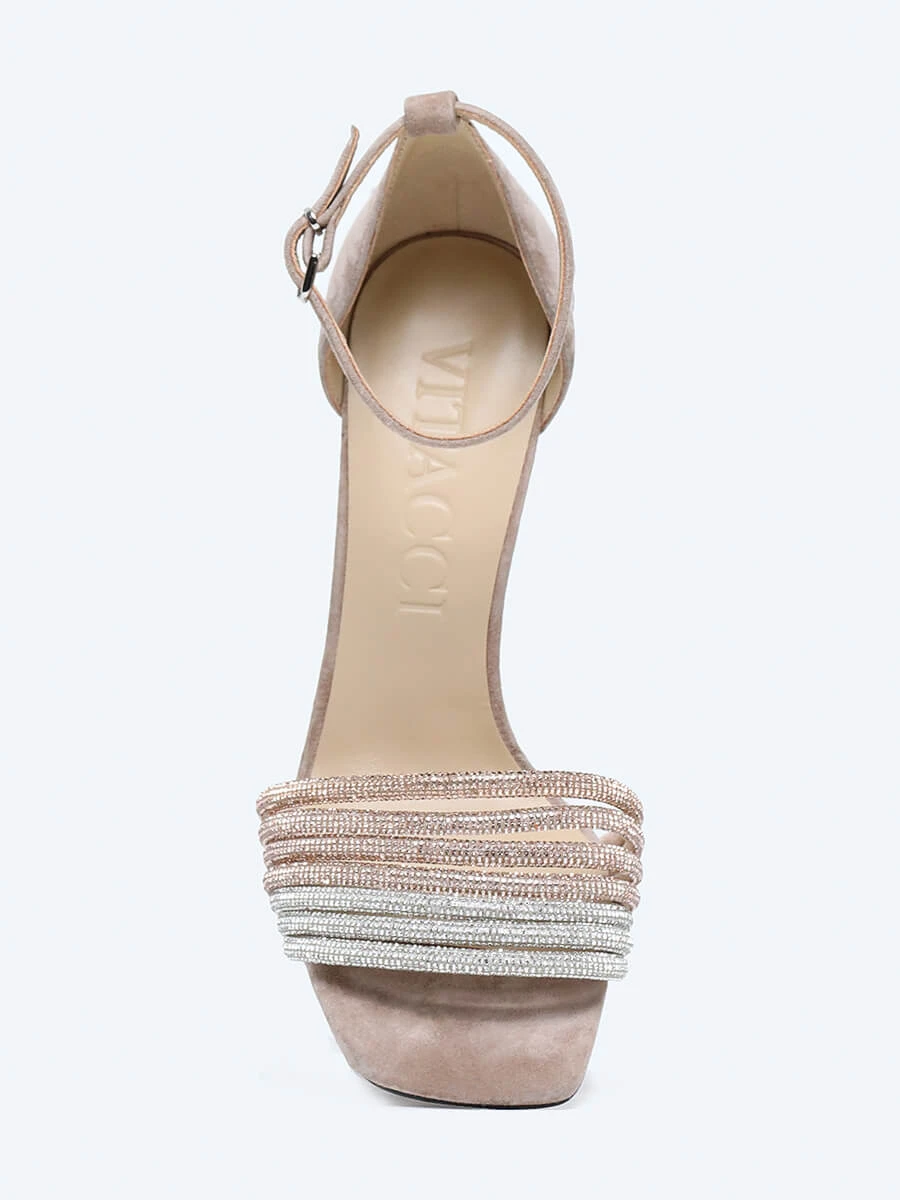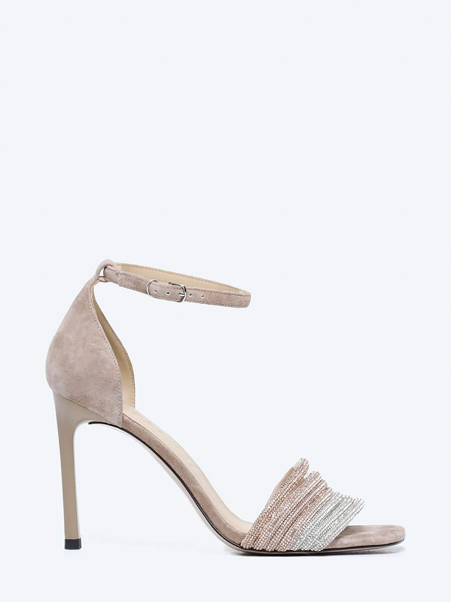 Босоножки из натурального велюра, усыпанного стразами. Модель с каблуком-шпилькой и закрытой пяткой идеально подходит не только для свадебного торжества, но и для повседневного элегантного образа.