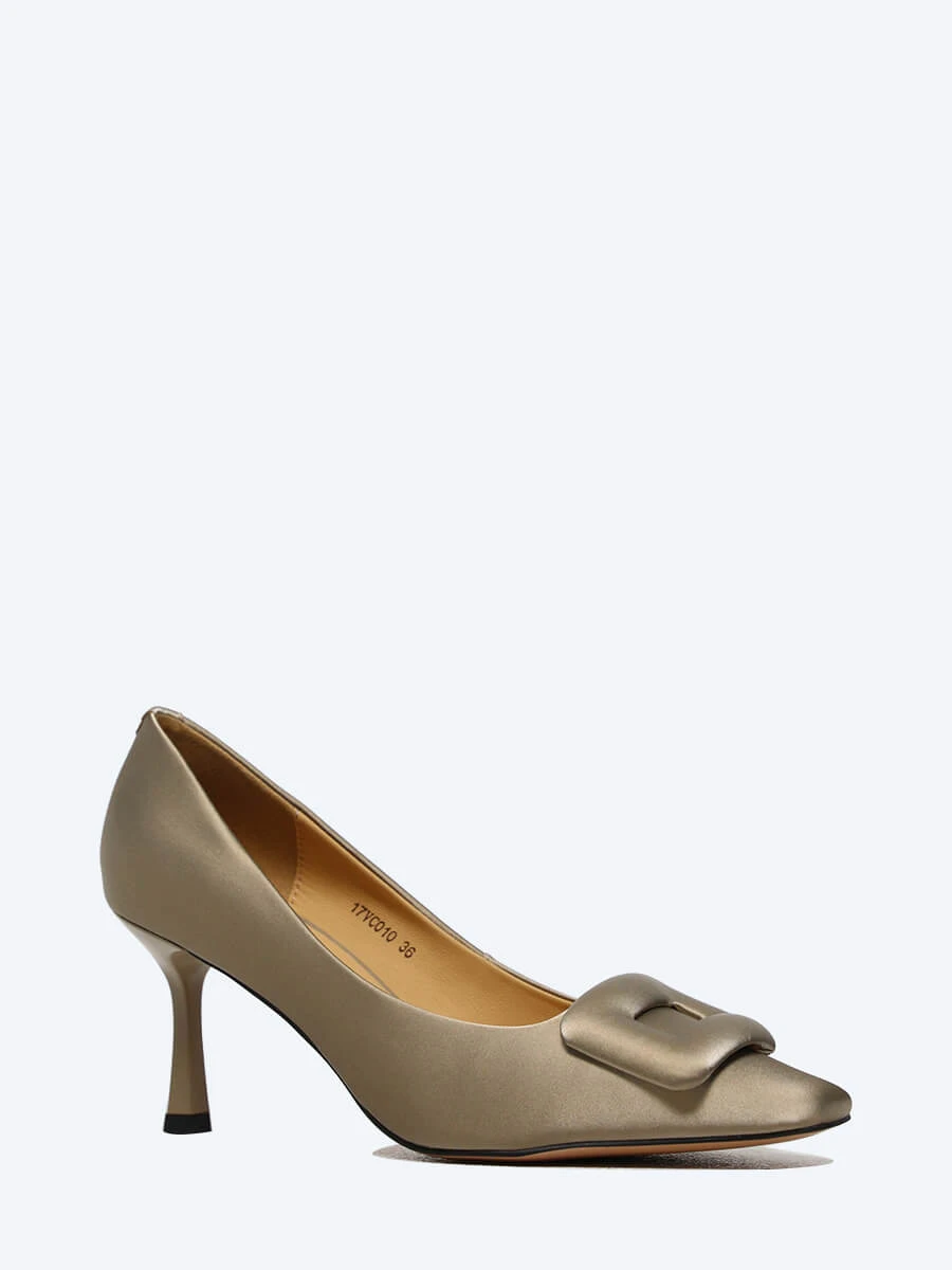 Туфли-лодочки выполнены из натуральной кожи. Особенности модели: квадратный носок с декор в виде пряжки, каблук-рюмочка средней высоты.