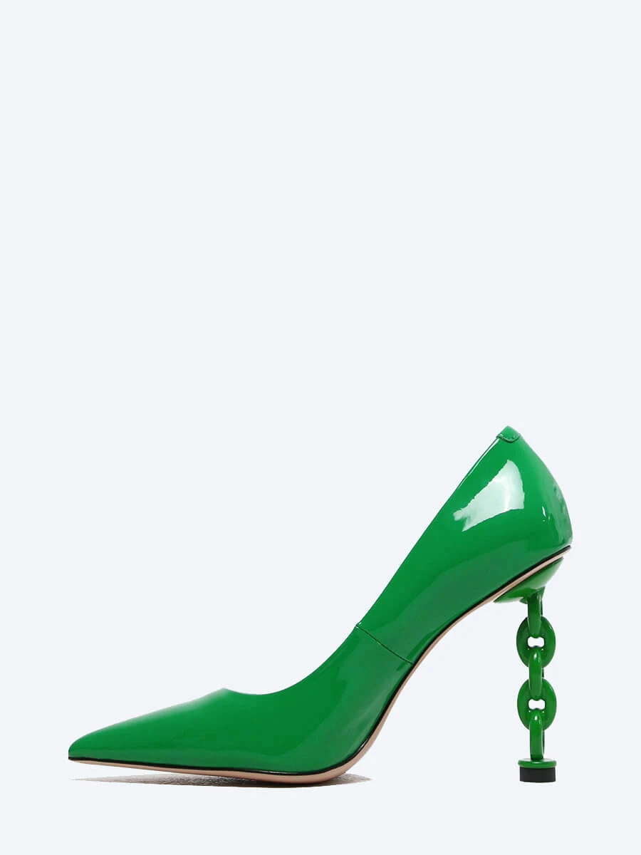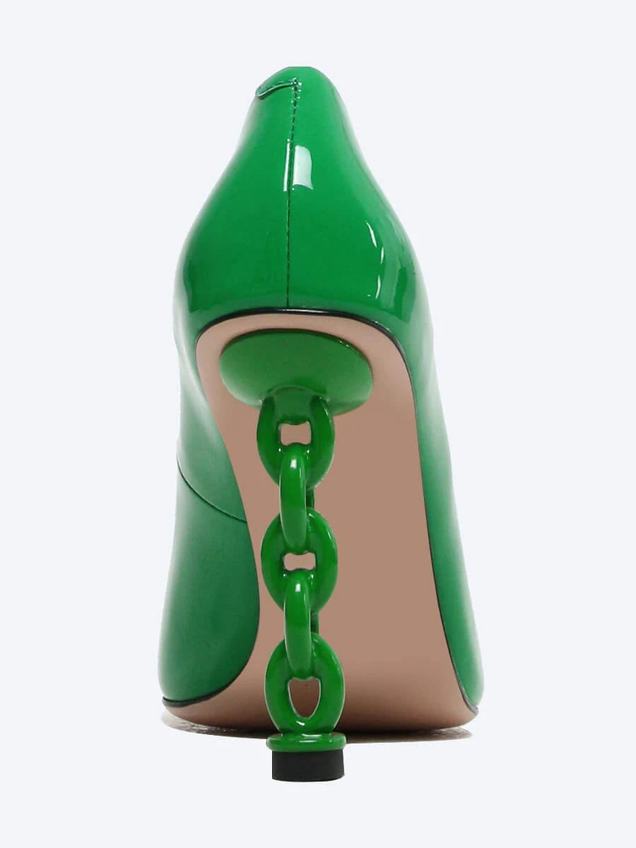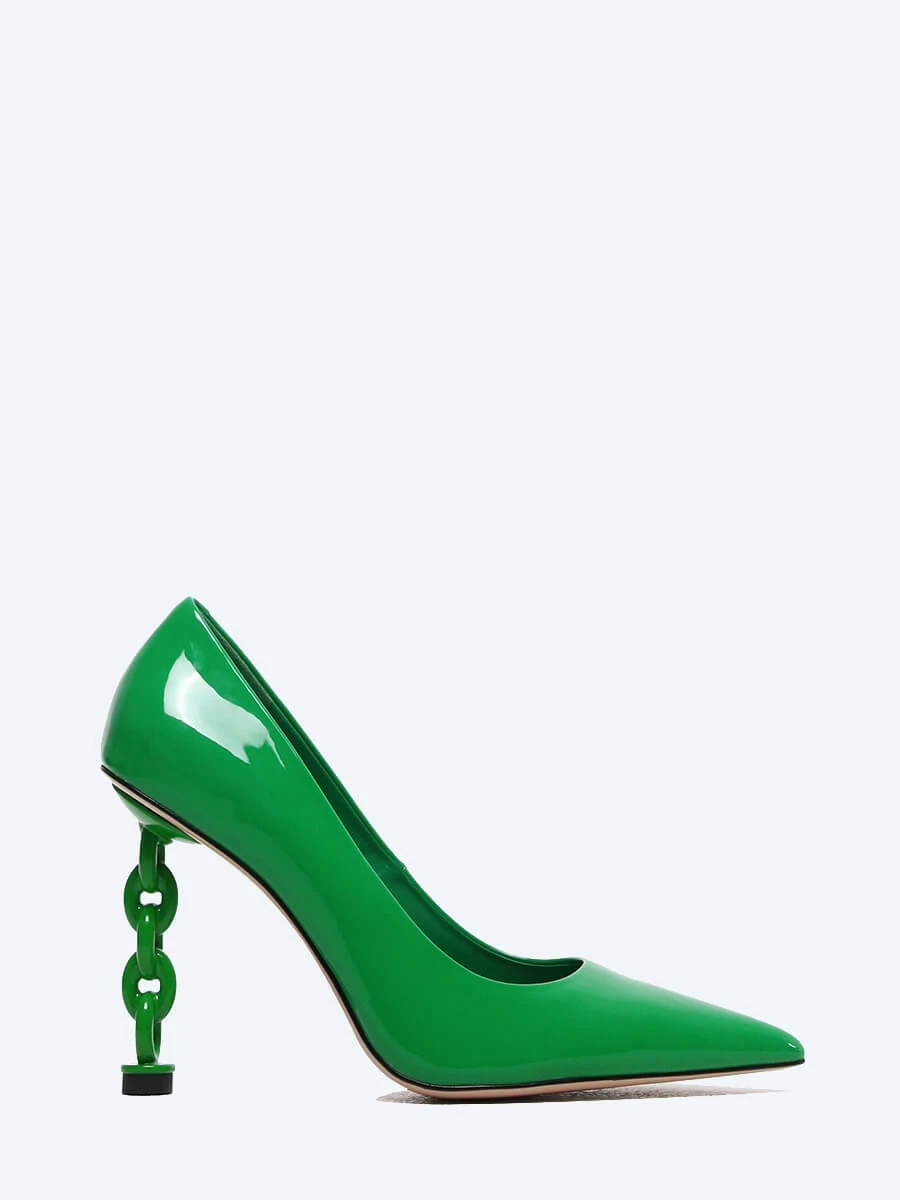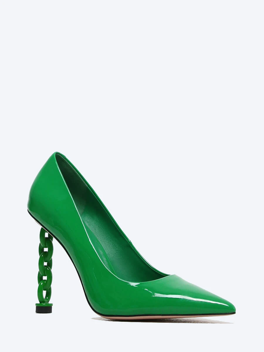 Туфли-лодочки выполнены из натуральной лаковой кожи. Особенности модели: острый носок, высокий фигурный каблук.