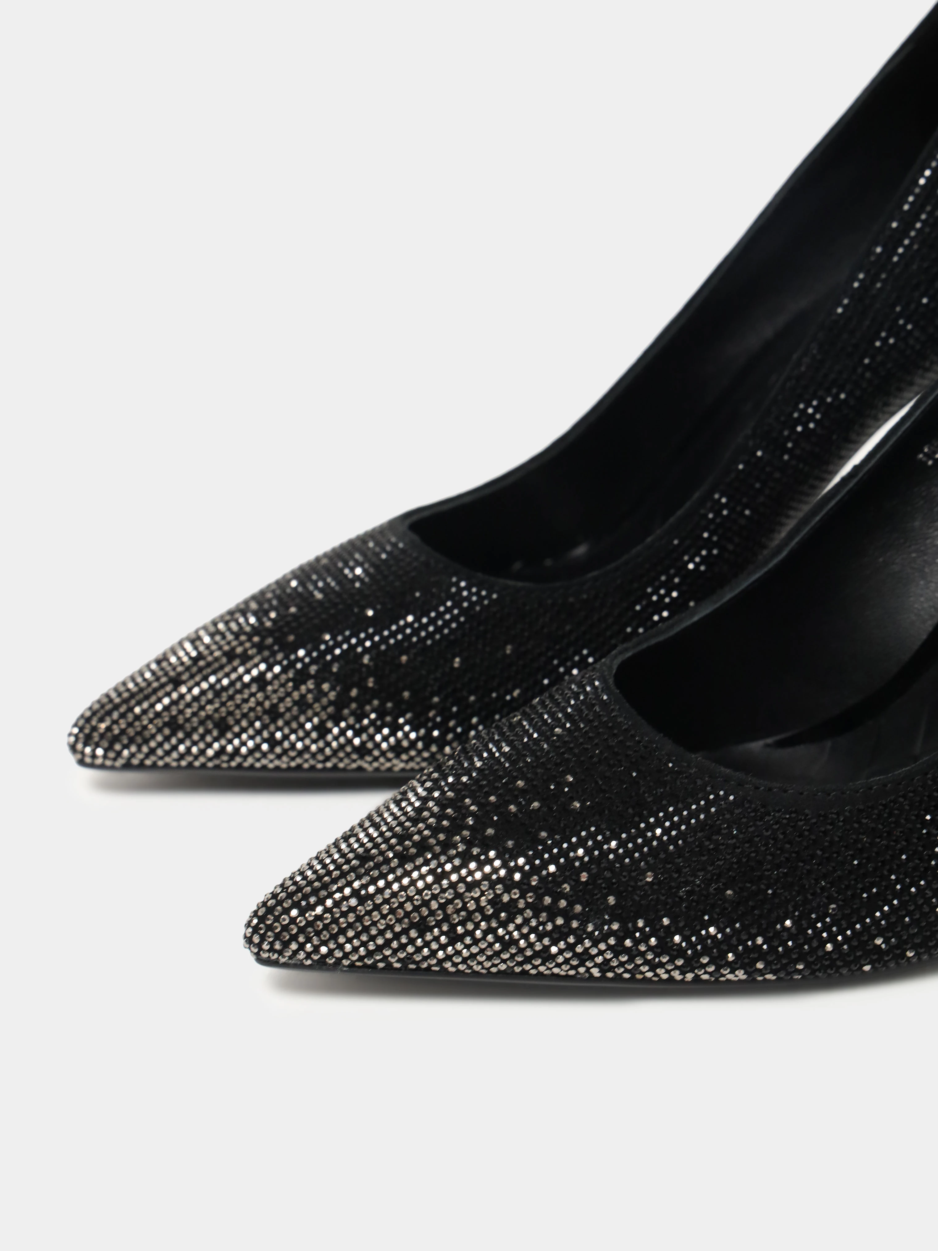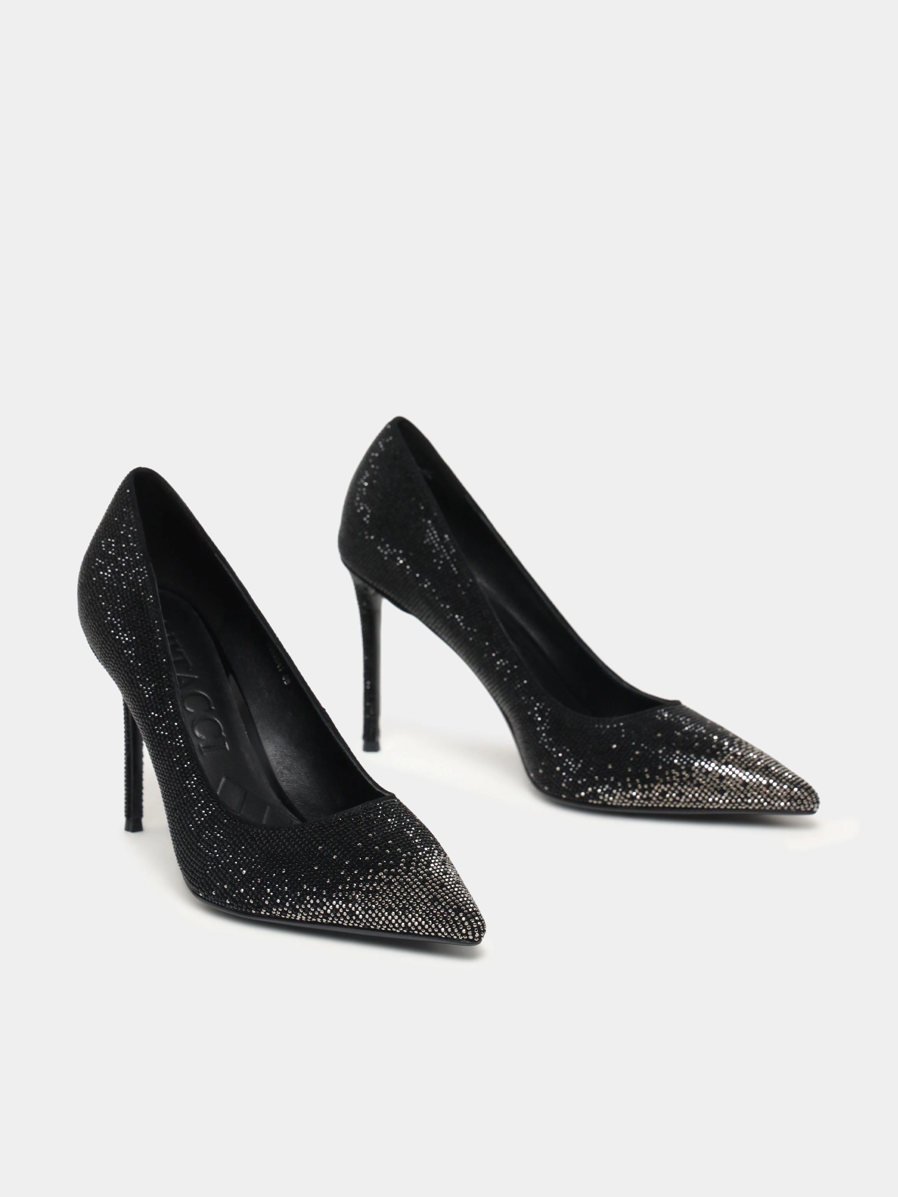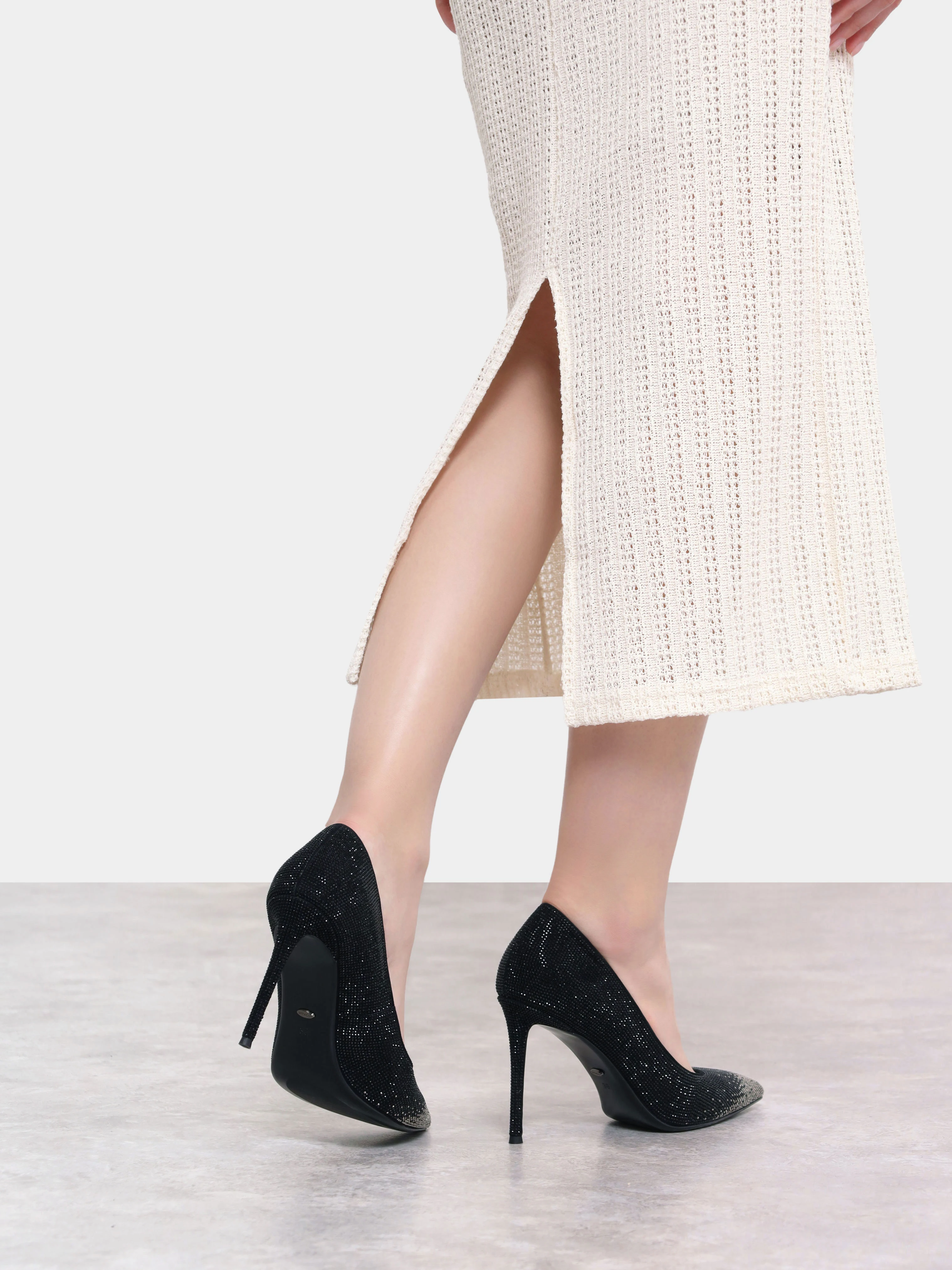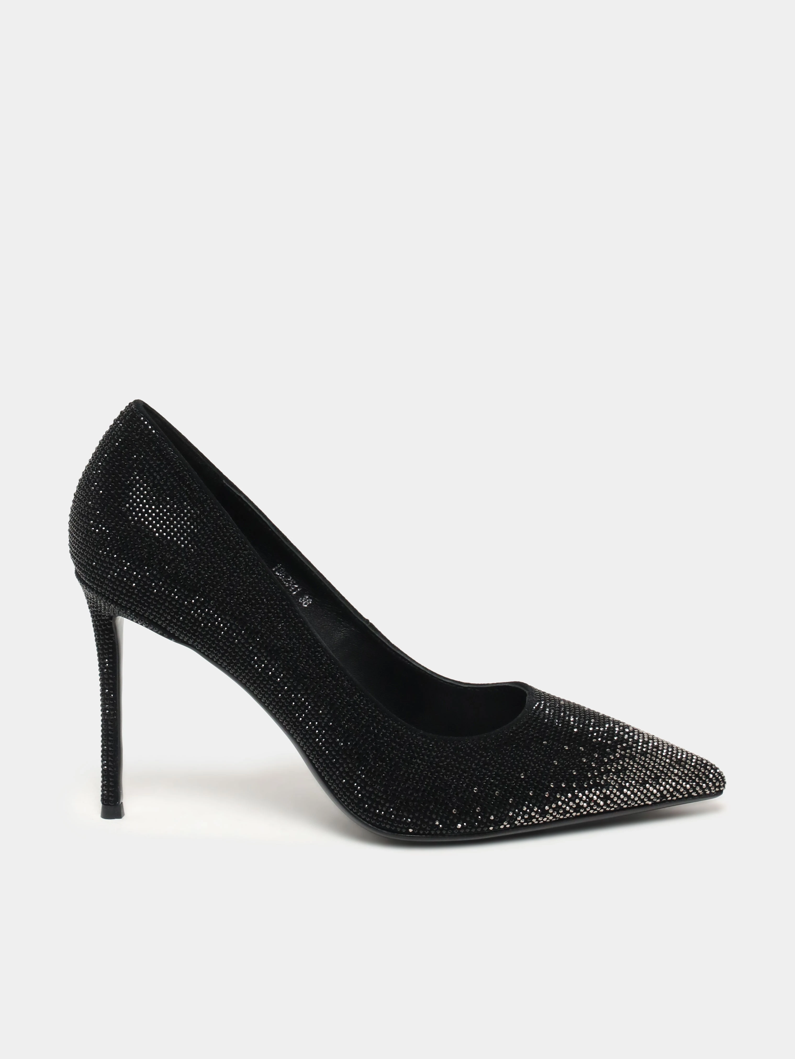 Туфли-лодочки выполнены из натурального велюра, усыпанного стразами. Стелька из натуральной кожи. Особенности модели: острый носок, высокий каблук-шпилька.