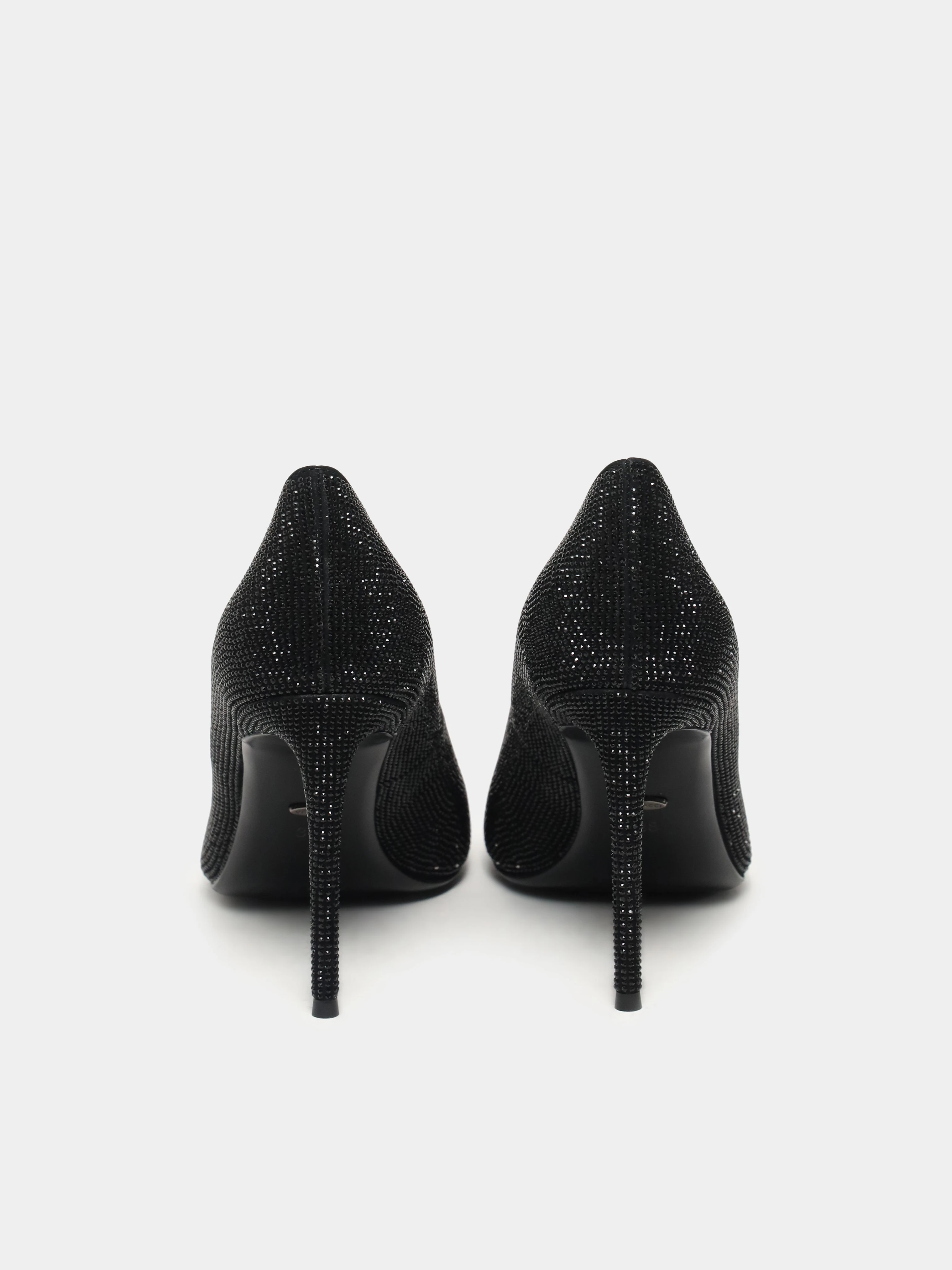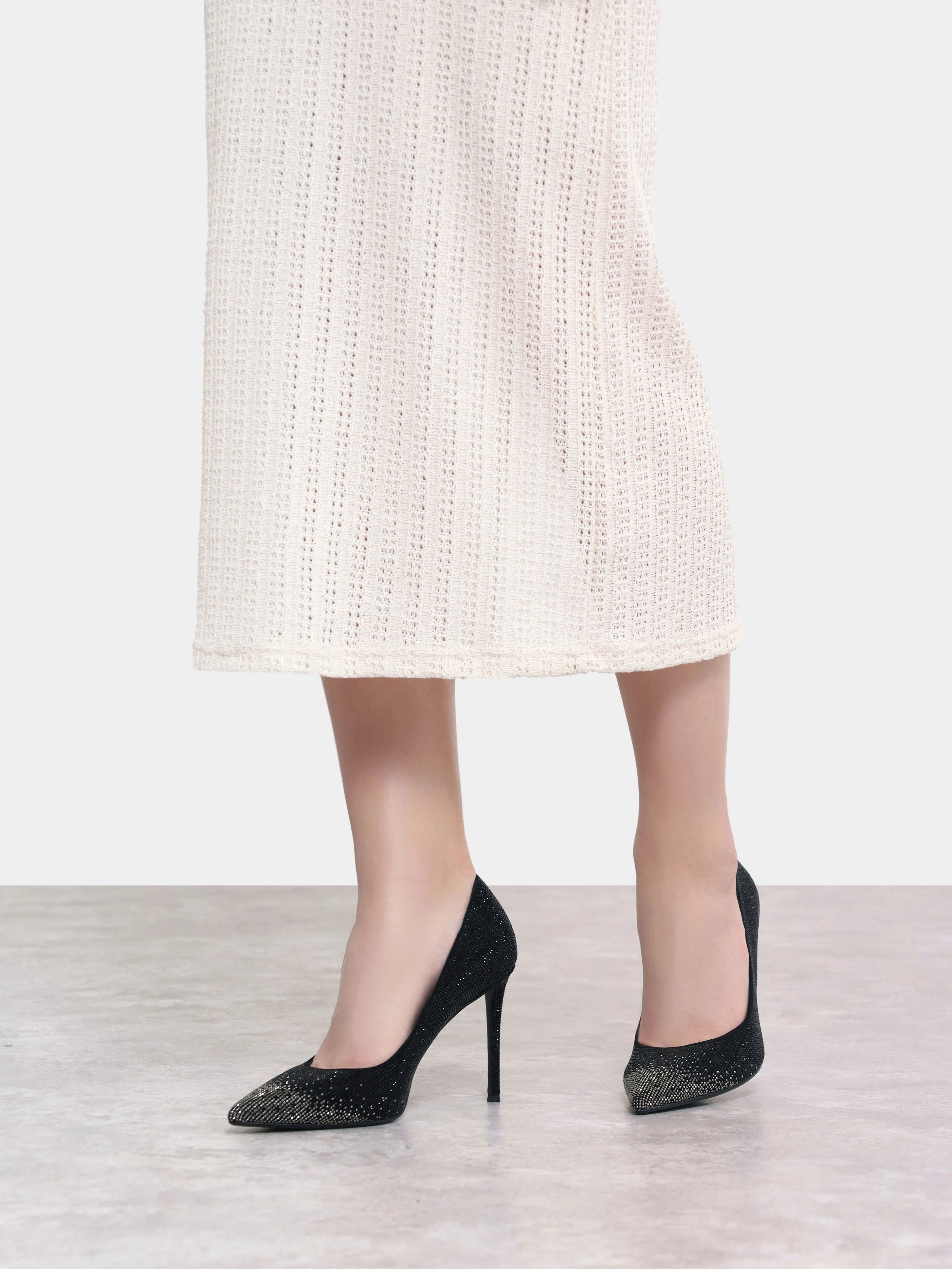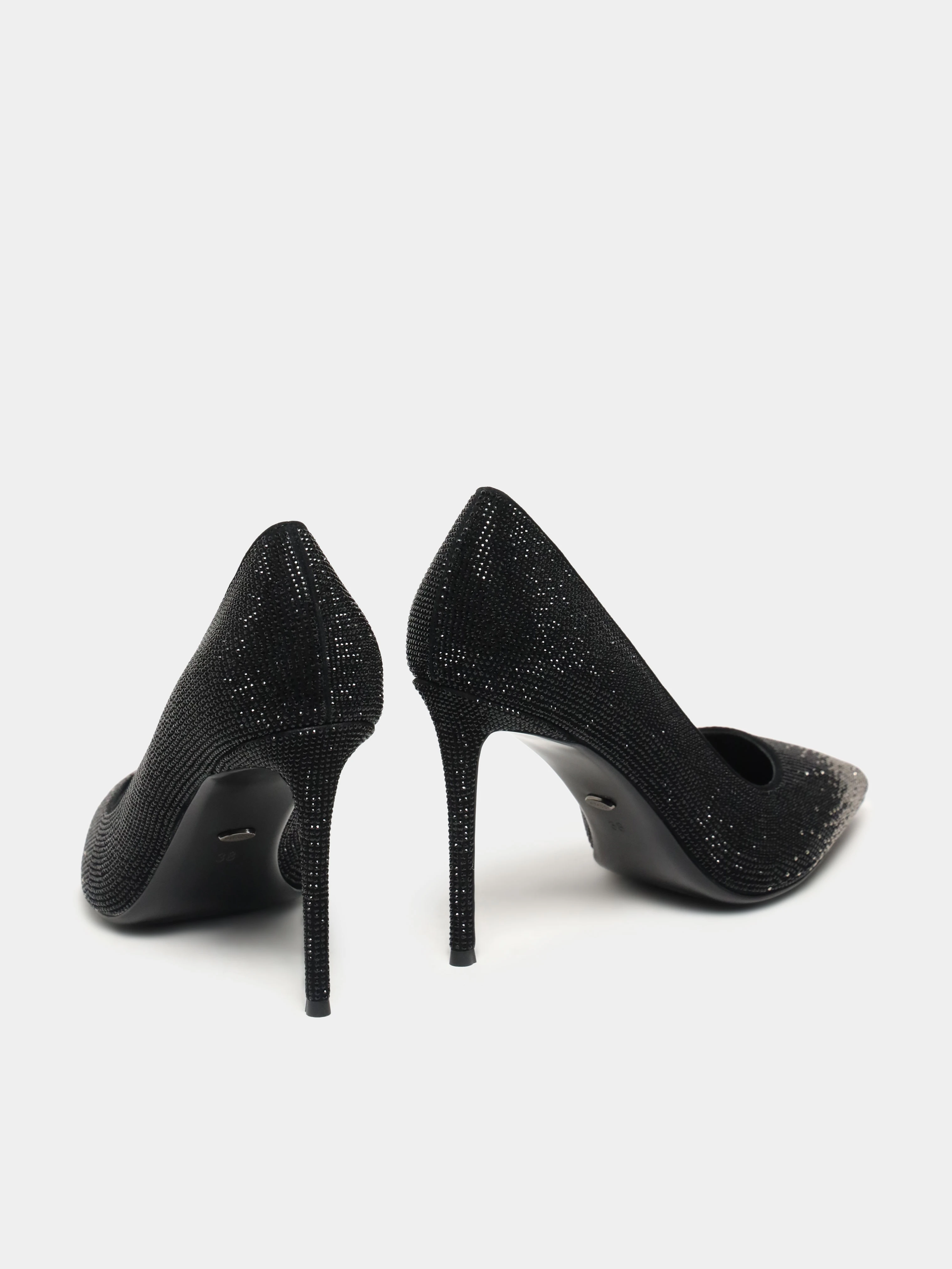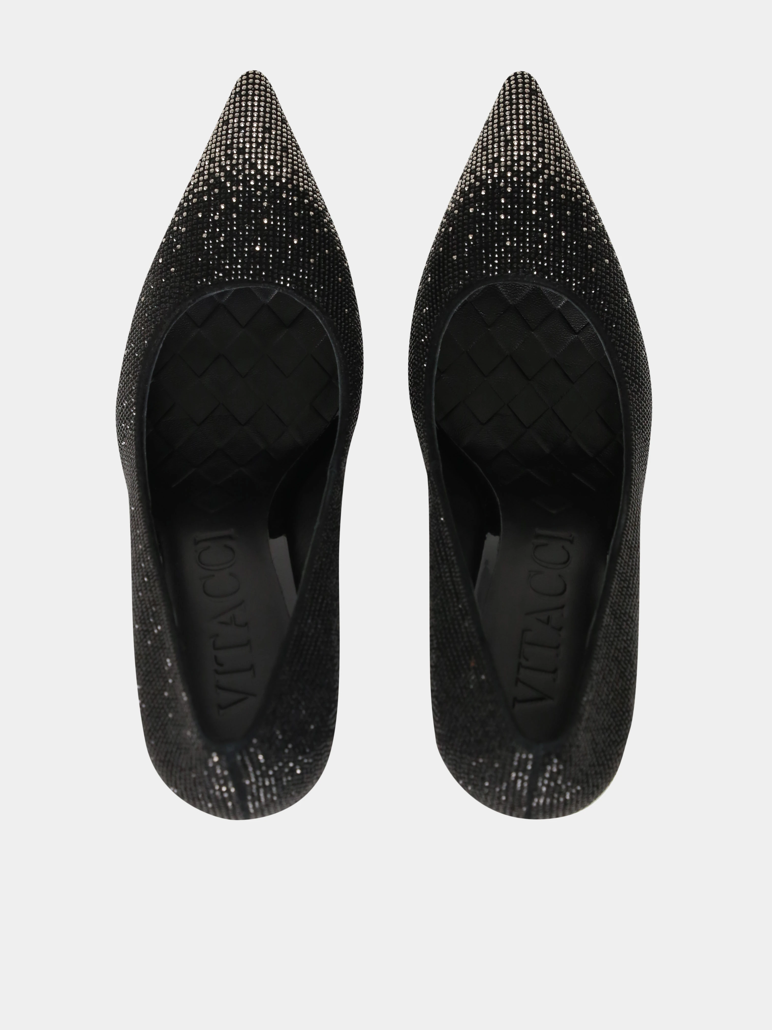 Туфли-лодочки выполнены из натурального велюра, усыпанного стразами. Стелька из натуральной кожи. Особенности модели: острый носок, высокий каблук-шпилька.