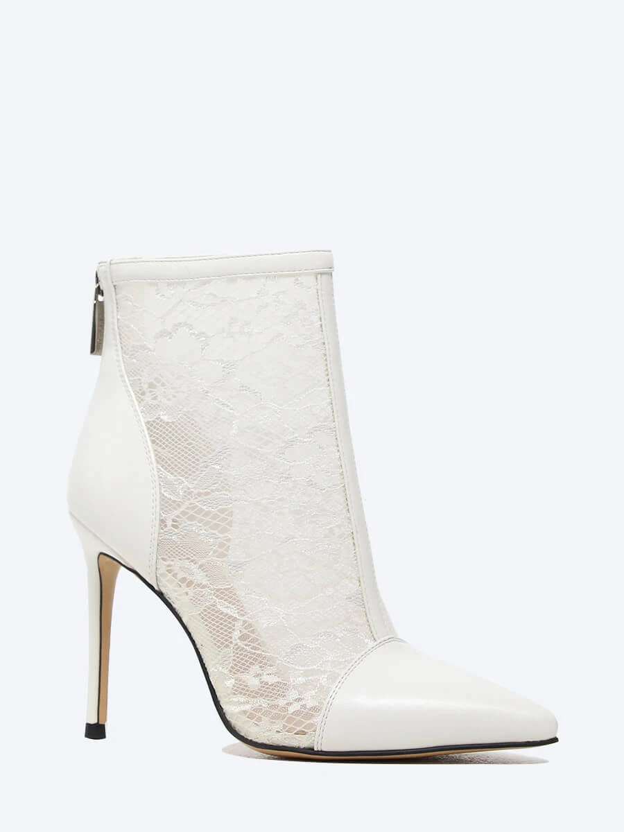 Ботильоны выполнены из текстиля со вставками искусственной кожи (носок и пятка). Особенности модели: наличие молнии, острый носок, каблук-шпилька.