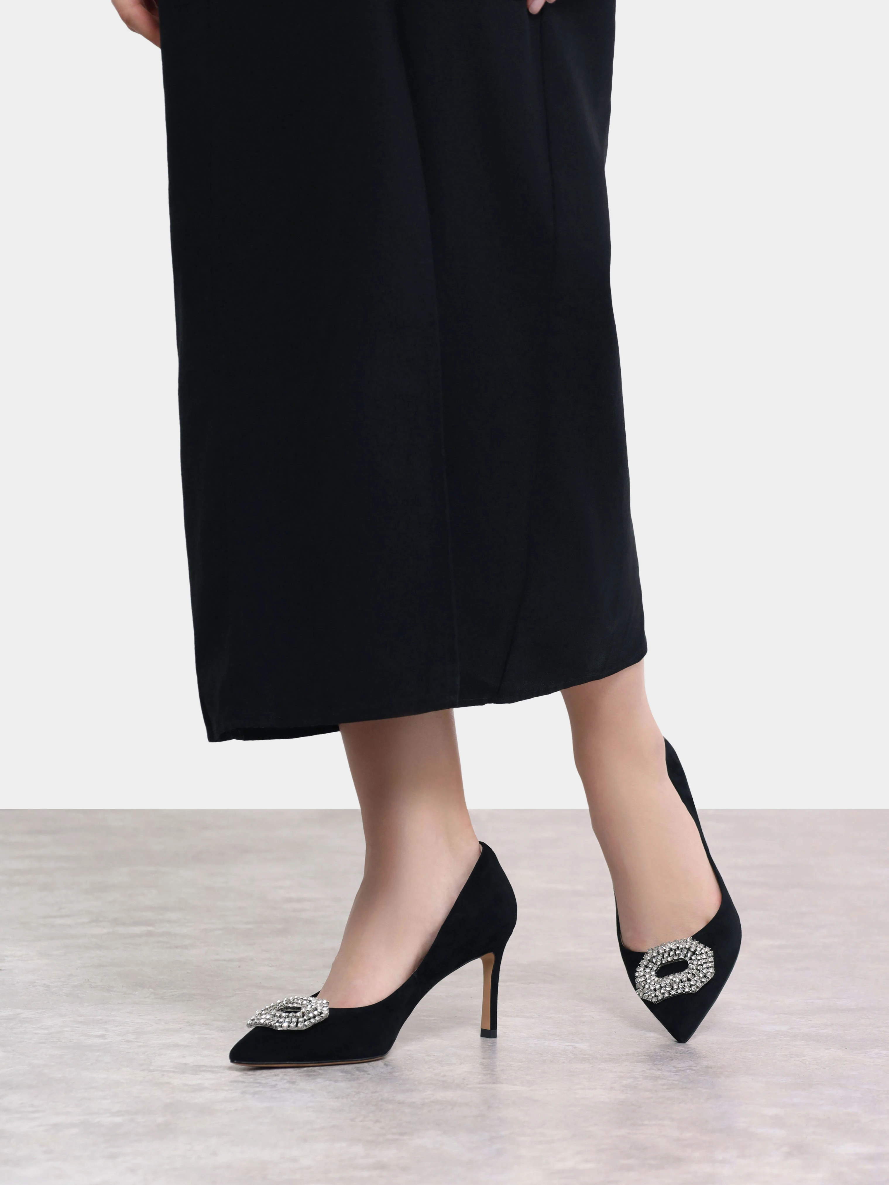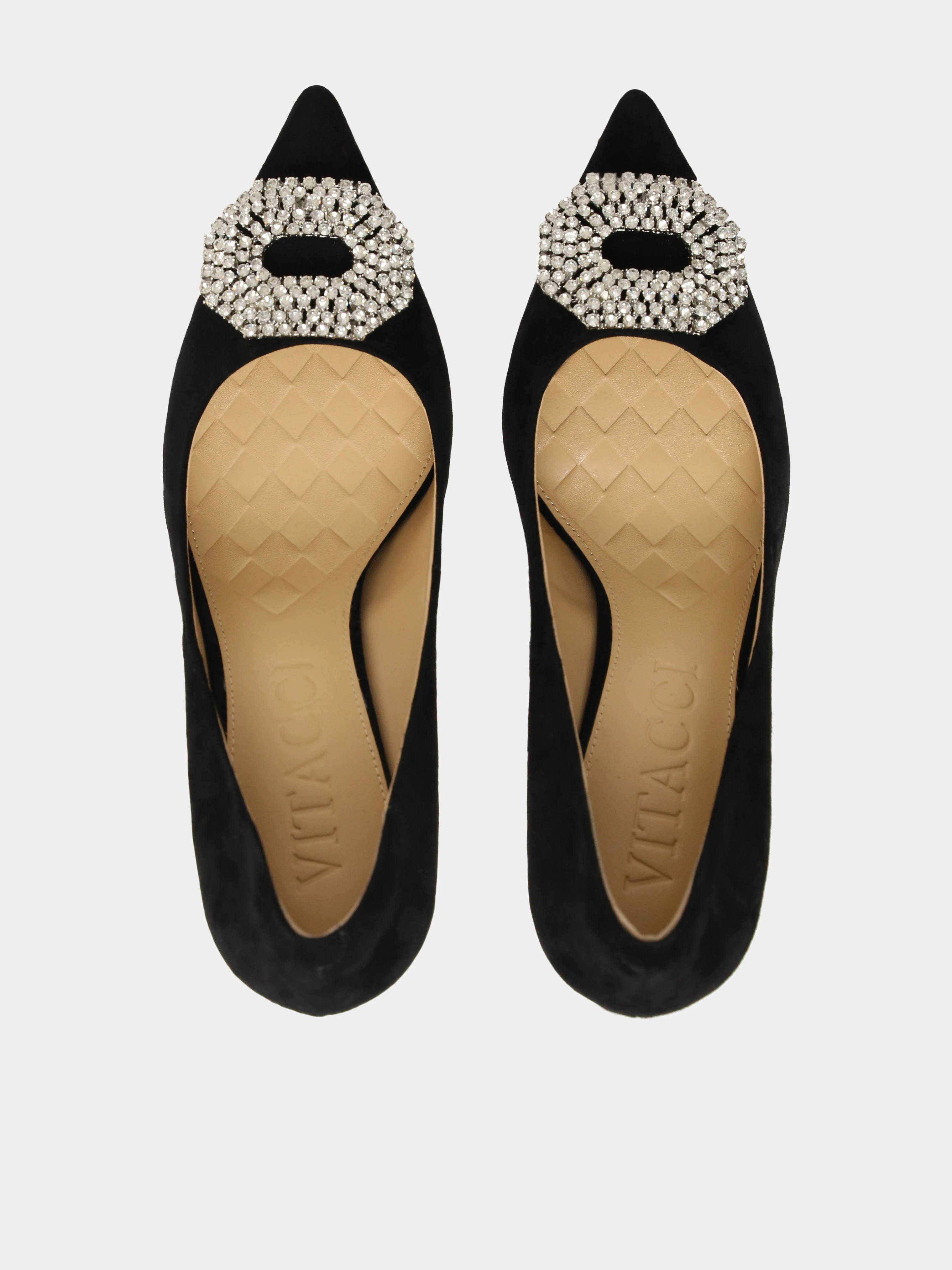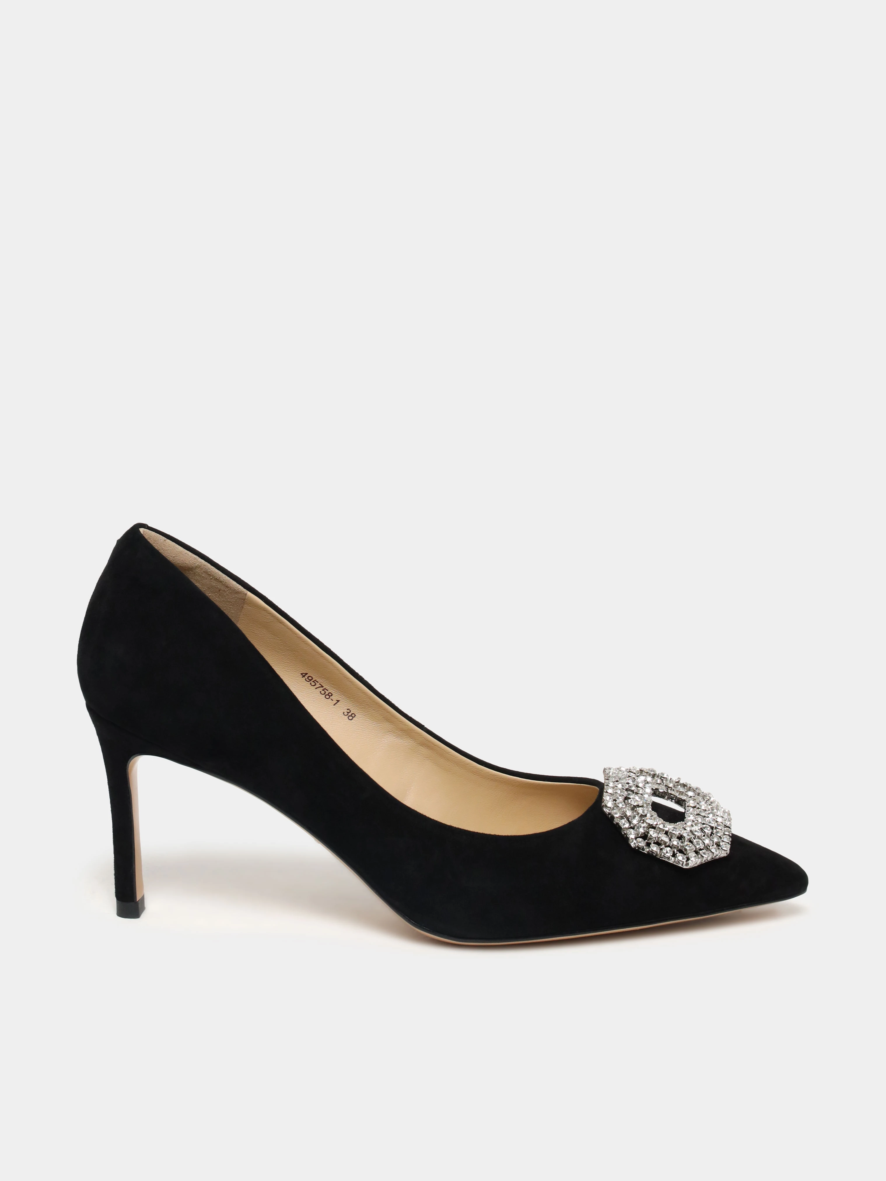 Туфли-лодочки выполнены из натурального велюра. Стелька из натуральной кожи. Особенности модели: острый носок с декором, каблук-шпилька средней высоты.
