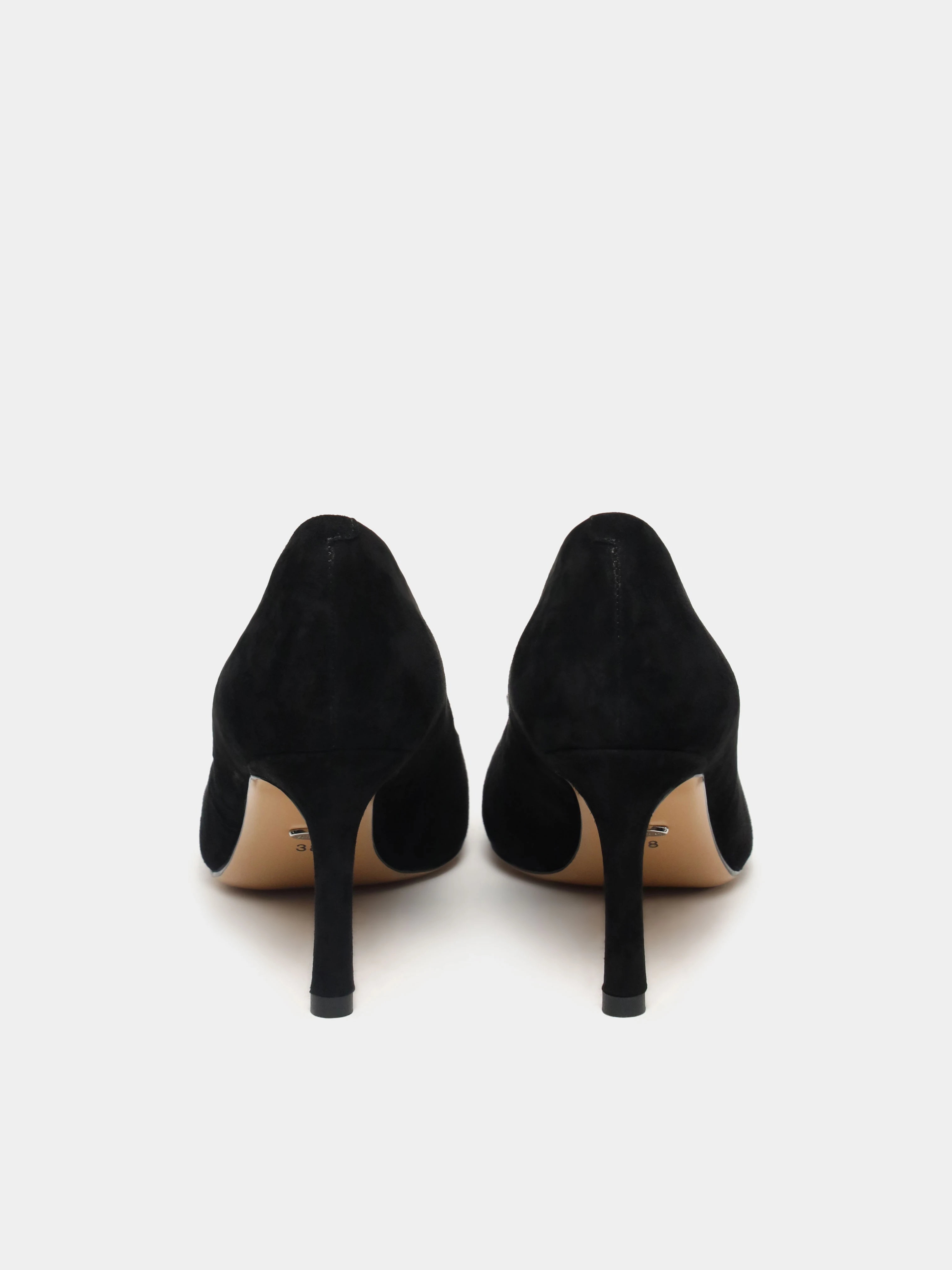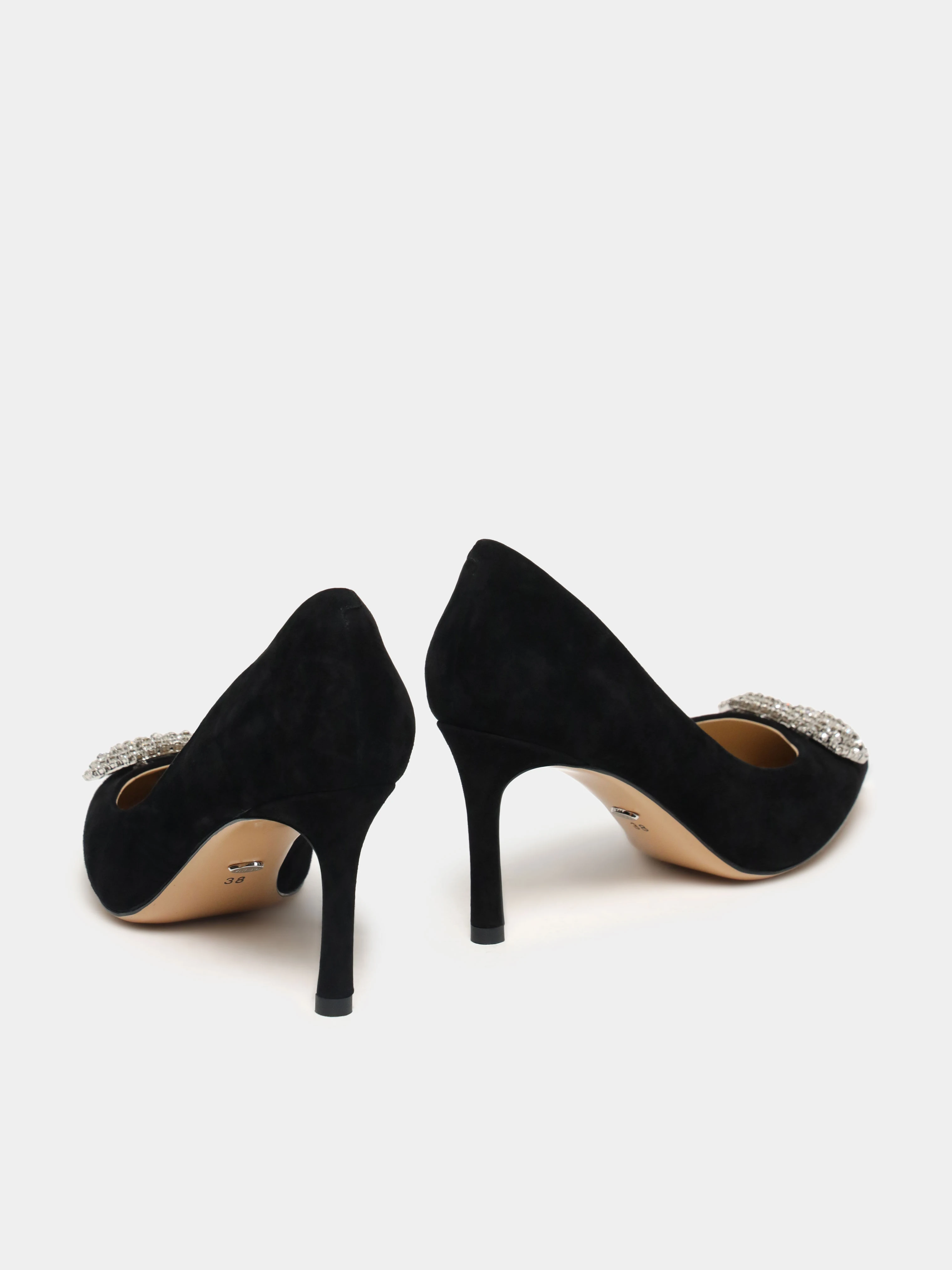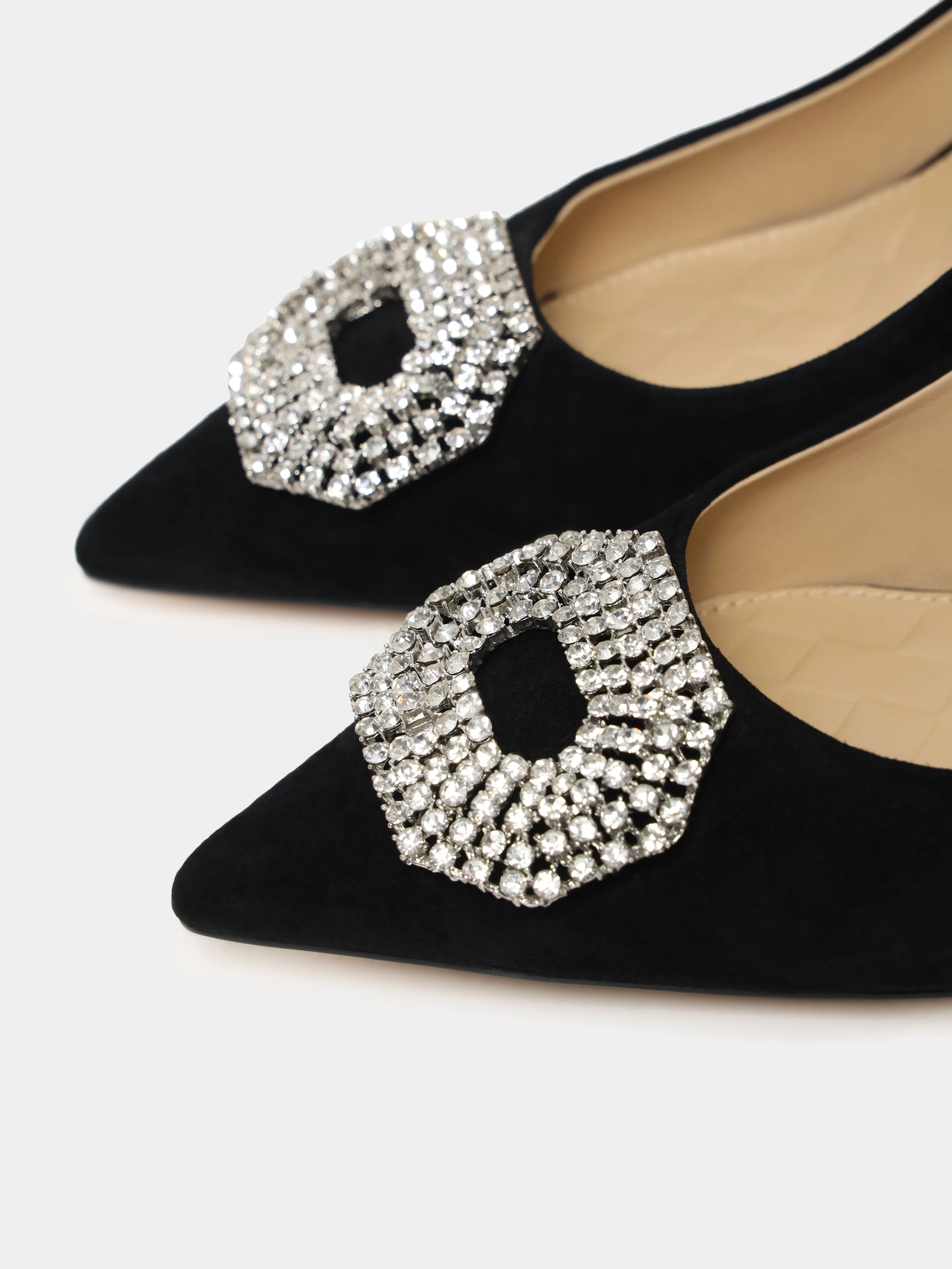 Туфли-лодочки выполнены из натурального велюра. Стелька из натуральной кожи. Особенности модели: острый носок с декором, каблук-шпилька средней высоты.