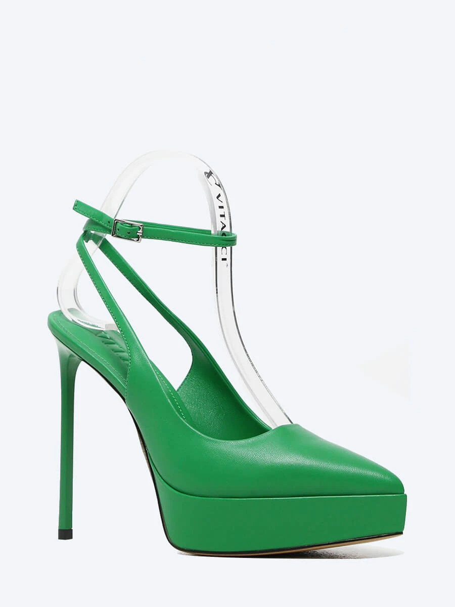 Туфли с открытой пяткой выполнены из натуральной кожи. Особенности модели: платформа и каблук-шпилька, заостренный носок, ремешок на щиколотке.