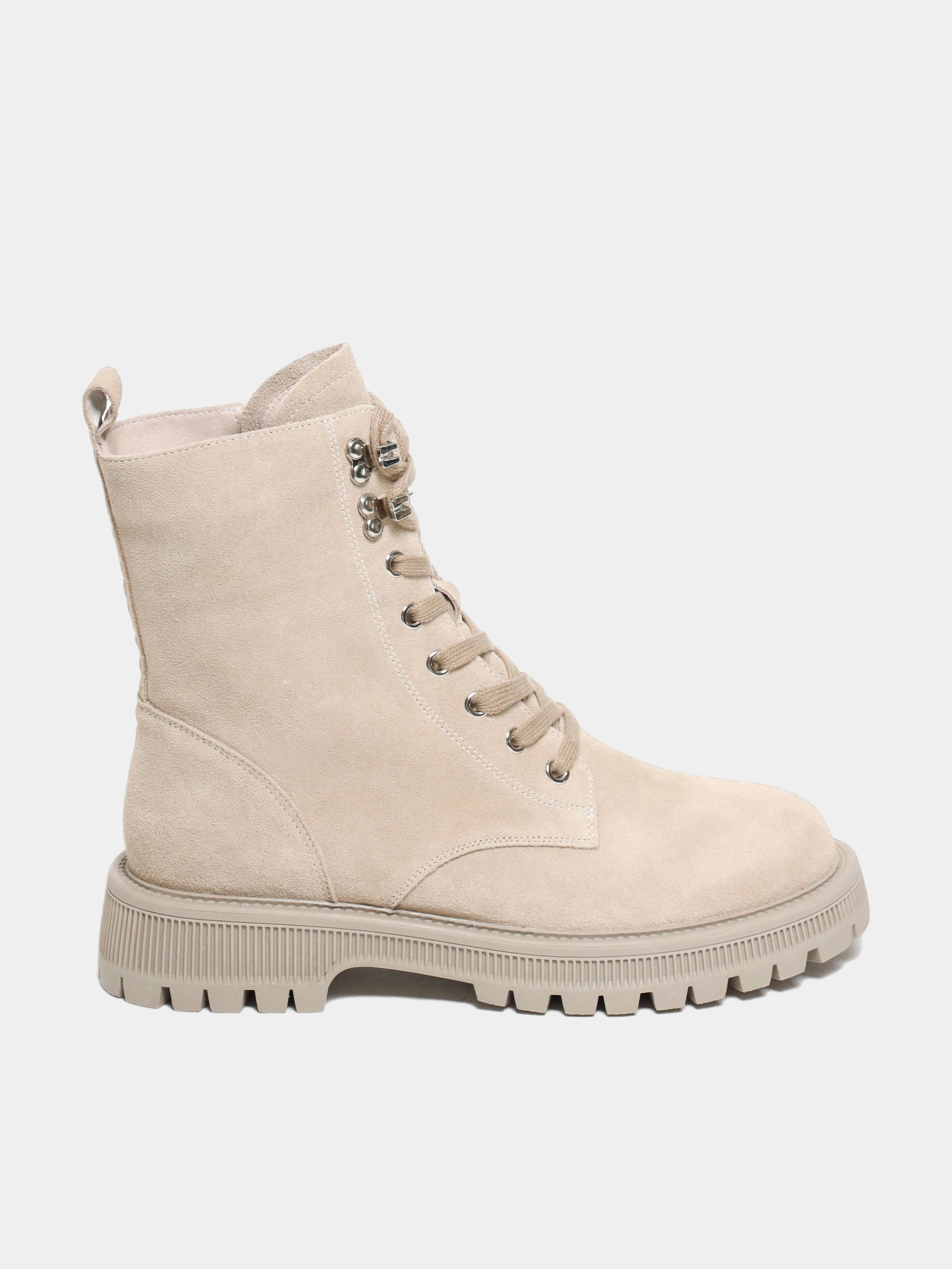 Ботинки из натурального спилка. Внутри подкладка и стелька из натуральной кожи. Особенности дизайна: круглый носок, широкий низкий каблук, шнуровка.