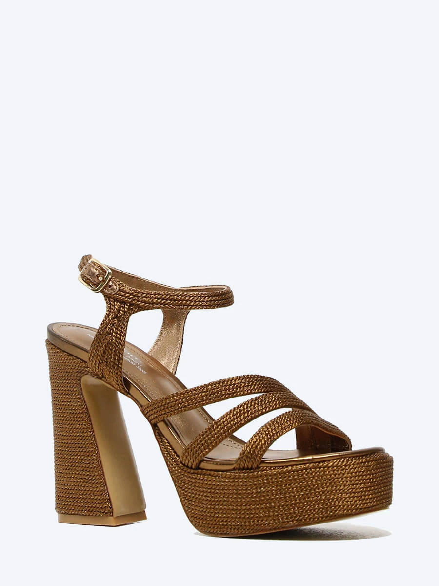 Босоножки выполнены из текстиля с фактурой "плетёнка". Особенности модели: платформа и широкий каблук, стелька из натуральной кожи, Т-образный ремешок.