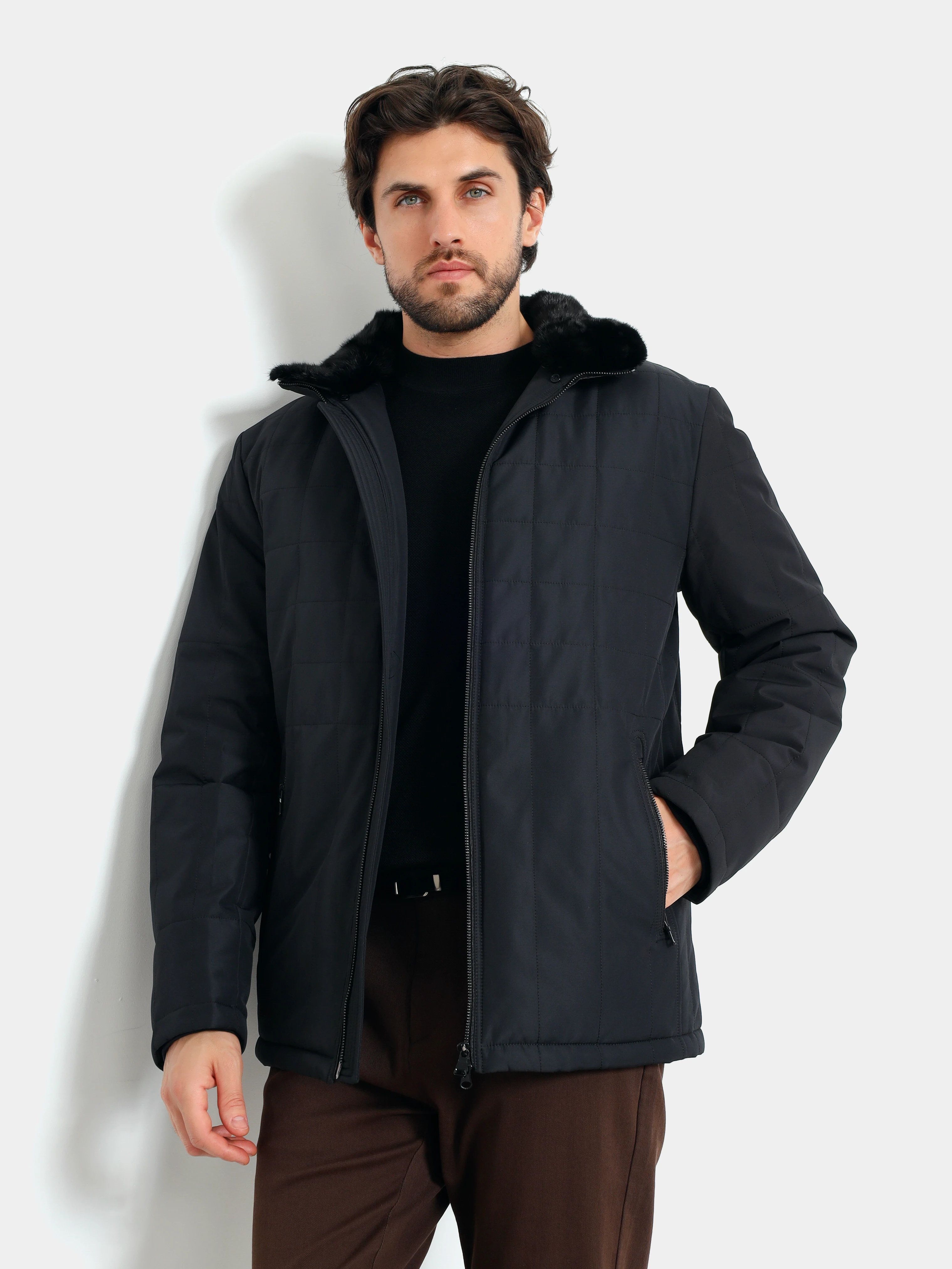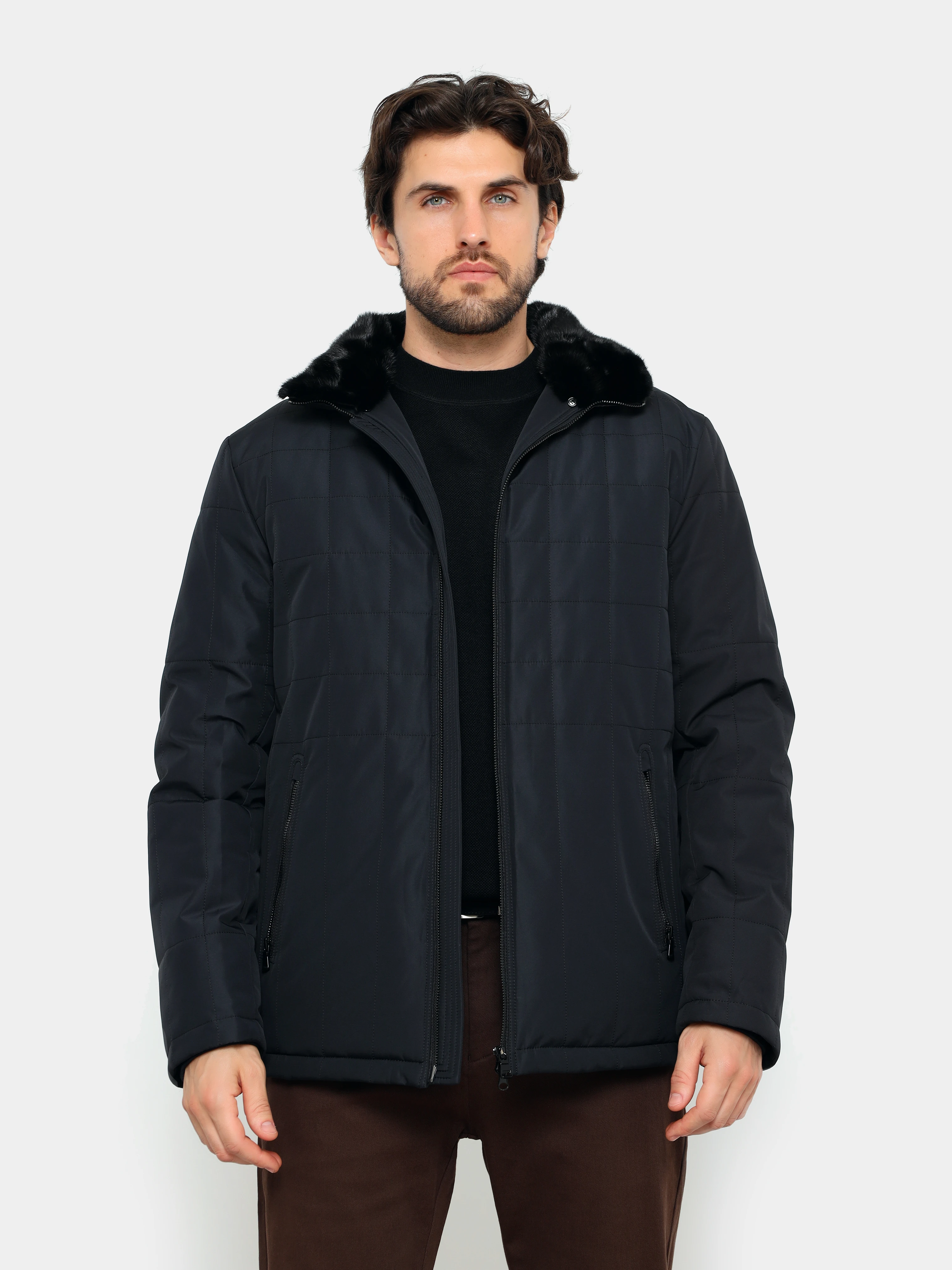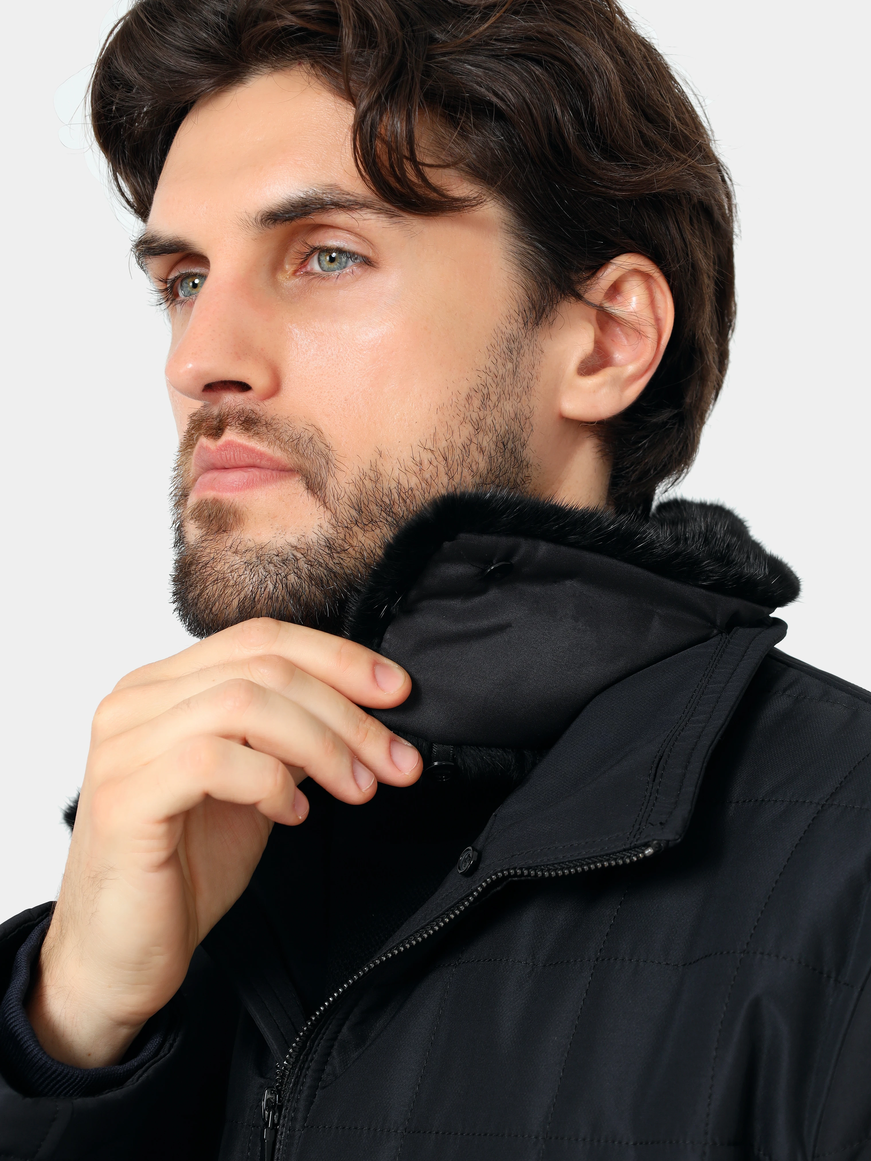 Мужская зимняя куртка выполнена из полиэстера. Материал верха является водонепроницаемым, но дышащим – пропускает воздух для правильного теплообмена зимой. Куртка застегивается на двойную молнию. Высокая горловина оснащена съемным внутренним воротником, выполненным из натурального меха норки. Снаружи куртки имеются боковые карманы на молнии, внутри – два потайных нагрудных кармана на молнии. Рукава выполнены с манжетами на резинках для сохранения тепла.