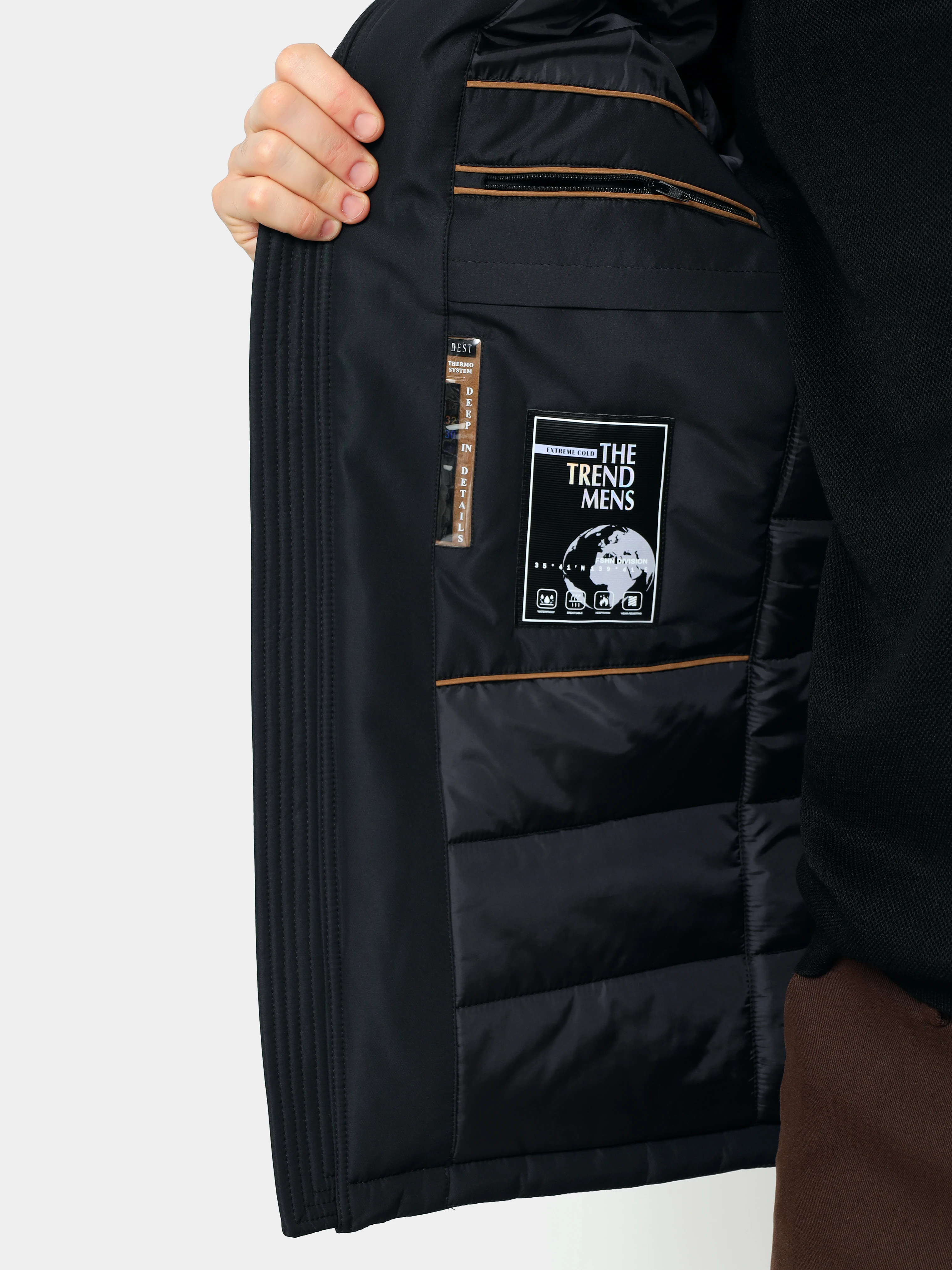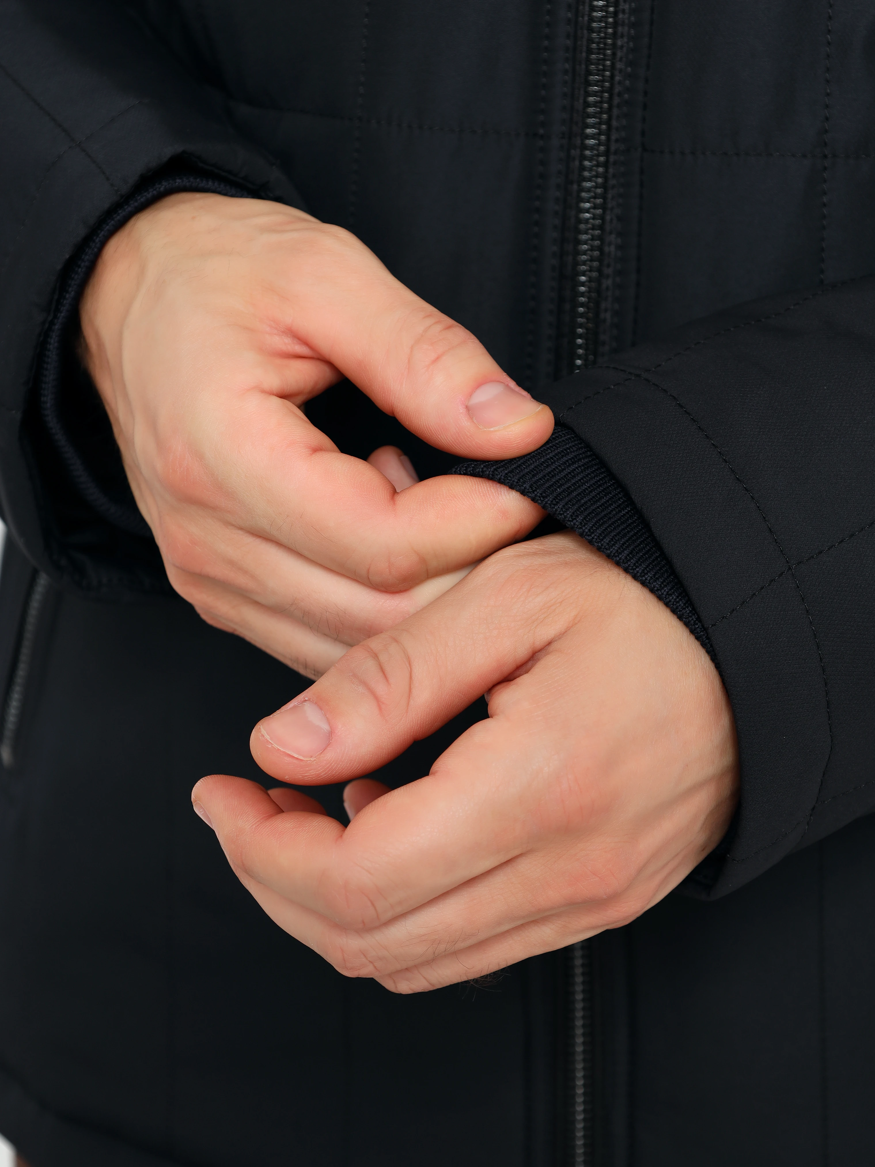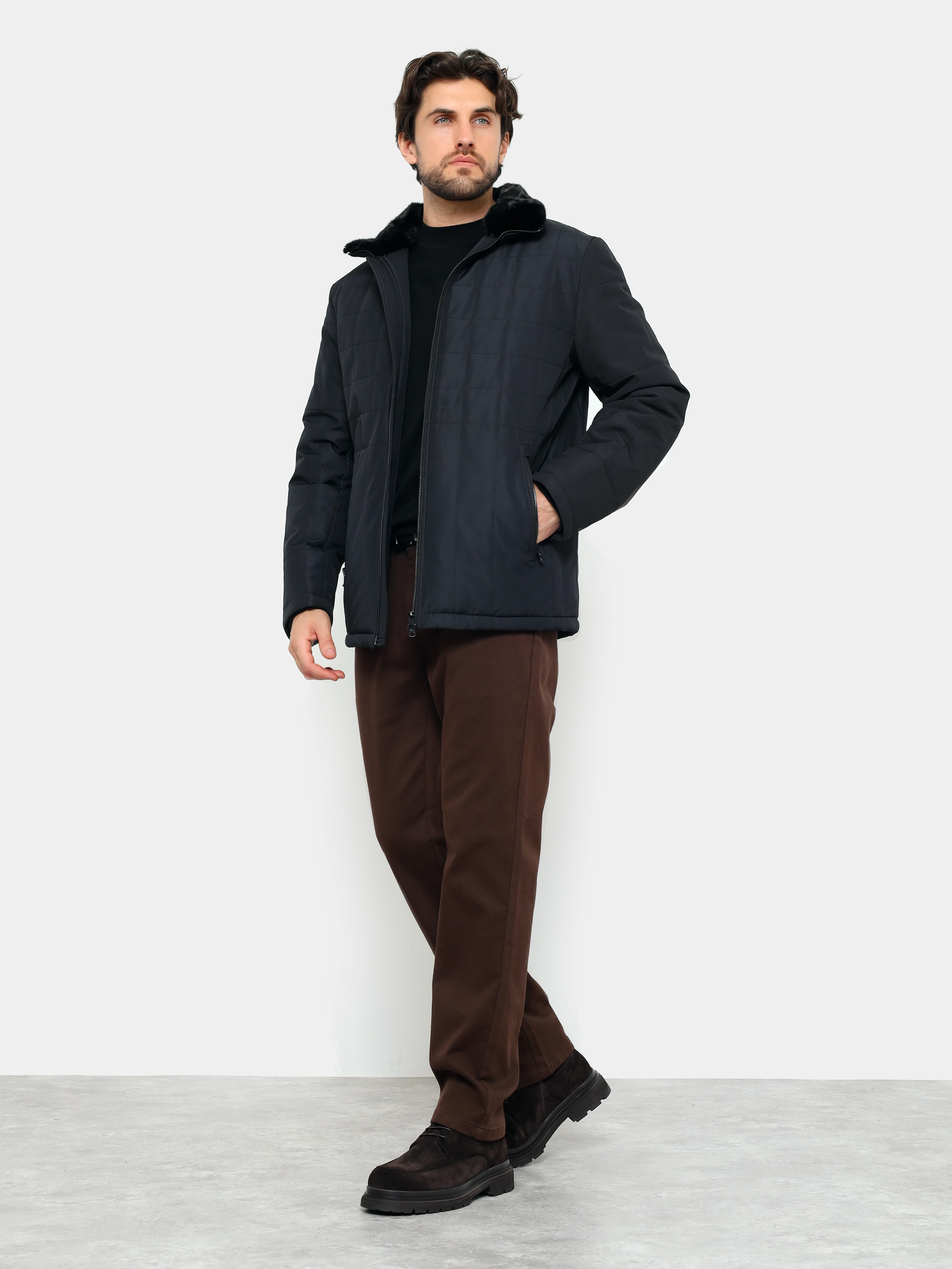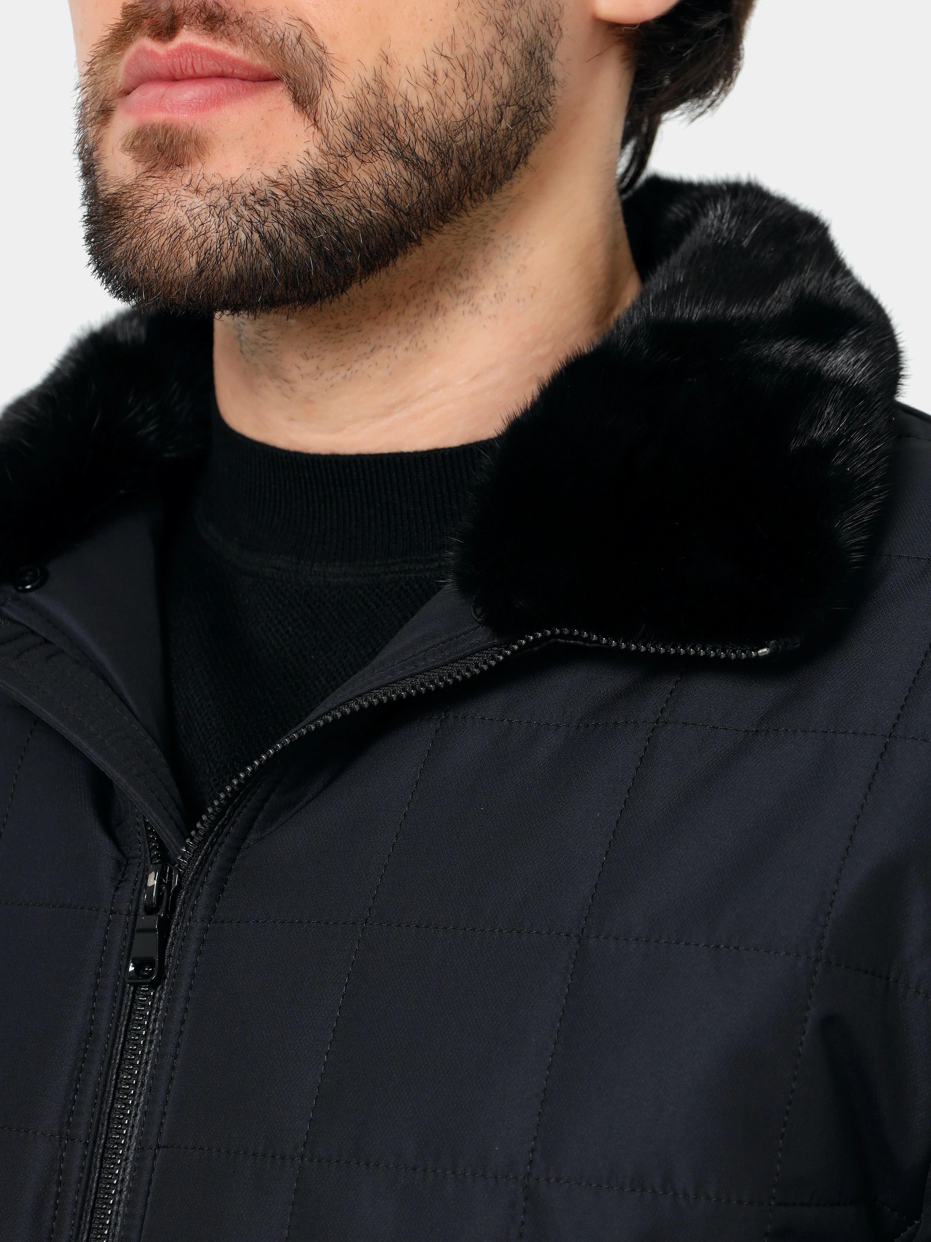 Мужская зимняя куртка выполнена из полиэстера. Материал верха является водонепроницаемым, но дышащим – пропускает воздух для правильного теплообмена зимой. Куртка застегивается на двойную молнию. Высокая горловина оснащена съемным внутренним воротником, выполненным из натурального меха норки. Снаружи куртки имеются боковые карманы на молнии, внутри – два потайных нагрудных кармана на молнии. Рукава выполнены с манжетами на резинках для сохранения тепла.