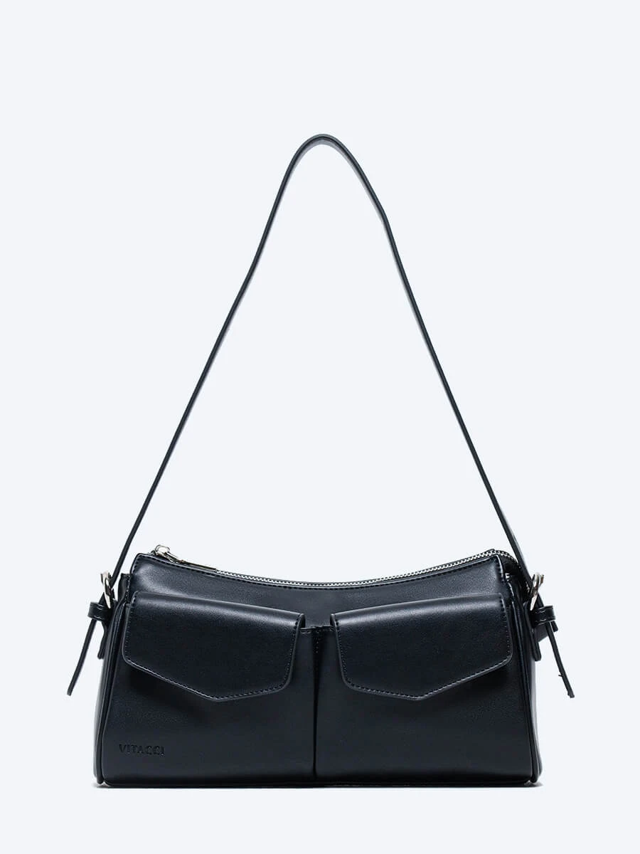 Женская сумка закрывается на молнию. Спереди два кармана, закрывающихся на кнопку. Внутри один отдел с двумя карманами.