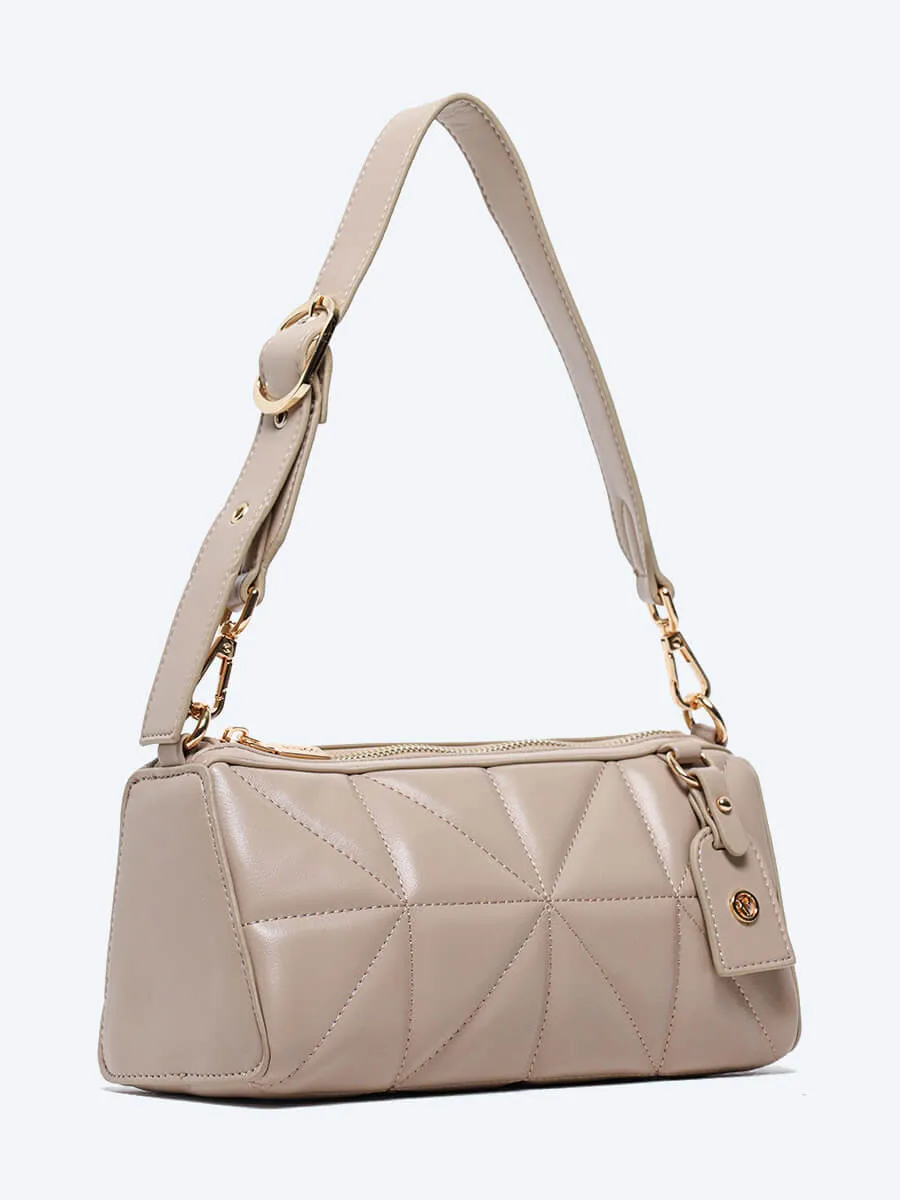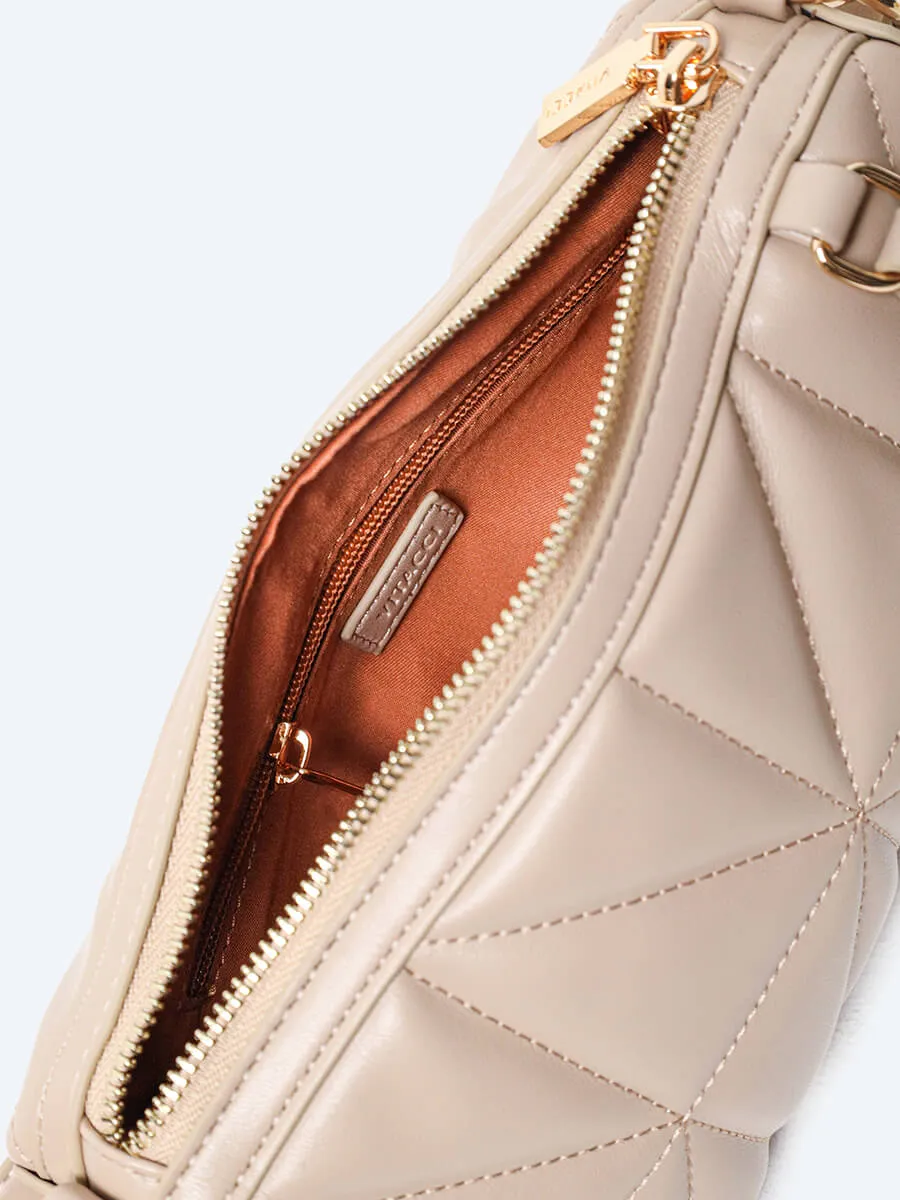 Женская сумка закрывается на молнию. Внутри сумки два кармана для мелочей и карман на молнии.