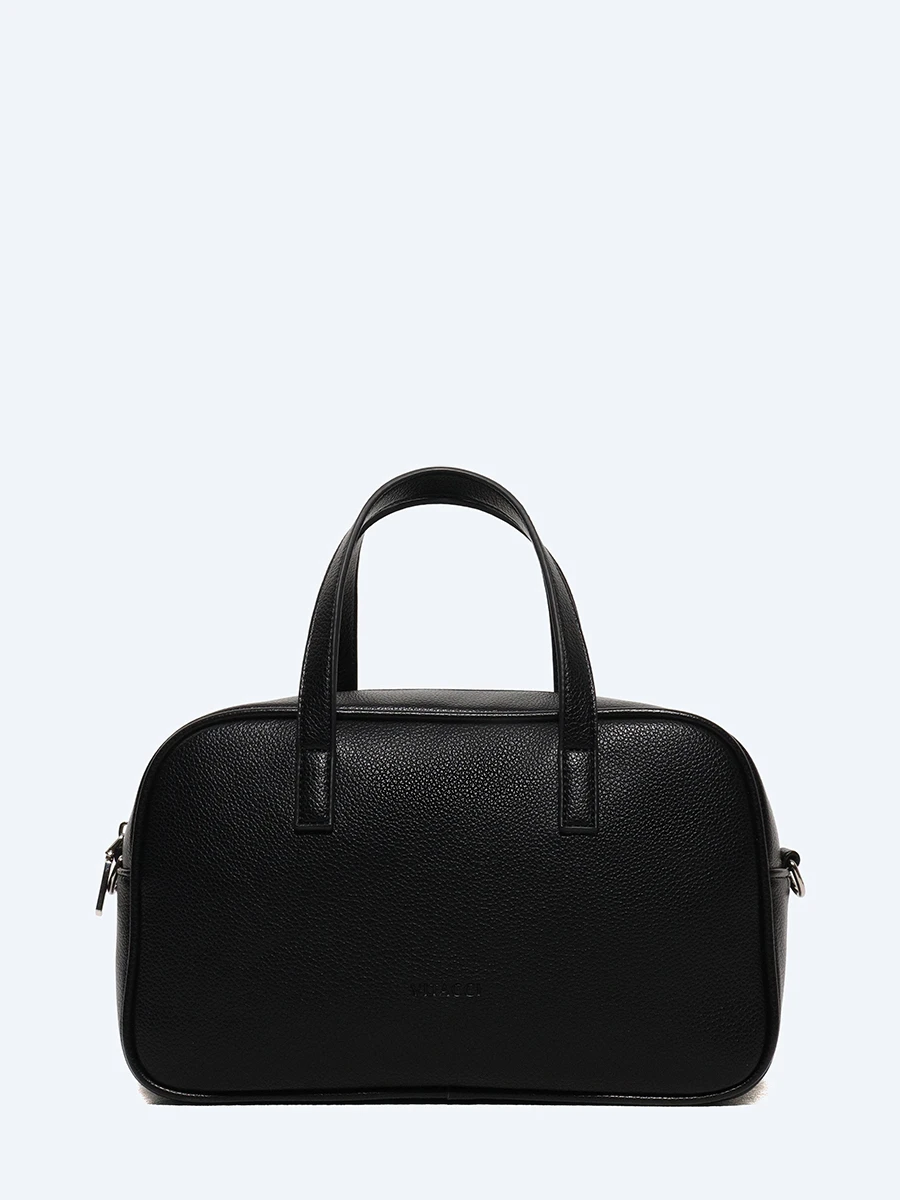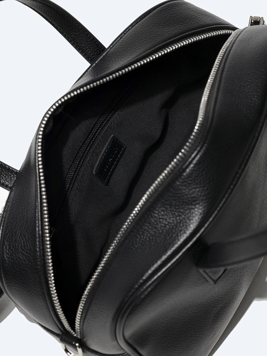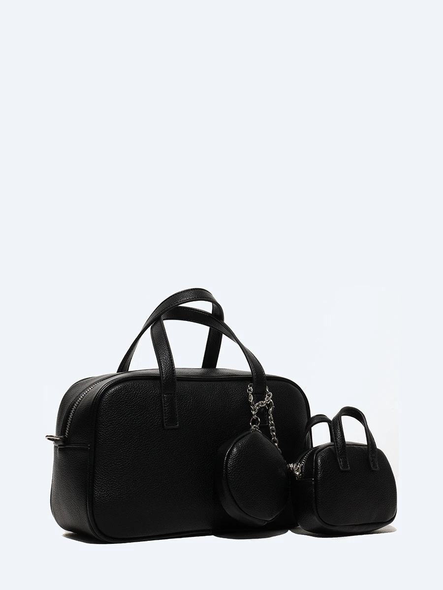 Сумка-тоут закрывается на молнию, имеет один внутренний карман на молнии и один внутренний открытый карман. В комплекте две съёмные маленькие сумочки-брелоки и съёмный длинный ремень.