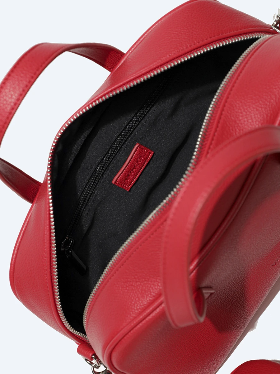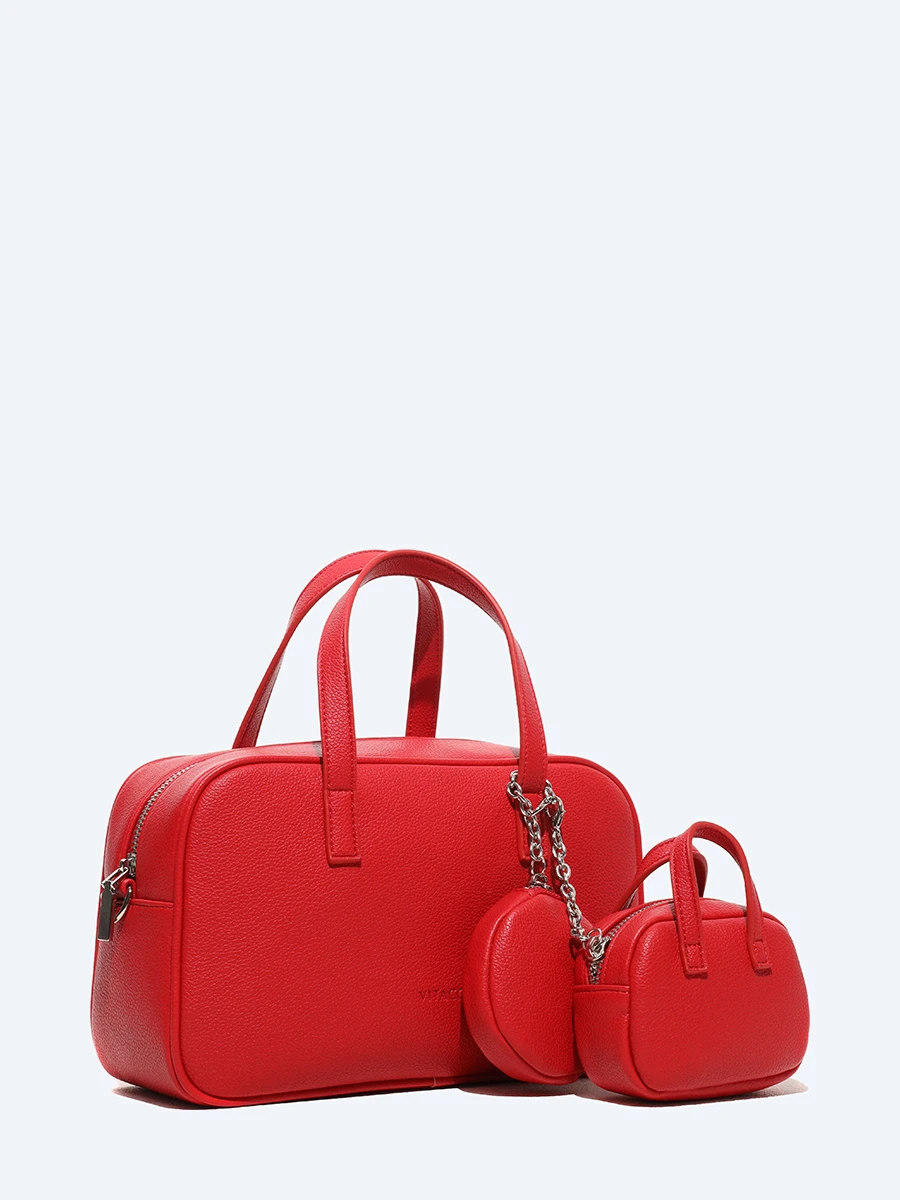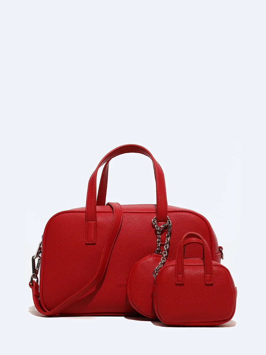 Сумка-тоут закрывается на молнию, имеет один внутренний карман на молнии и один внутренний открытый карман. В комплекте две съёмные маленькие сумочки-брелоки и съёмный длинный ремень.