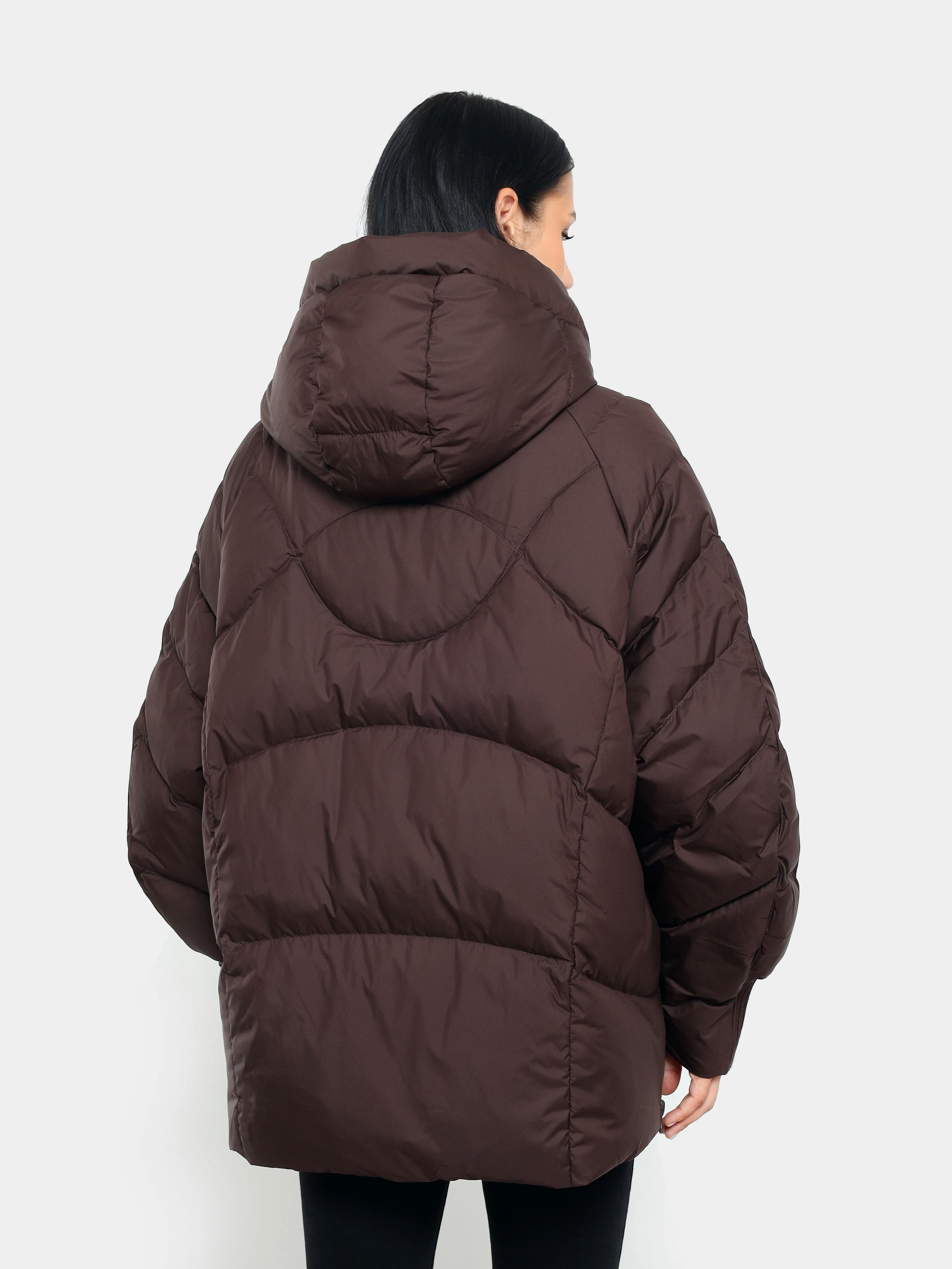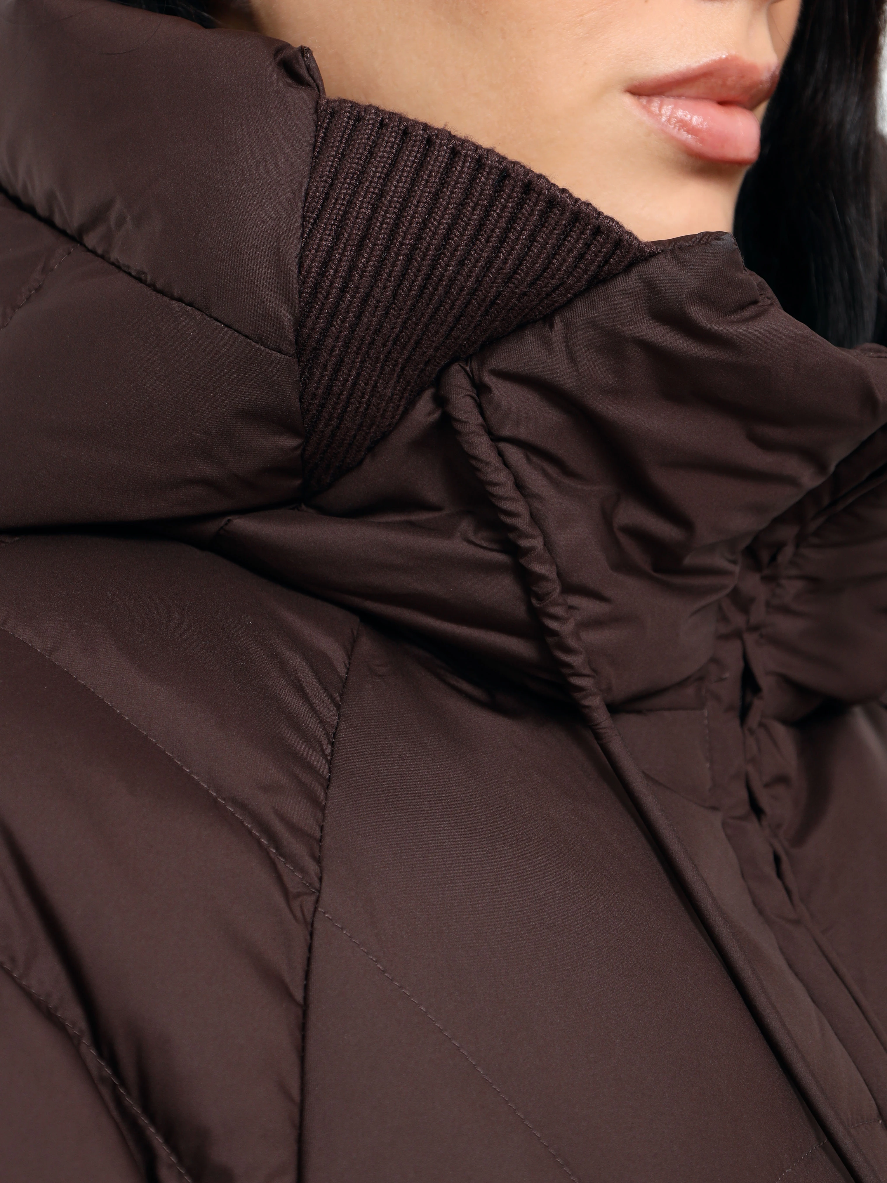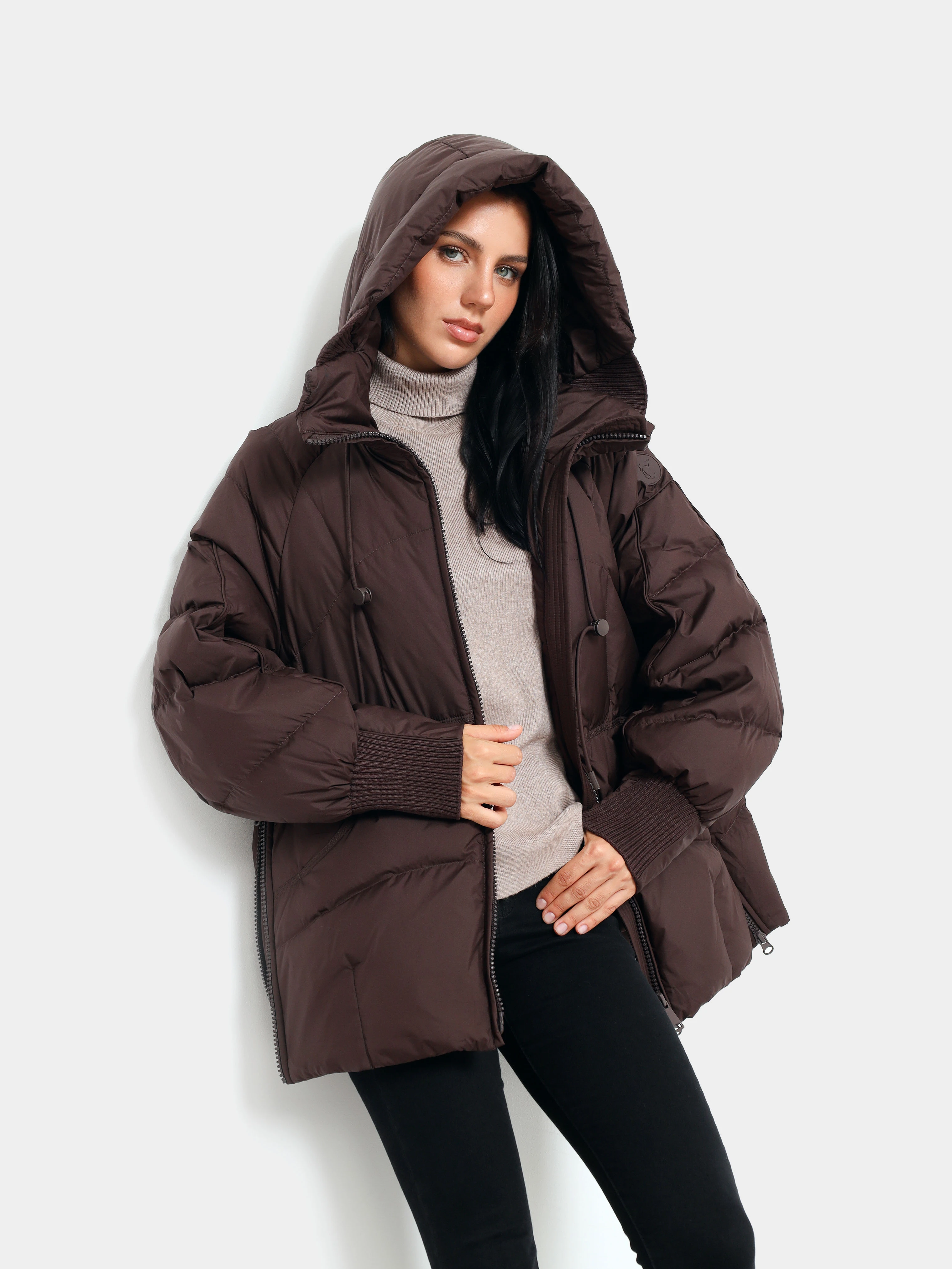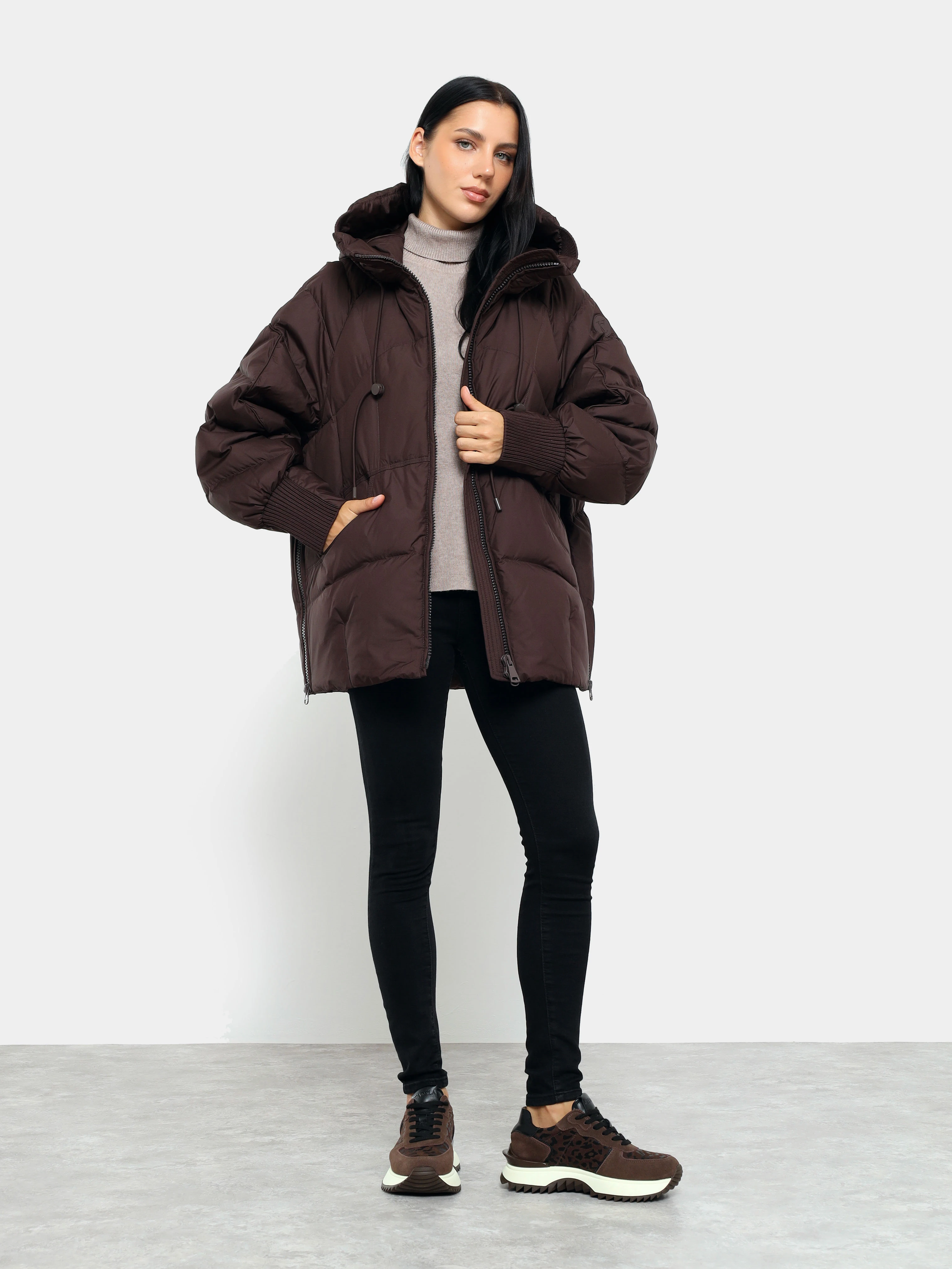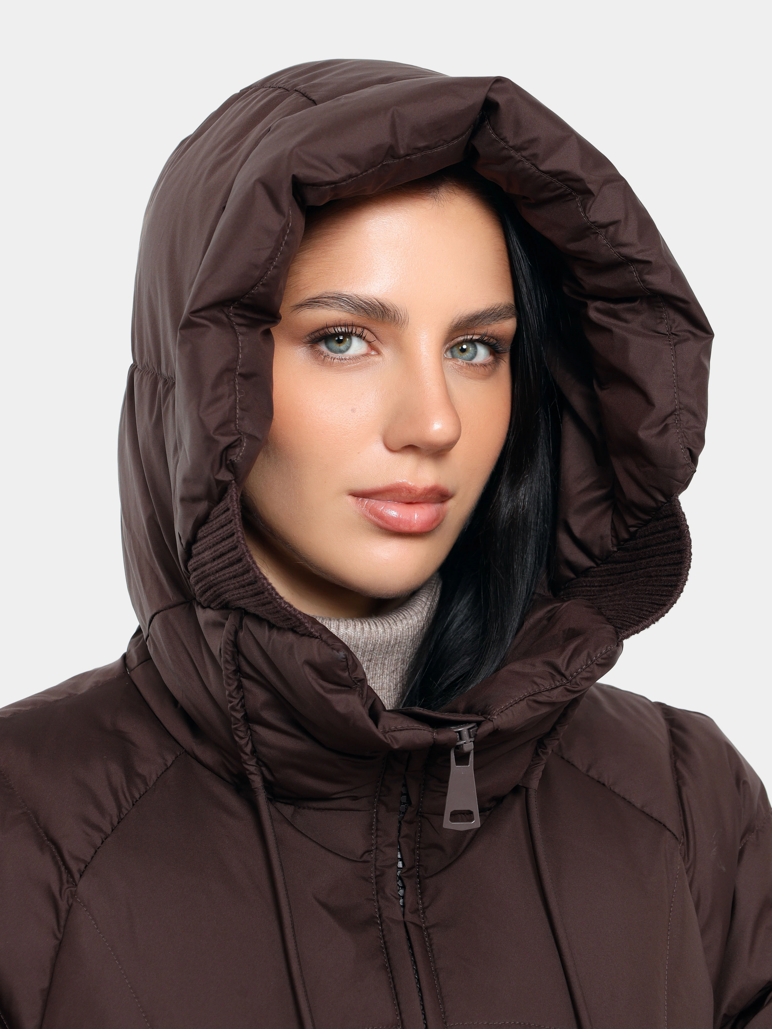Зимняя женская куртка-пуховик с верхом из полиэстера. В составе утеплителя пуховика – 70% пух и 30% перо. Куртка застегивается на двойную молнию. Имеется несъемный капюшон. Пуховик выполнен с двумя внешними боковыми карманами на кнопке и одним внутренним нагрудным карманом без застежки. Низ куртки расширяется благодаря молниям по обеим сторонам.