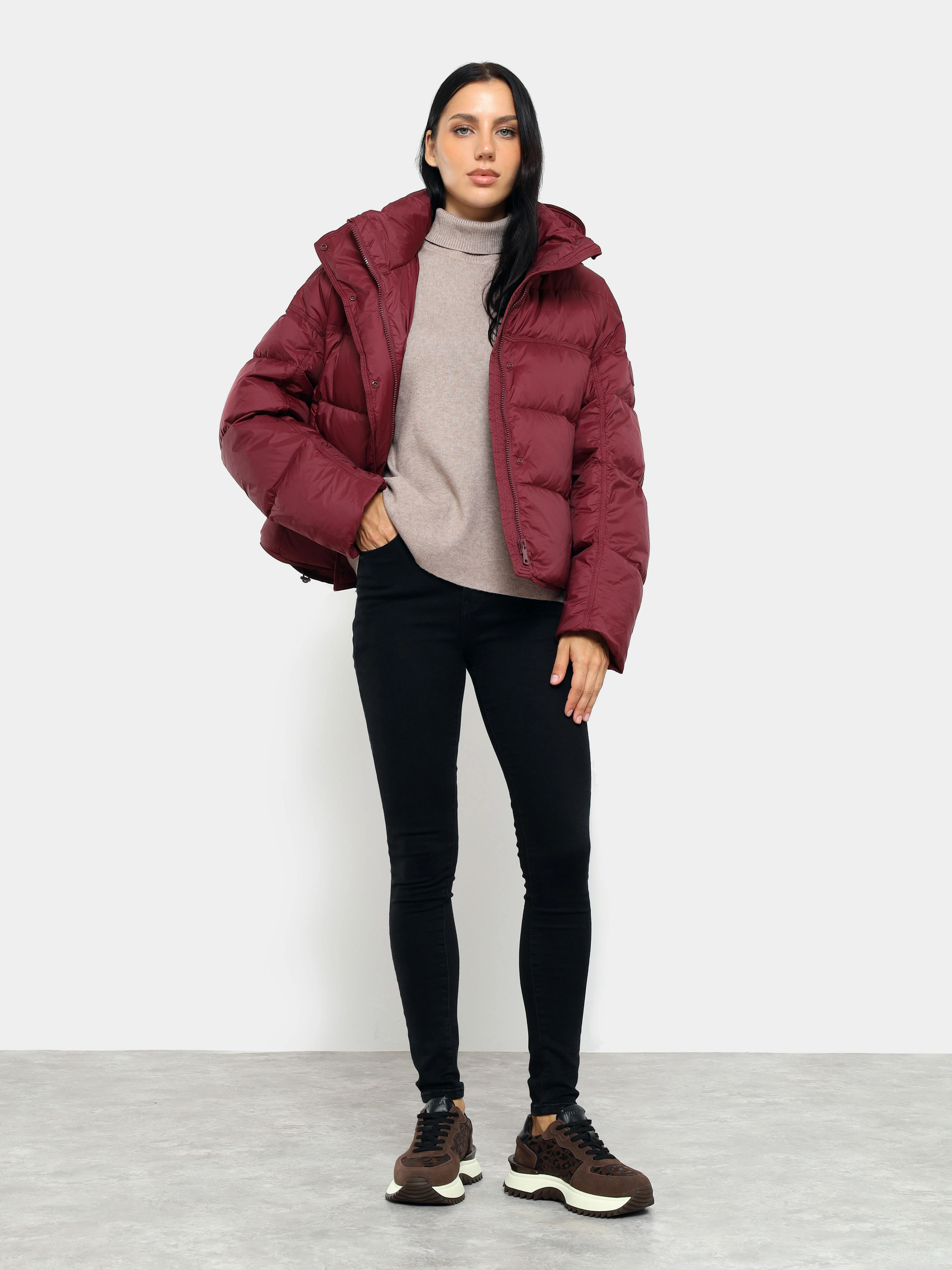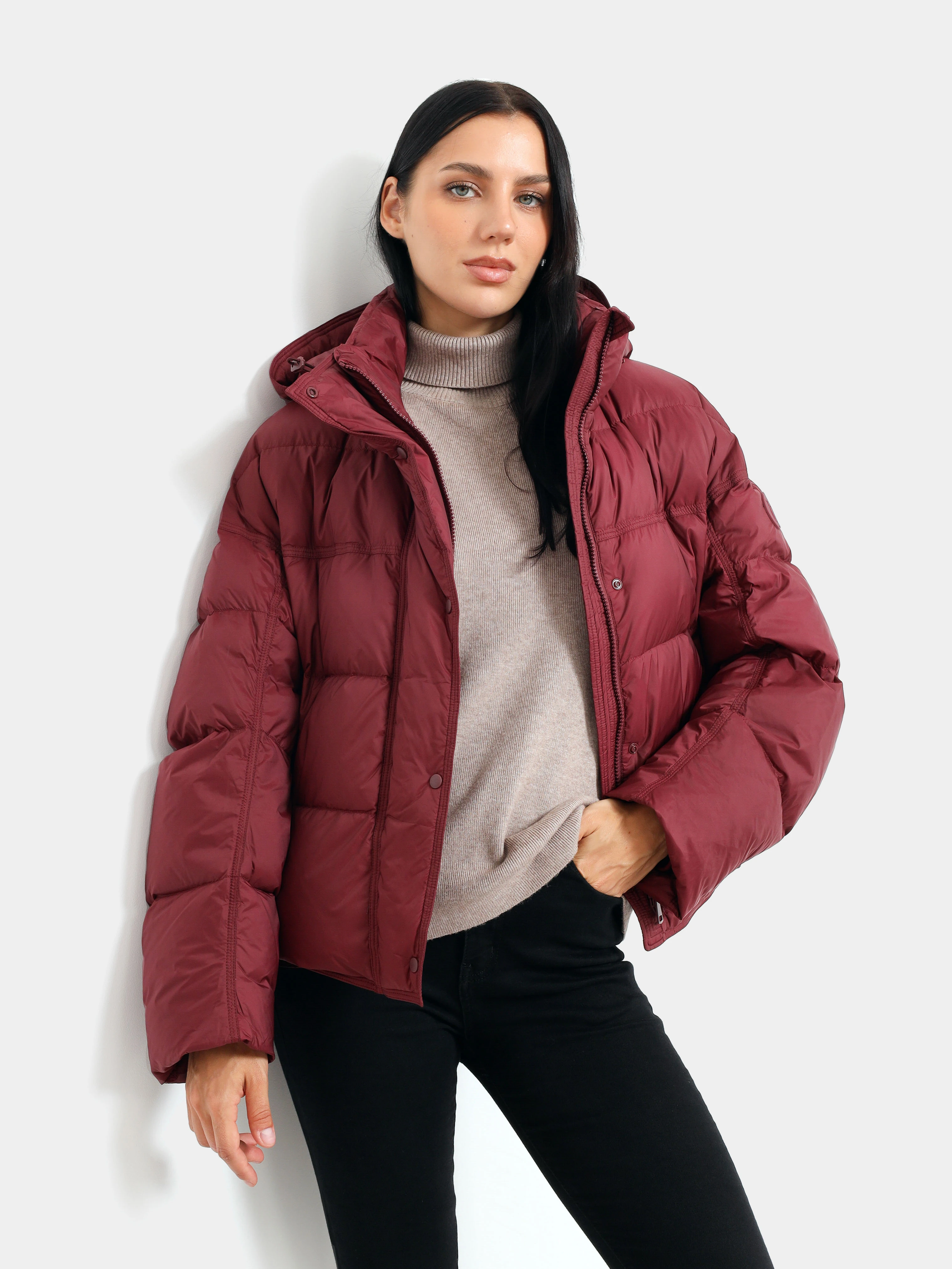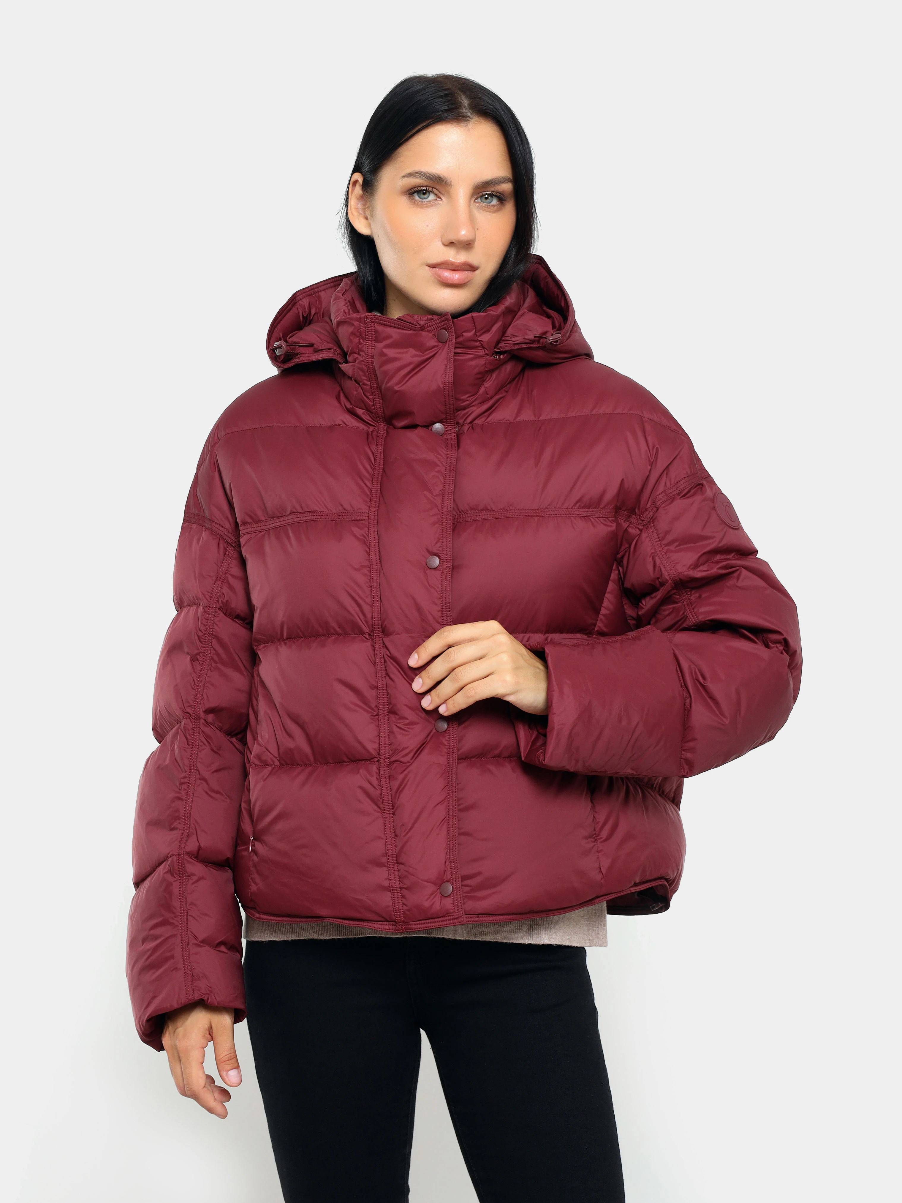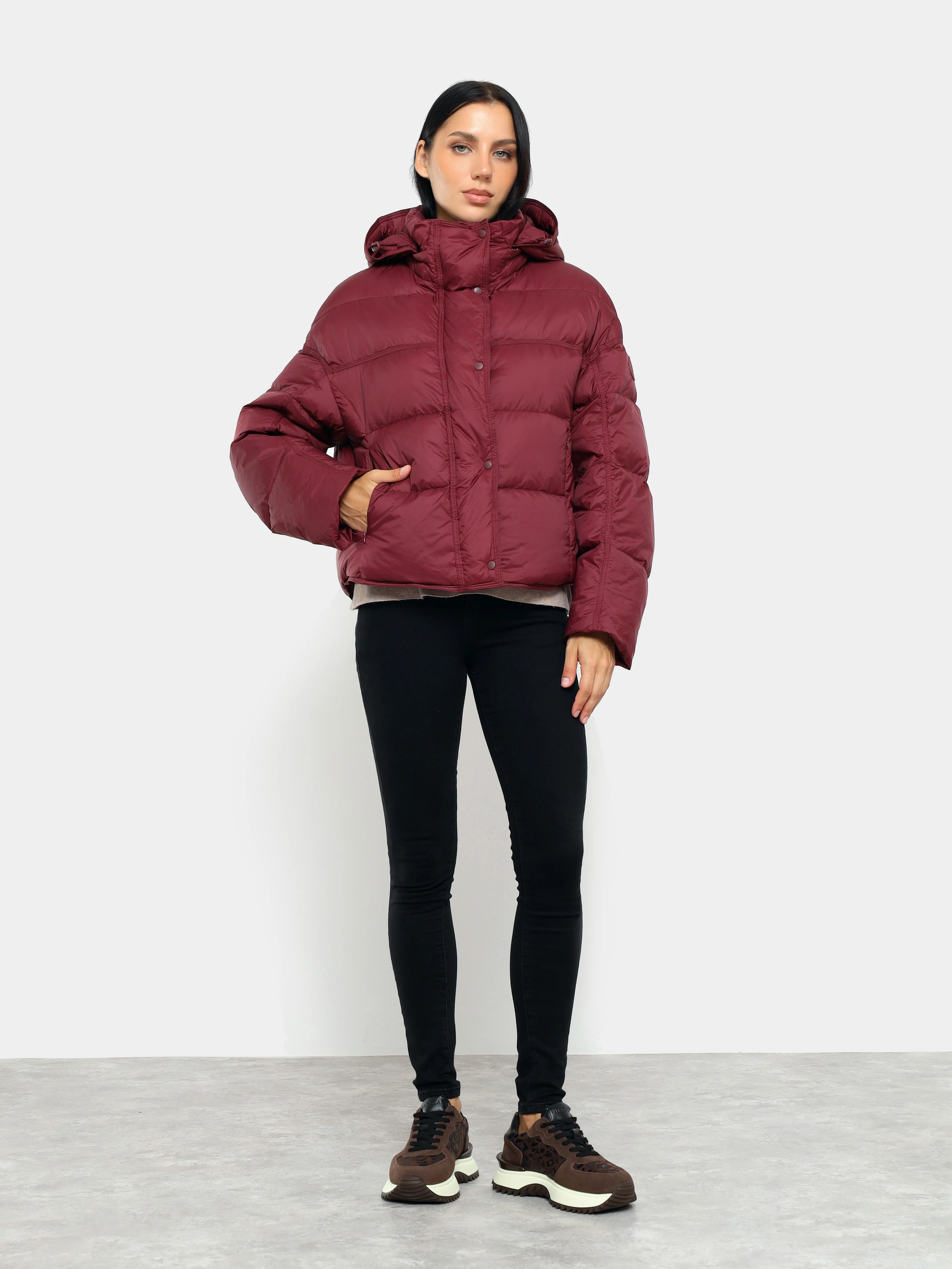 Женская зимняя укороченная куртка-пуховик с верхом из нейлона и с подкладкой из полиэстера. В составе утеплителя пуховика – 70% пух и 30% перо. Куртка застегивается на молнию и кнопки. Имеется съемный капюшон с возможностью утяжки благодаря шнурку с фиксаторами. Пуховик выполнен с двумя внешними боковыми карманами на молнии и одним внутренним нагрудным карманом без застежки. Низ куртки утягивается с помощью шнурка с фиксаторами. Рукава куртки выполнены с манжетами на резинке для сохранения тепла.