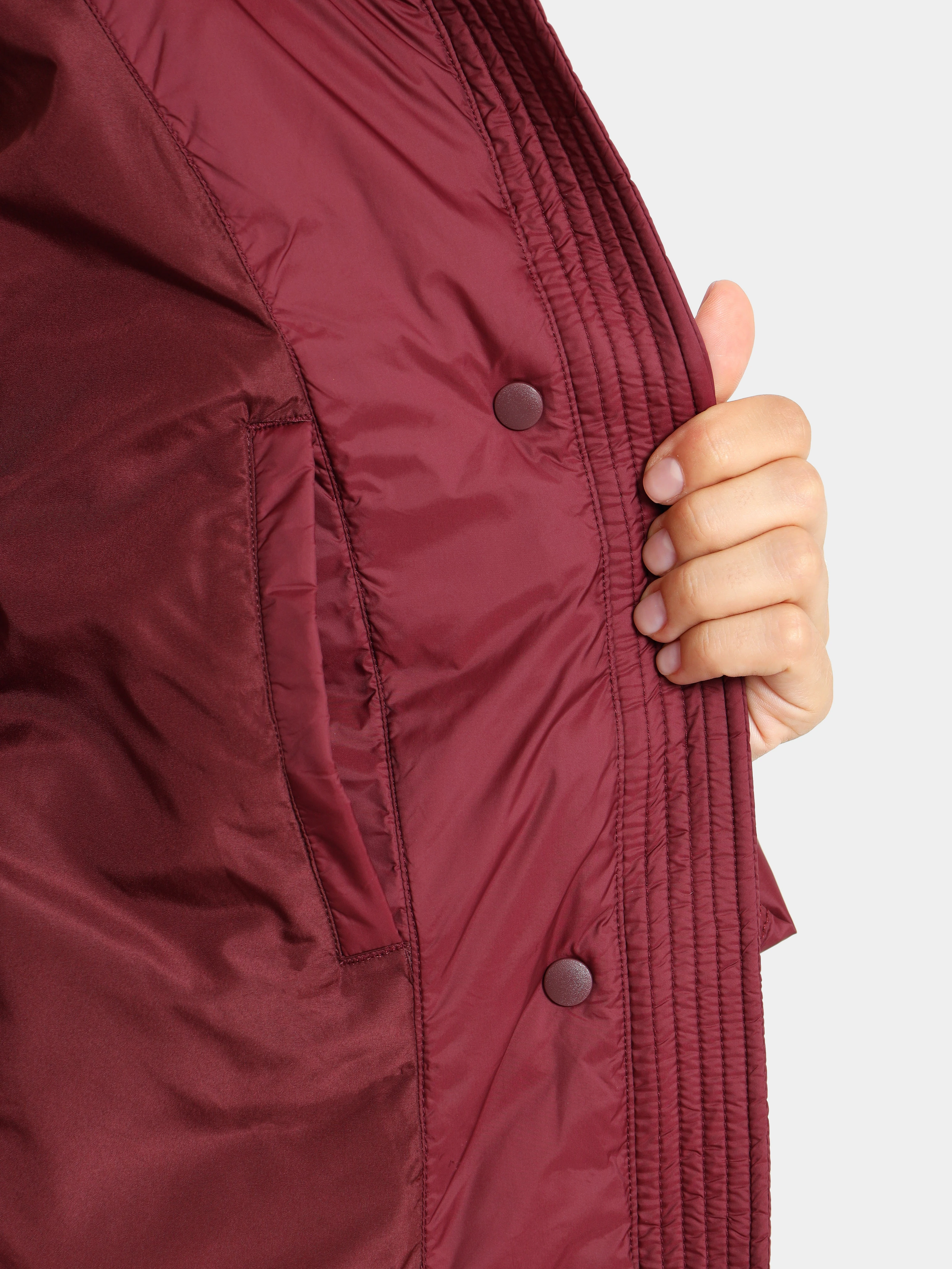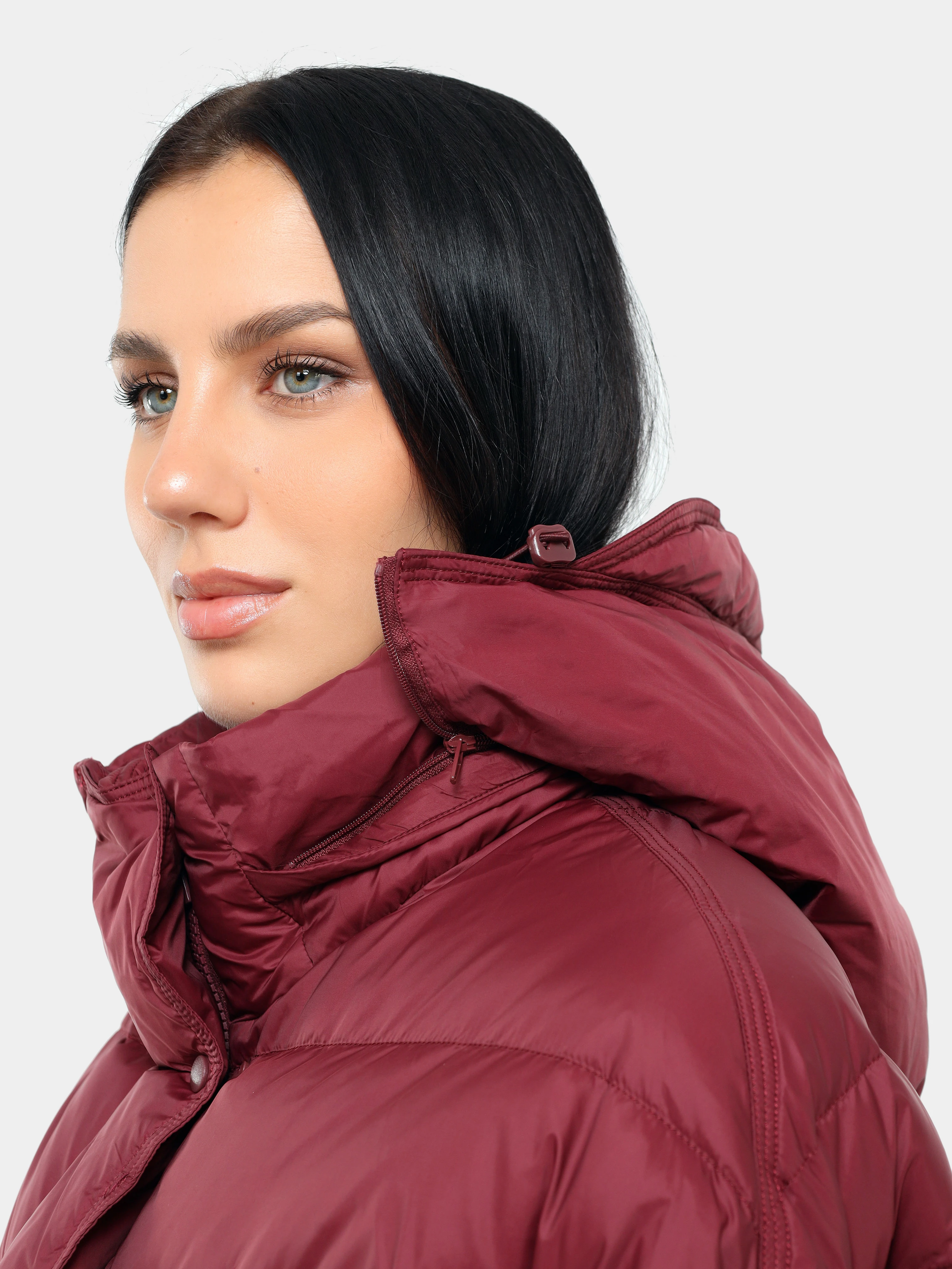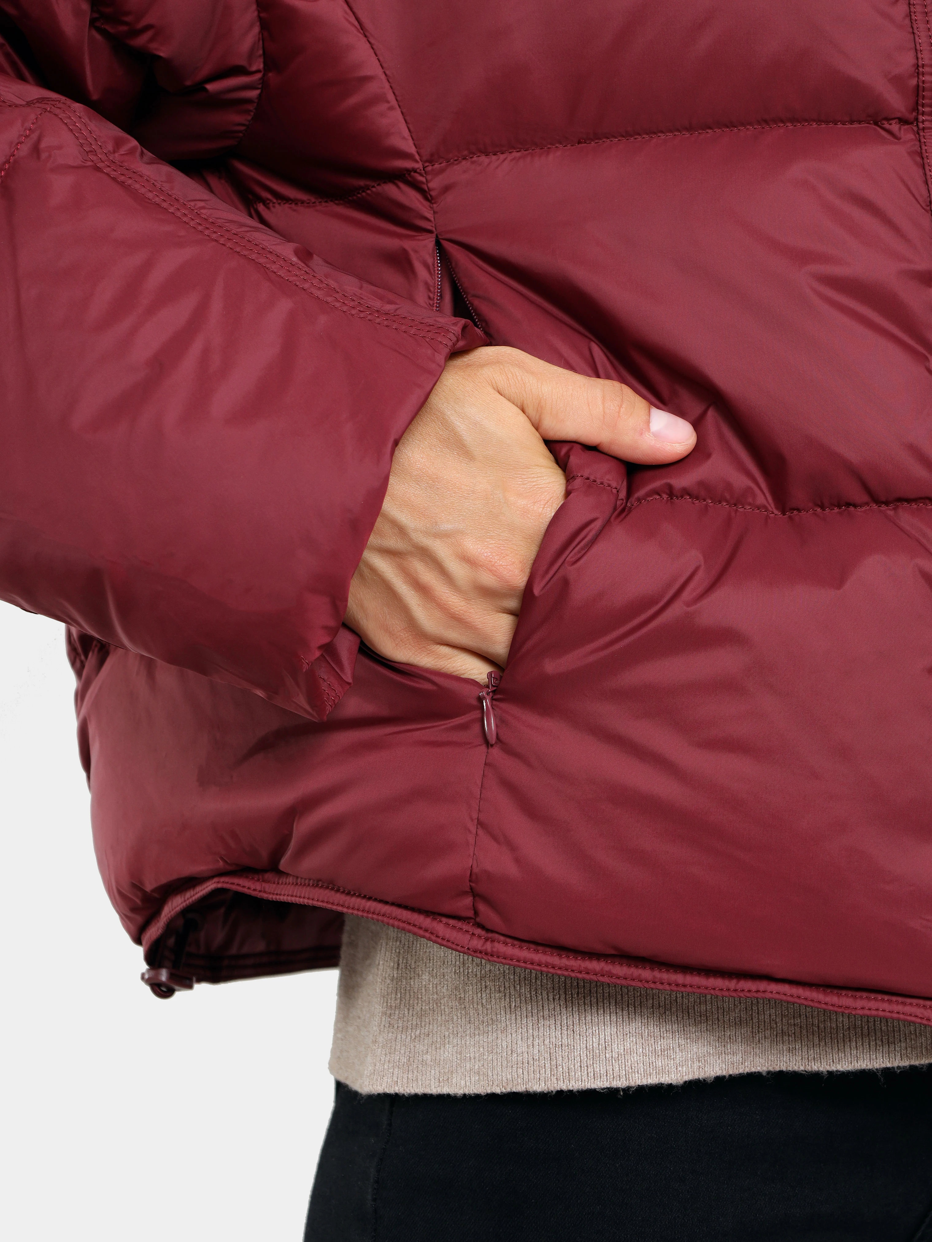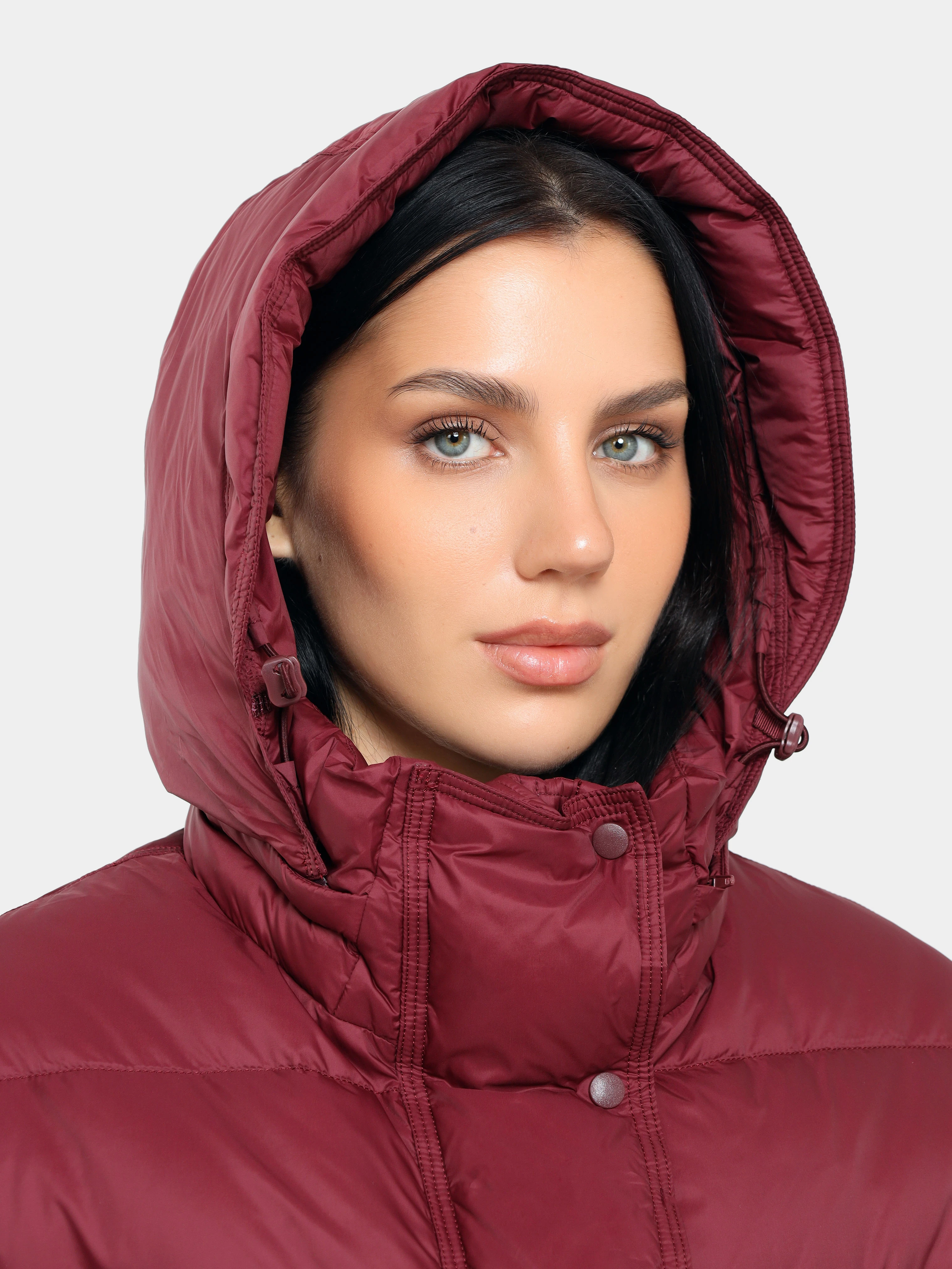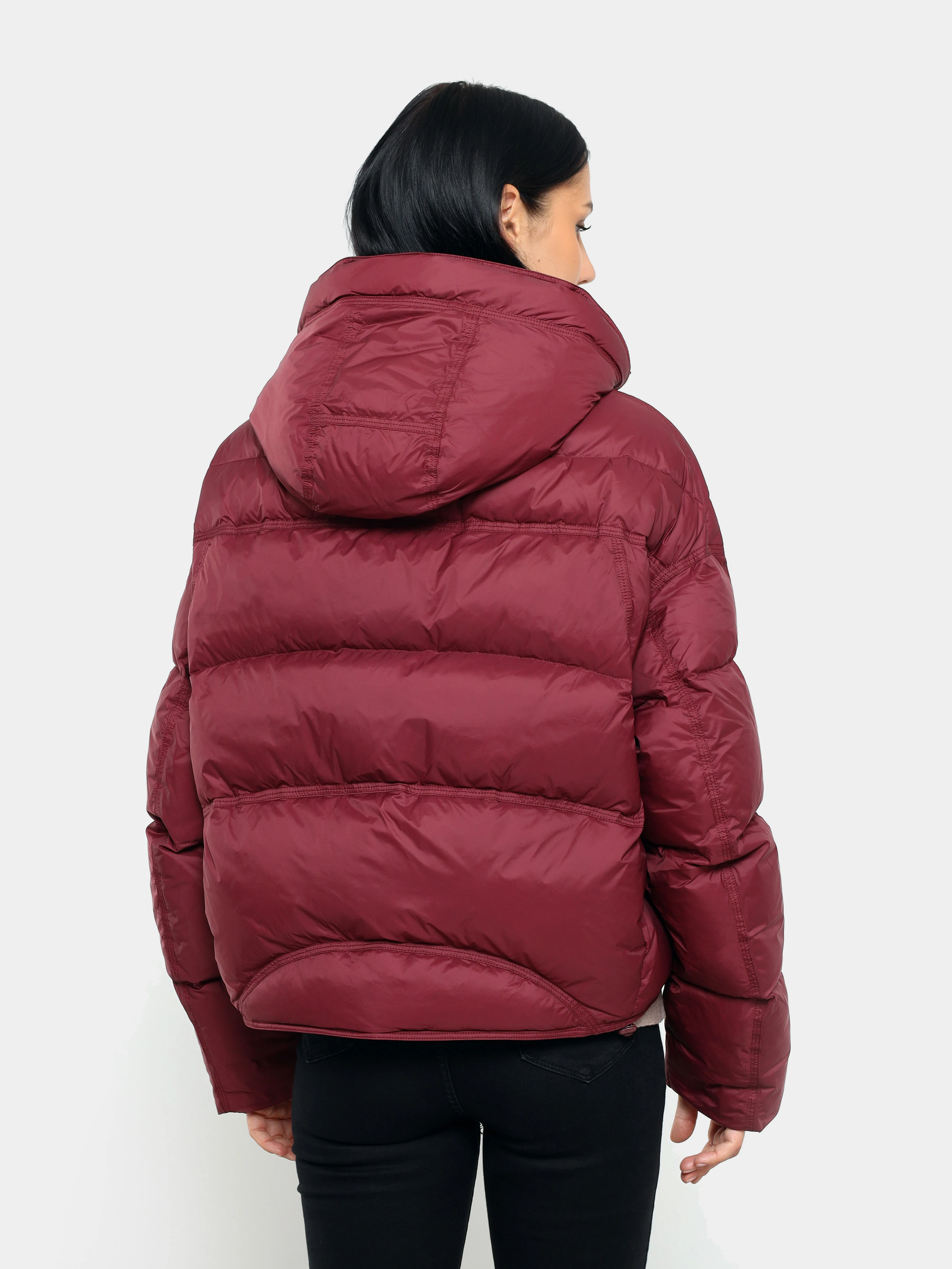 Женская зимняя укороченная куртка-пуховик с верхом из нейлона и с подкладкой из полиэстера. В составе утеплителя пуховика – 70% пух и 30% перо. Куртка застегивается на молнию и кнопки. Имеется съемный капюшон с возможностью утяжки благодаря шнурку с фиксаторами. Пуховик выполнен с двумя внешними боковыми карманами на молнии и одним внутренним нагрудным карманом без застежки. Низ куртки утягивается с помощью шнурка с фиксаторами. Рукава куртки выполнены с манжетами на резинке для сохранения тепла.