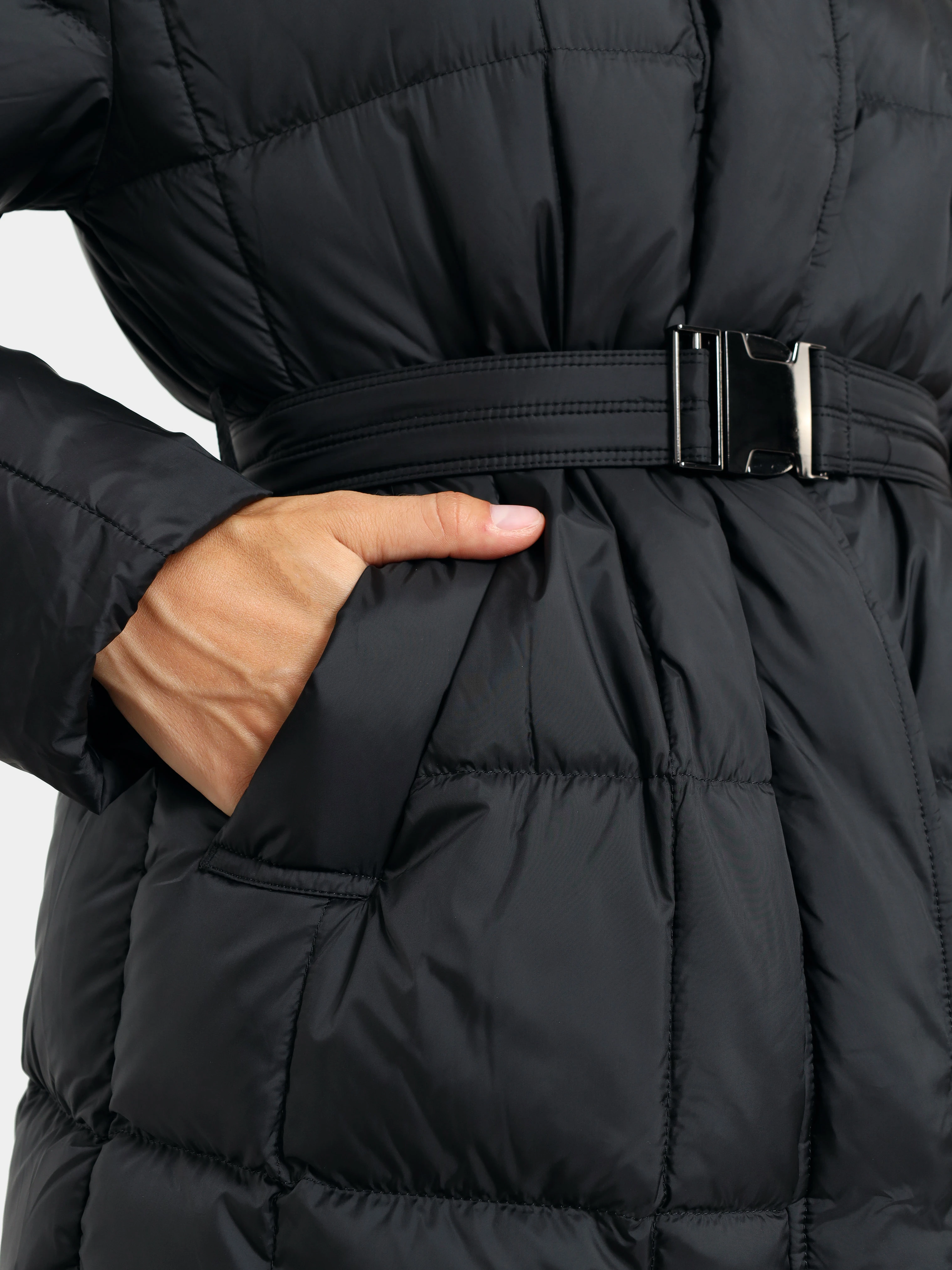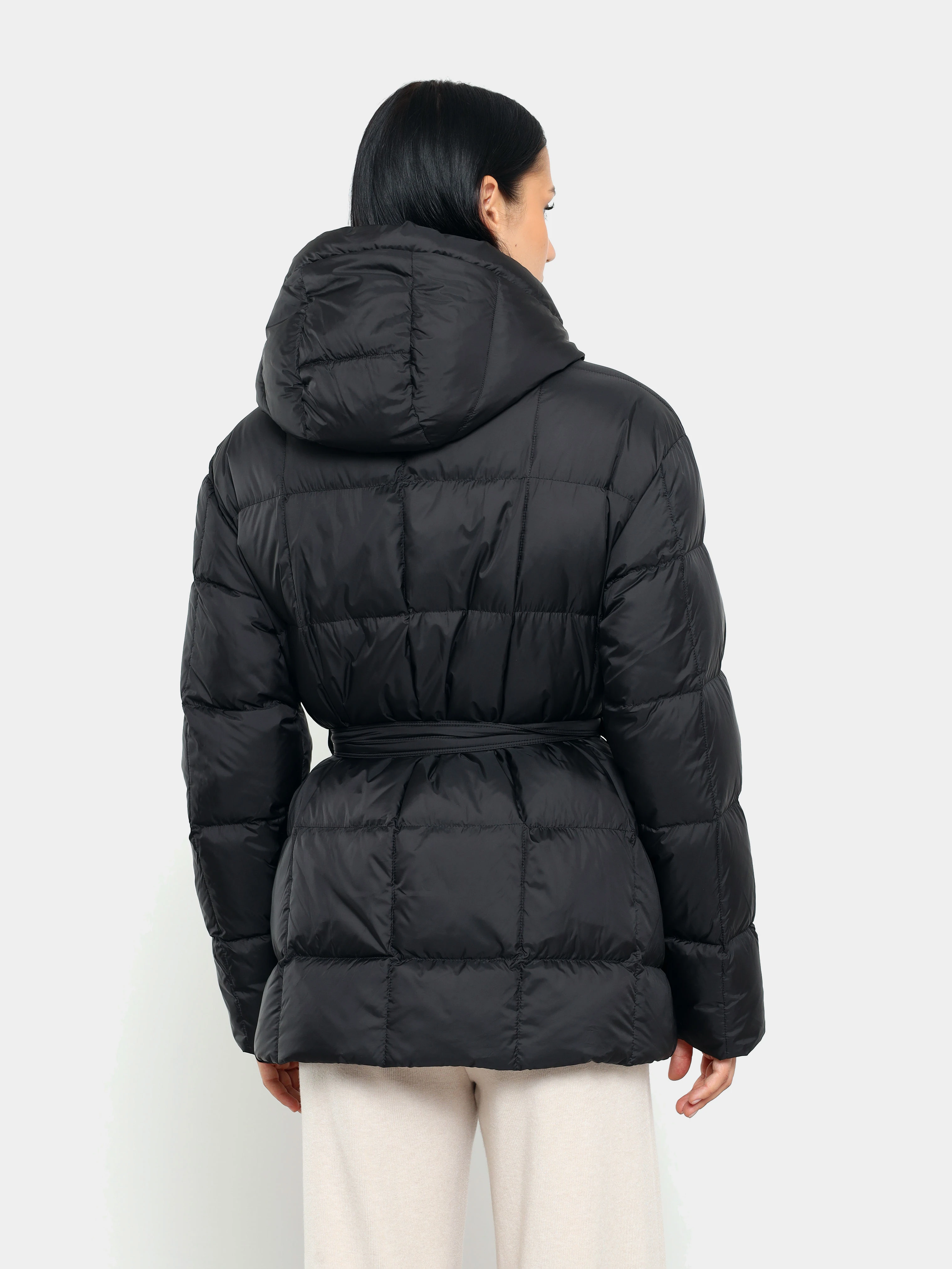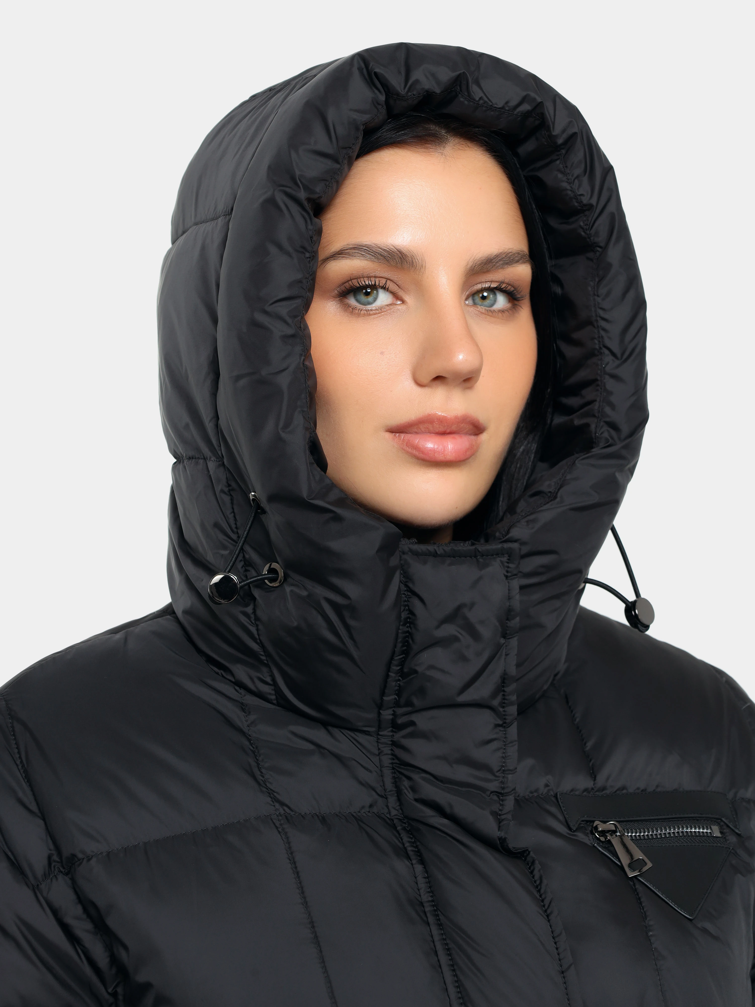 Зимняя женская куртка-пуховик с верхом из полиэстера. В составе утеплителя пуховика – 70% пух и 30% перо. Куртка застегивается на двойную молнию и кнопки. Имеется несъемный капюшон, который утягивается благодаря шнурку с фиксаторами. Пуховик выполнен с двумя внешними боковыми карманами на кнопке и одним внутренним нагрудным карманом без застежки. Низ куртки утягивается с помощью шнурка с фиксаторами. Рукава выполнены с манжетами на резинке для сохранения тепла. К пуховику прилагается пояс с металлической пряжкой-фастексом и максимальной длиной 125 см.