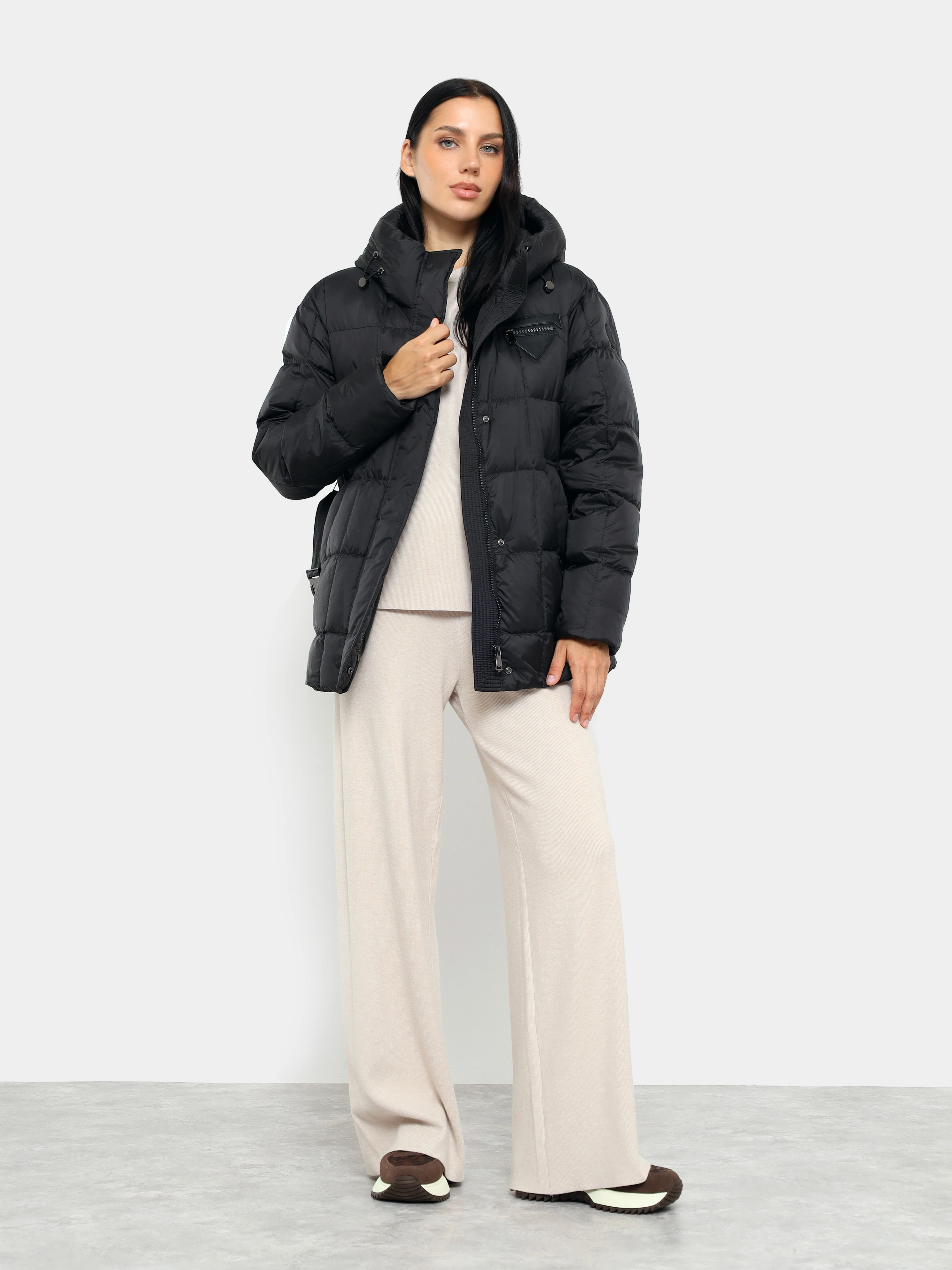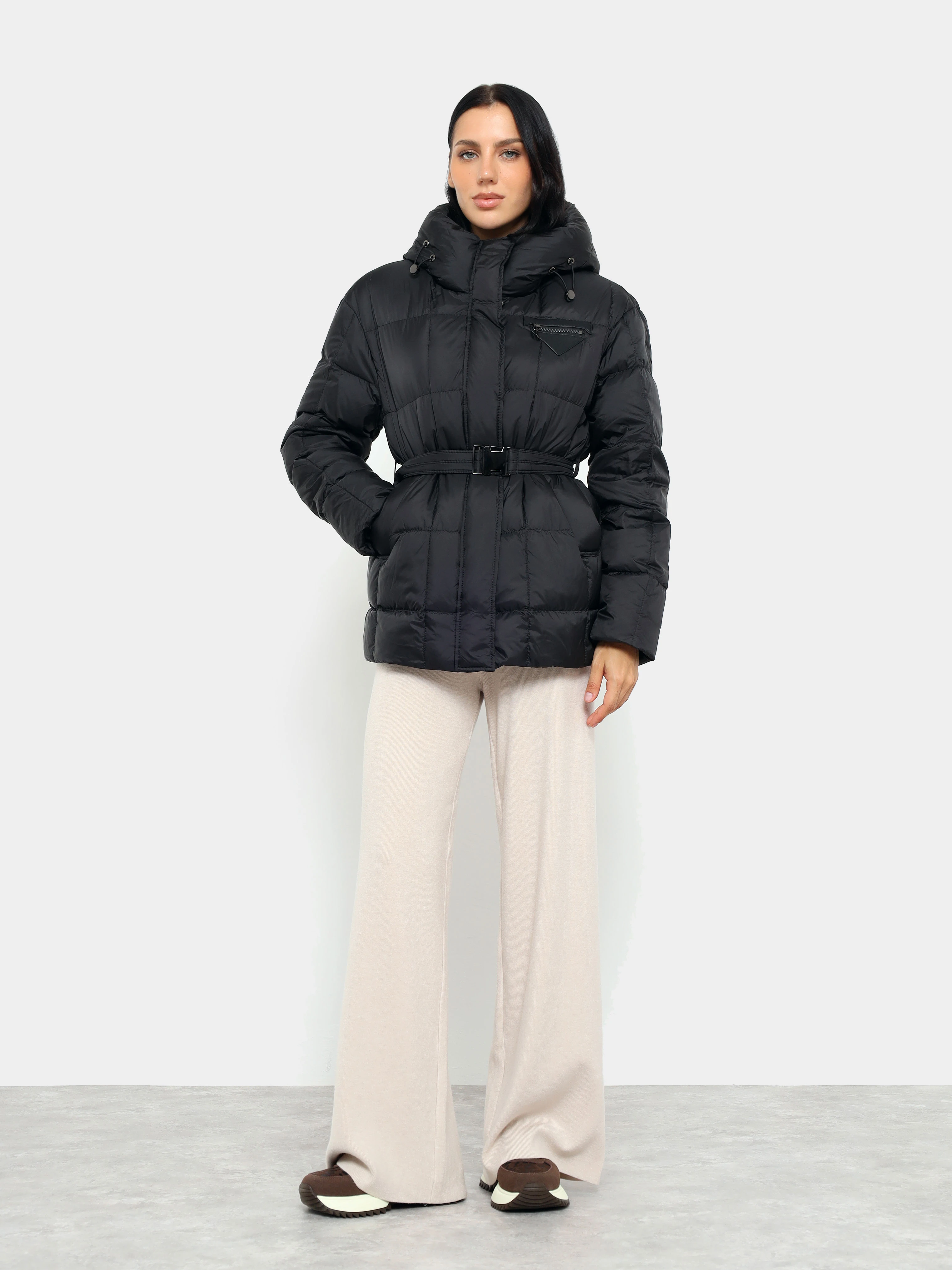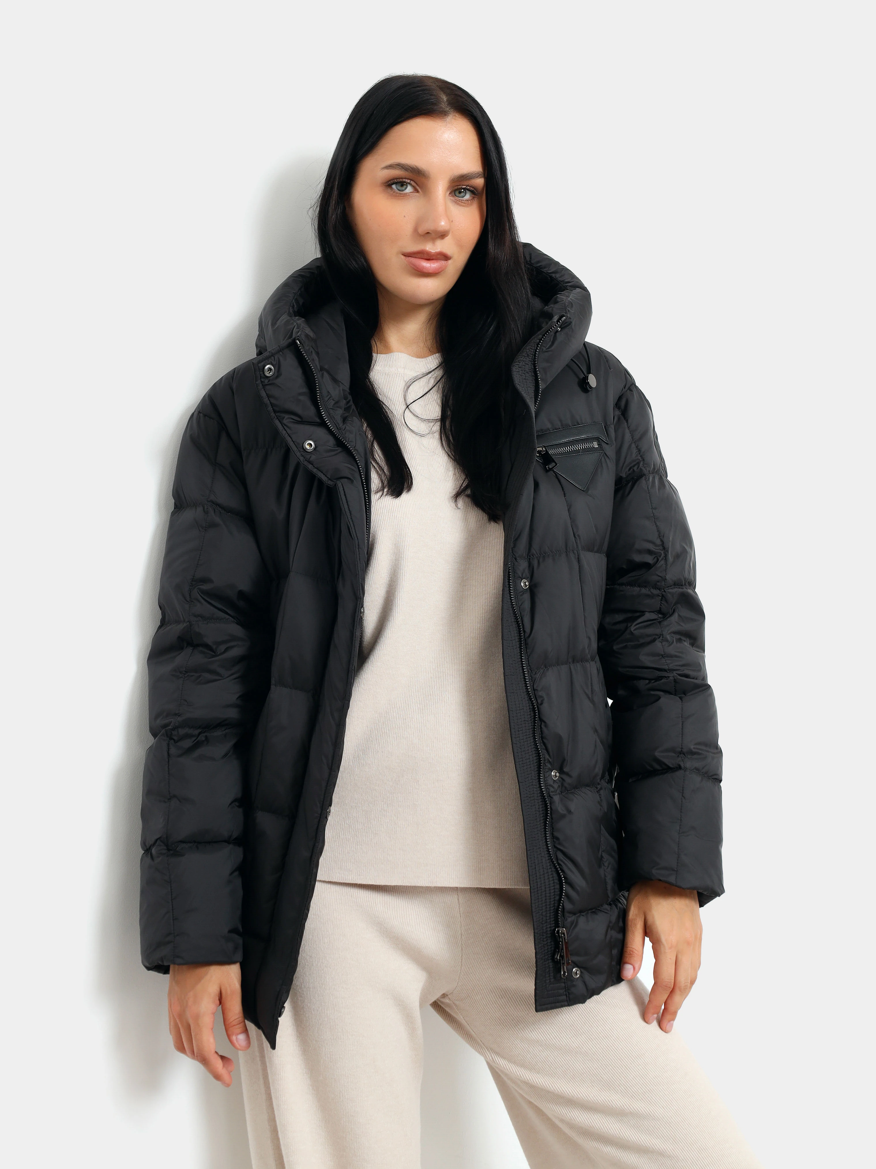Зимняя женская куртка-пуховик с верхом из полиэстера. В составе утеплителя пуховика – 70% пух и 30% перо. Куртка застегивается на двойную молнию и кнопки. Имеется несъемный капюшон, который утягивается благодаря шнурку с фиксаторами. Пуховик выполнен с двумя внешними боковыми карманами на кнопке и одним внутренним нагрудным карманом без застежки. Низ куртки утягивается с помощью шнурка с фиксаторами. Рукава выполнены с манжетами на резинке для сохранения тепла. К пуховику прилагается пояс с металлической пряжкой-фастексом и максимальной длиной 125 см.