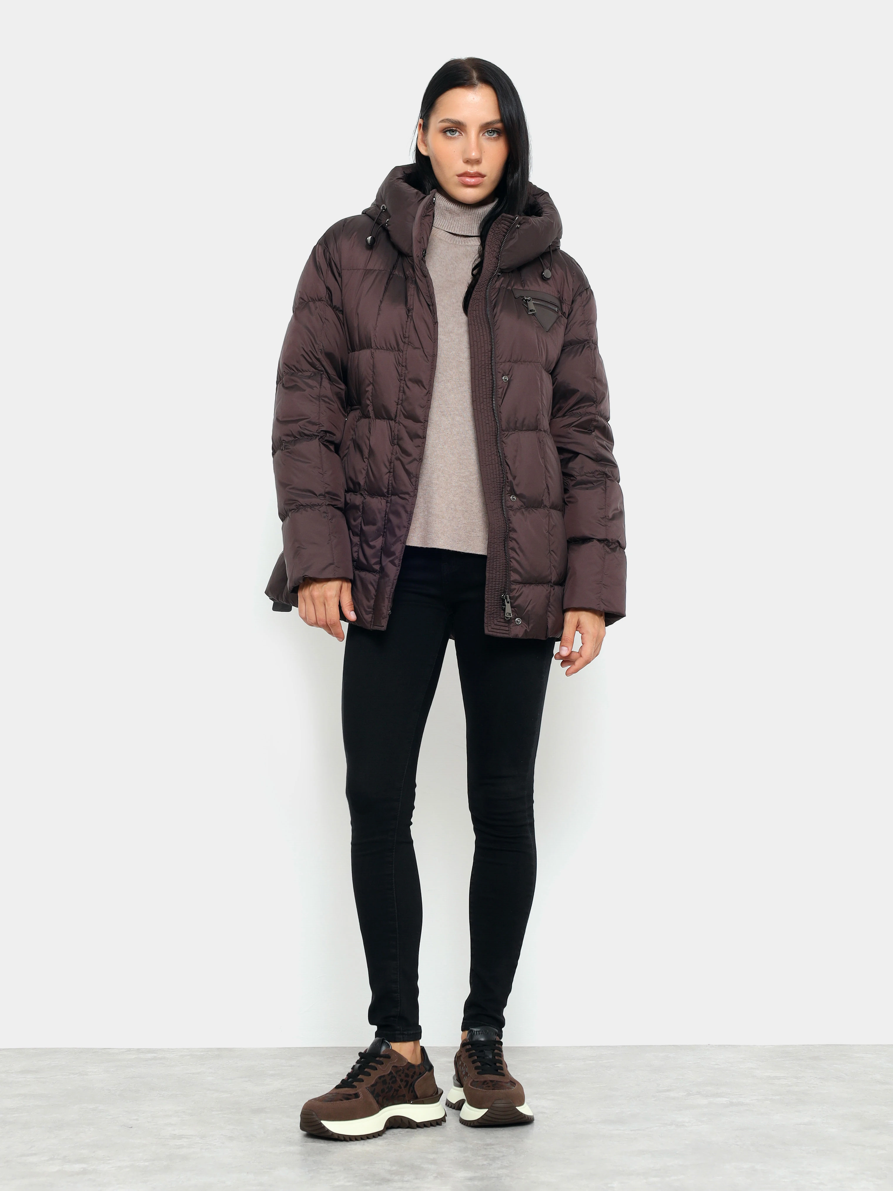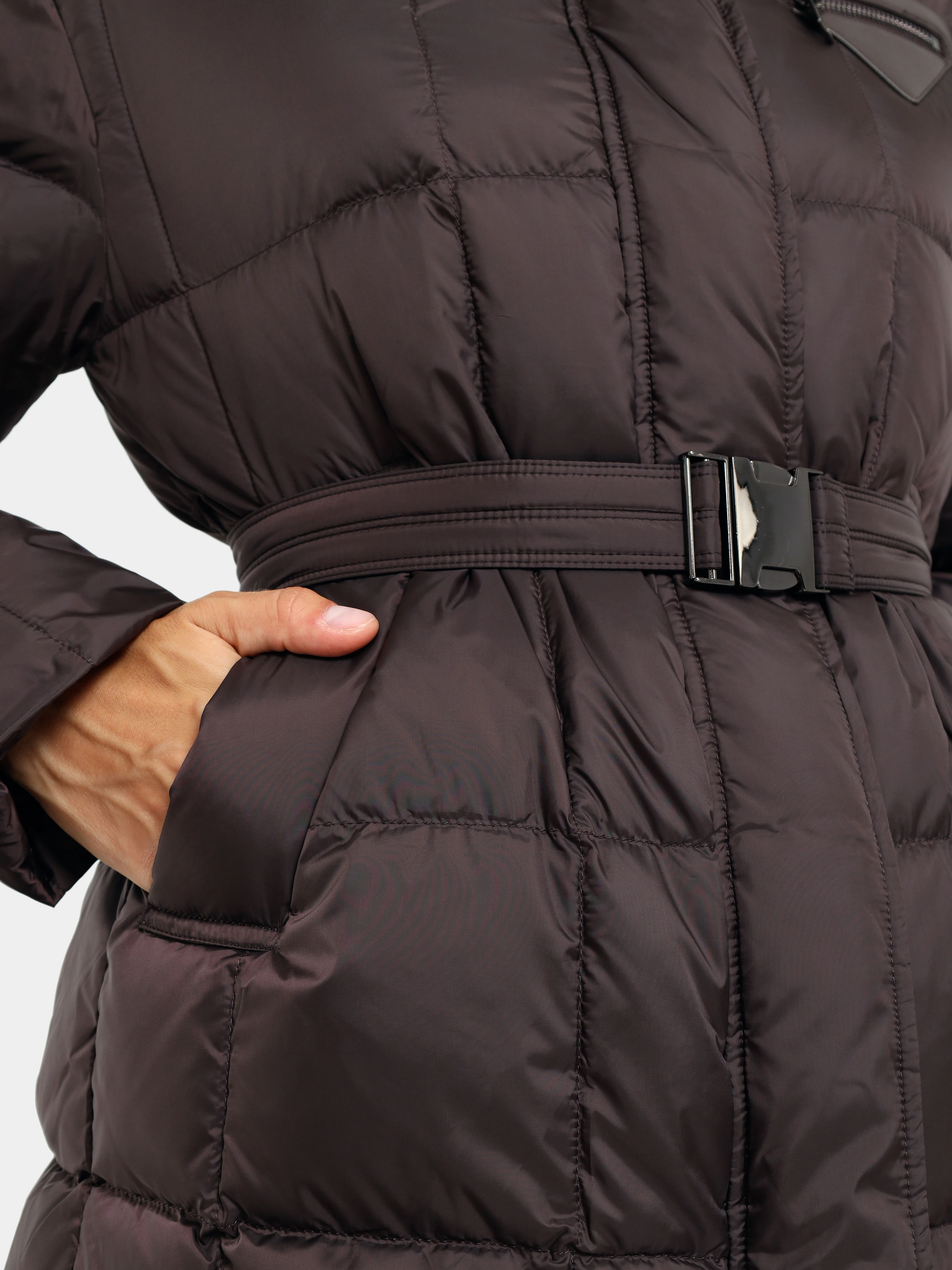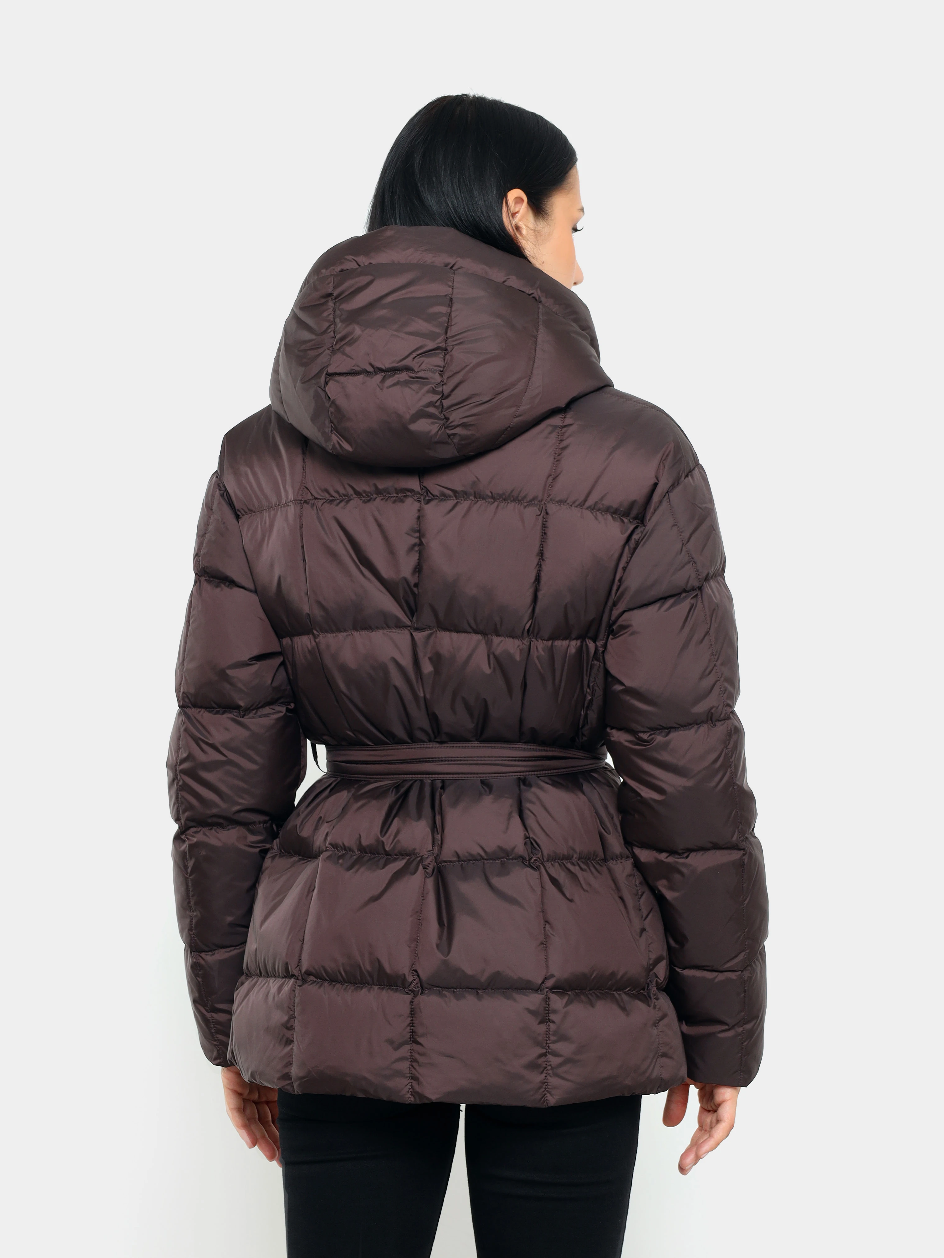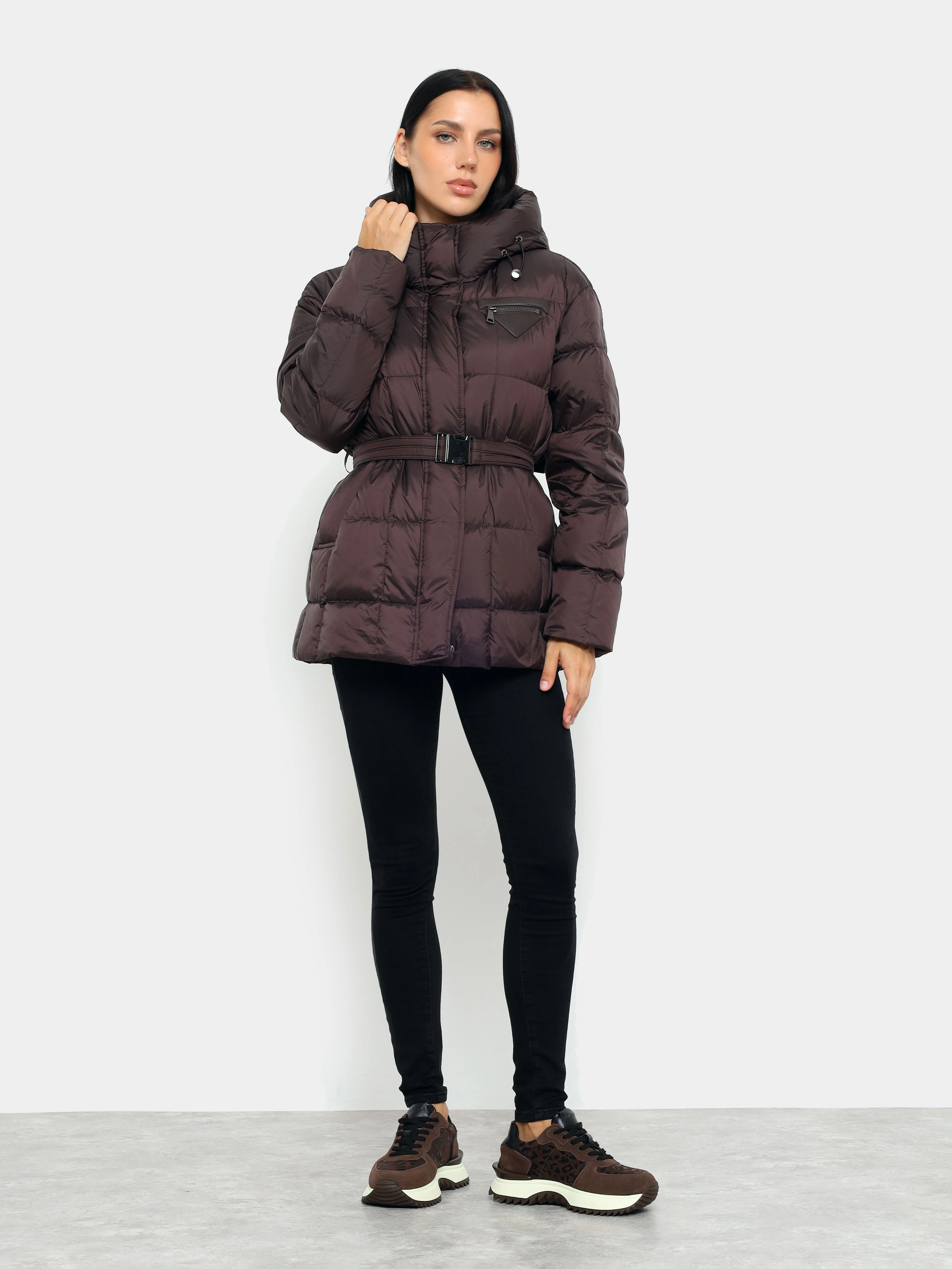 Зимняя женская куртка-пуховик с верхом из полиэстера. В составе утеплителя пуховика – 70% пух и 30% перо. Куртка застегивается на двойную молнию и кнопки. Имеется несъемный капюшон, который утягивается благодаря шнурку с фиксаторами. Пуховик выполнен с двумя внешними боковыми карманами на кнопке и одним внутренним нагрудным карманом без застежки. Низ куртки утягивается с помощью шнурка с фиксаторами. Рукава выполнены с манжетами на резинке для сохранения тепла. К пуховику прилагается пояс с металлической пряжкой-фастексом и максимальной длиной 125 см.