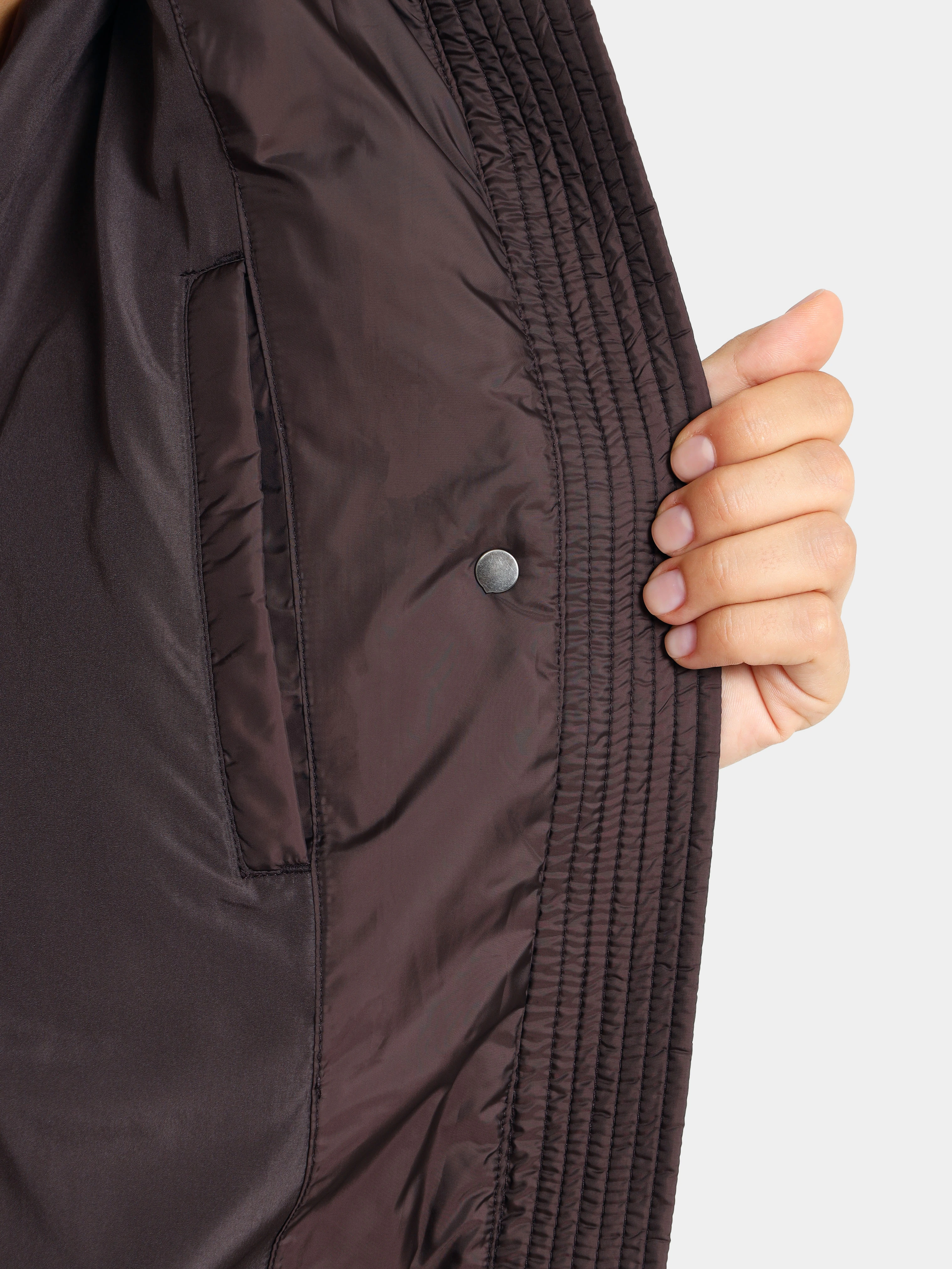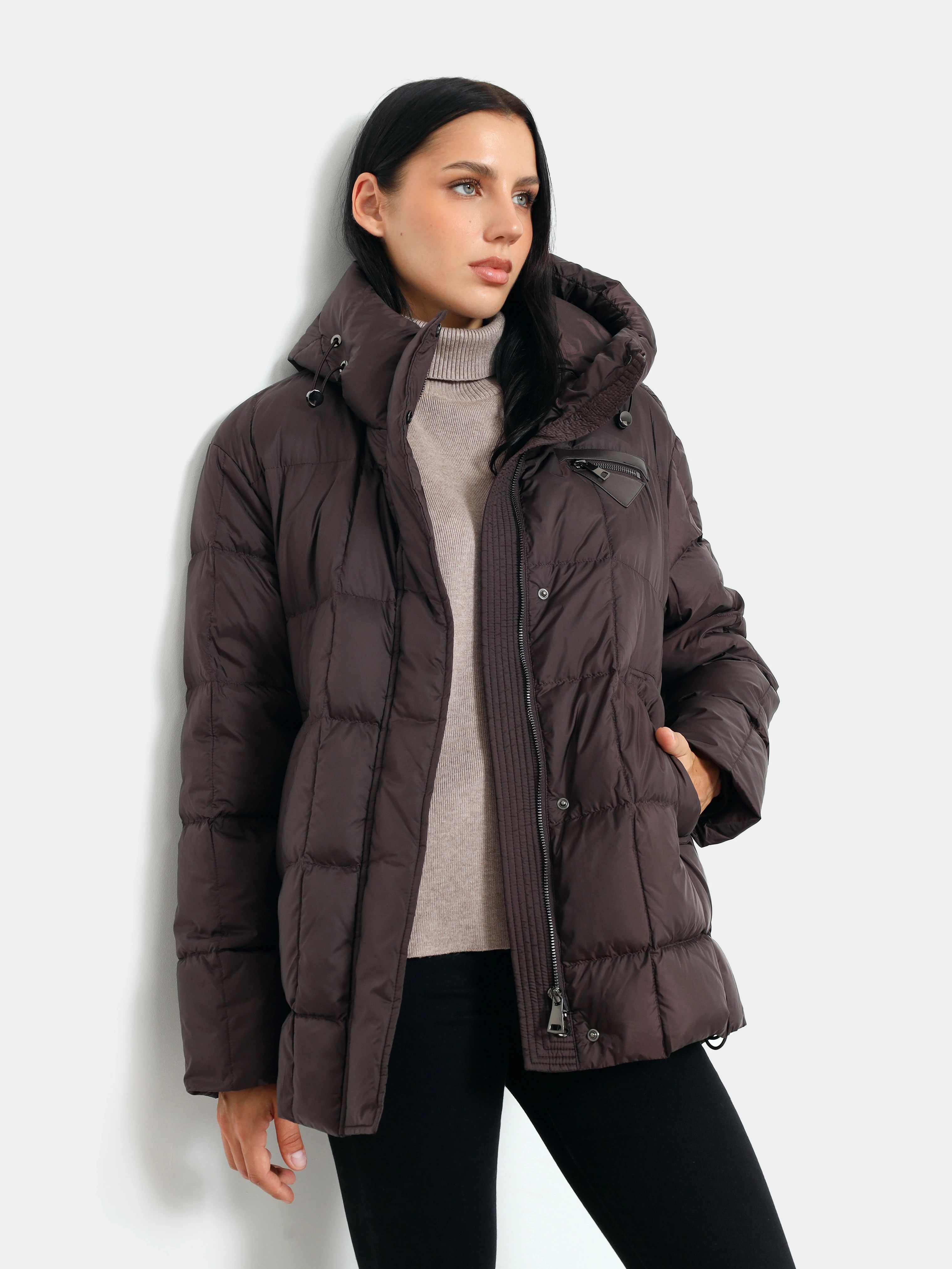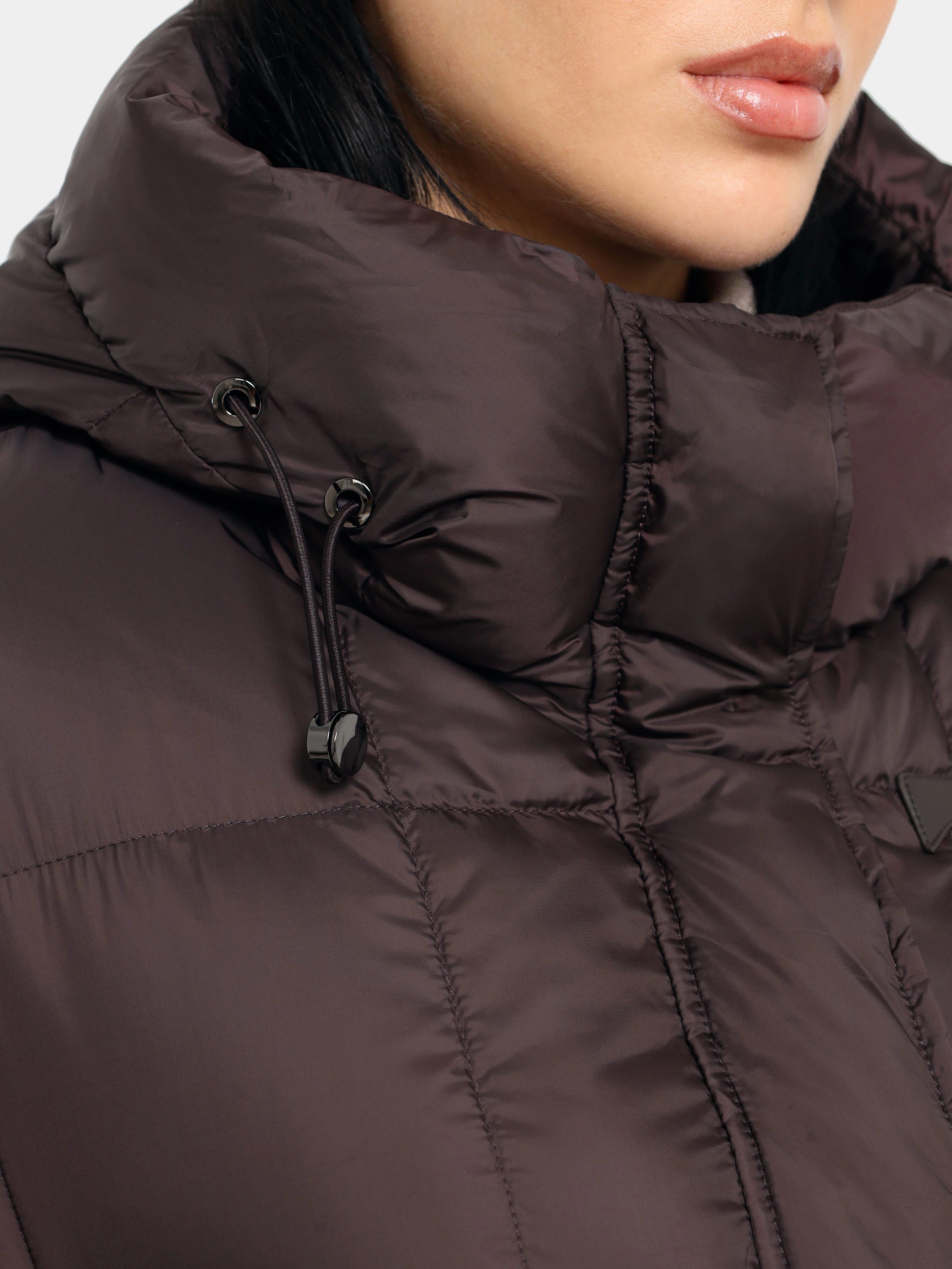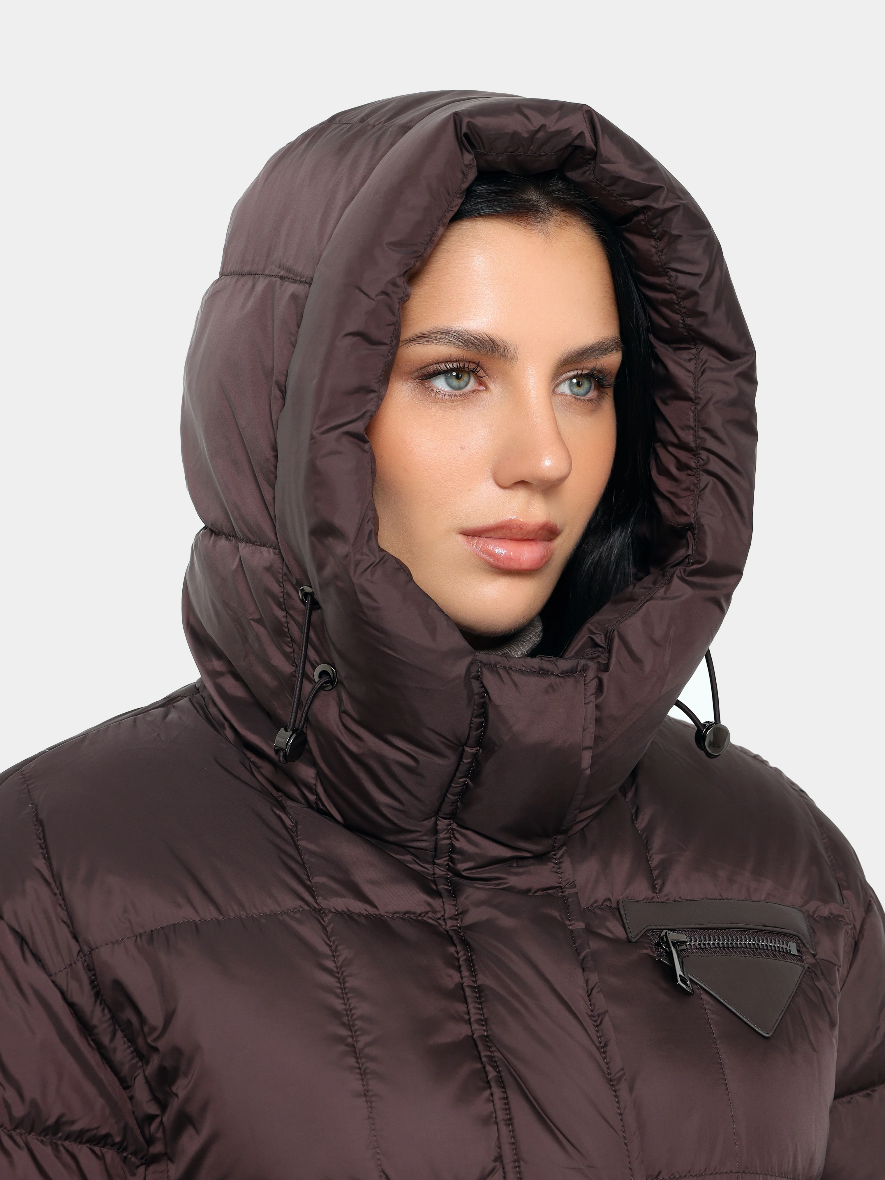 Зимняя женская куртка-пуховик с верхом из полиэстера. В составе утеплителя пуховика – 70% пух и 30% перо. Куртка застегивается на двойную молнию и кнопки. Имеется несъемный капюшон, который утягивается благодаря шнурку с фиксаторами. Пуховик выполнен с двумя внешними боковыми карманами на кнопке и одним внутренним нагрудным карманом без застежки. Низ куртки утягивается с помощью шнурка с фиксаторами. Рукава выполнены с манжетами на резинке для сохранения тепла. К пуховику прилагается пояс с металлической пряжкой-фастексом и максимальной длиной 125 см.