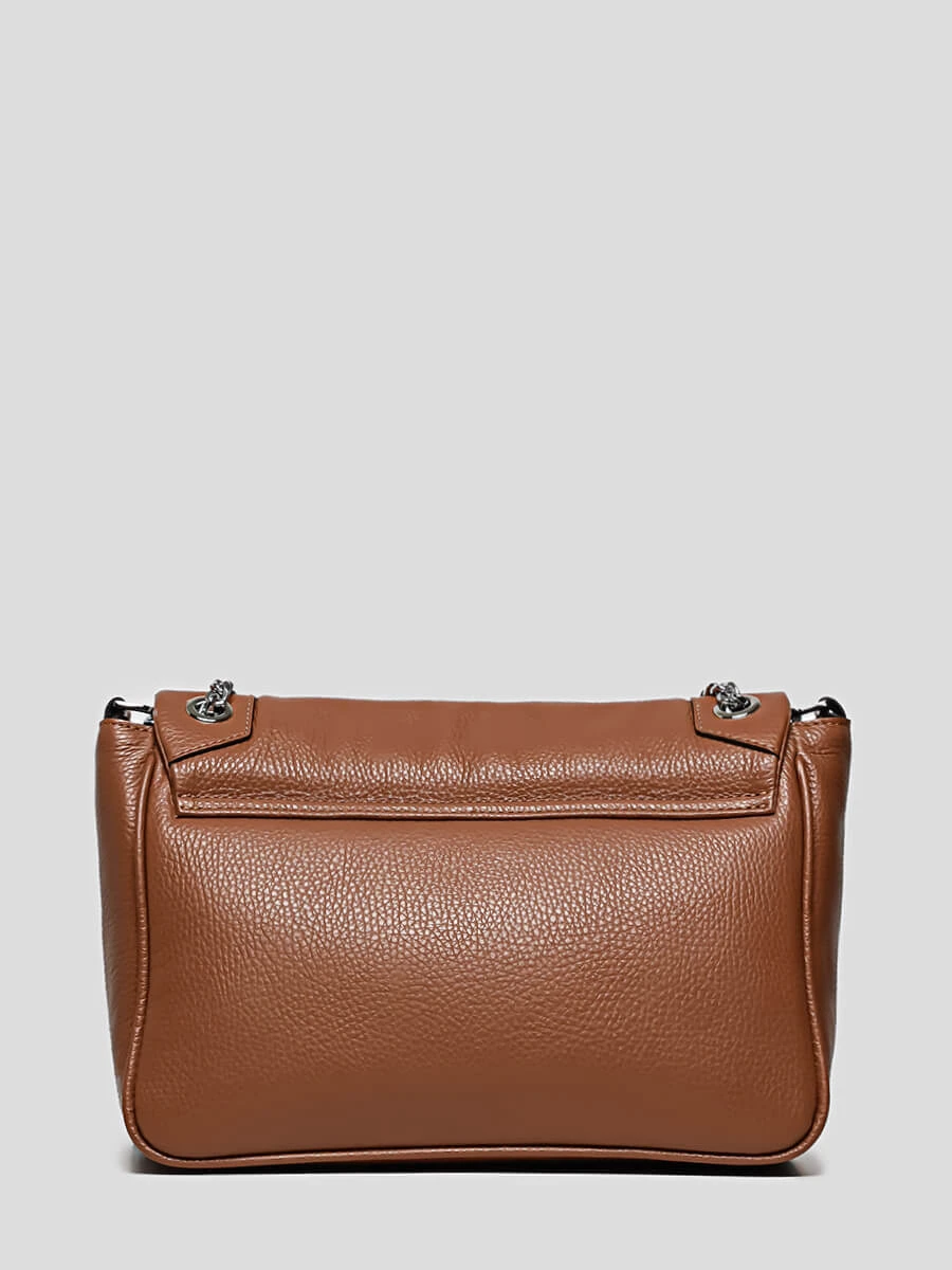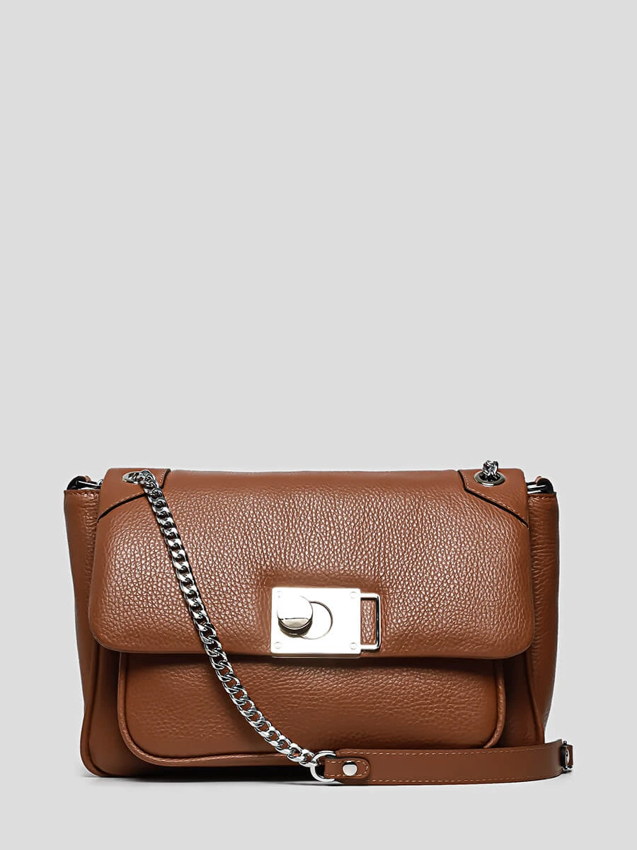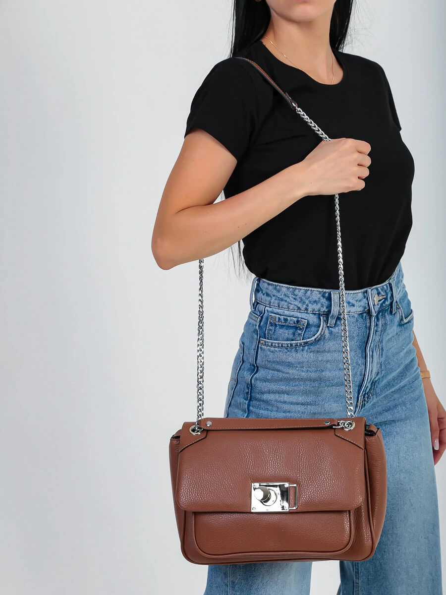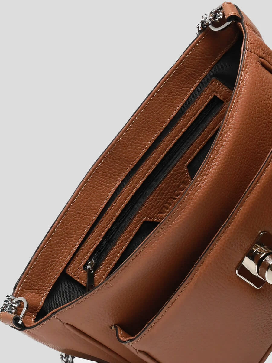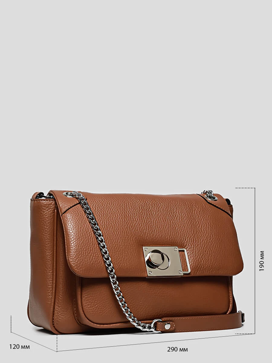 Сумка женская закрывается клапаном на декоративный замок. Внутри два отдела: большой отдел, в котором карман для документов на молнии, и небольшой объемный отдел для телефона или документов.