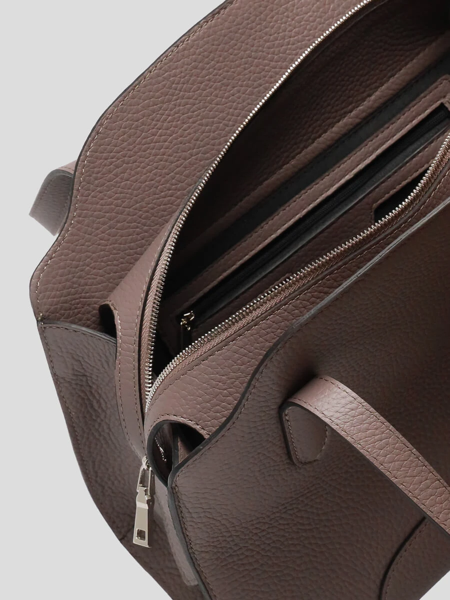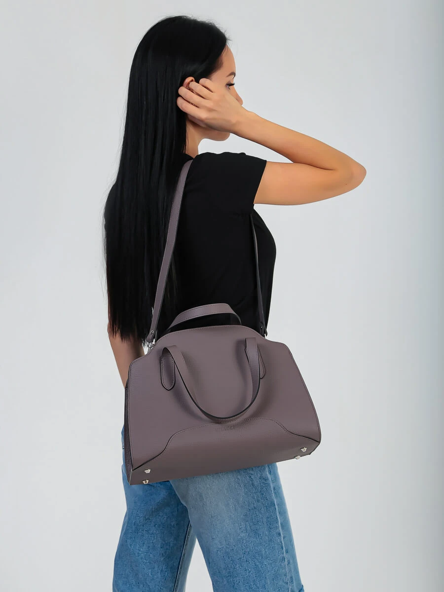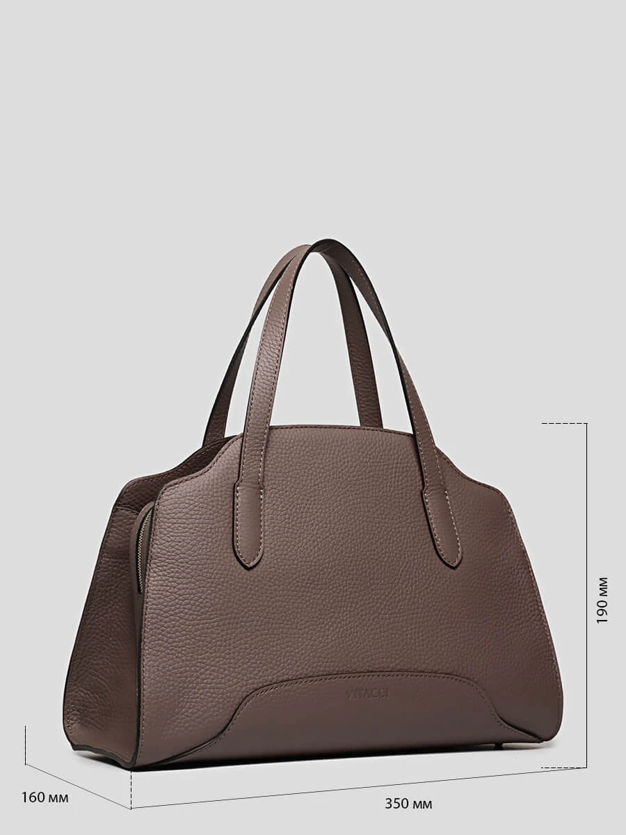 Сумка женская закрывается на молнию. Внутри один большой отдел с тремя карманами для документов и мелочи, один из которых закрывается на молнию.