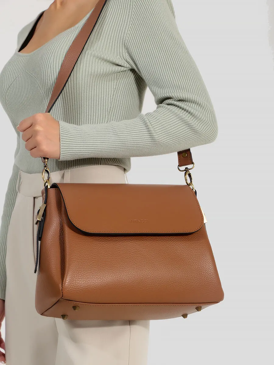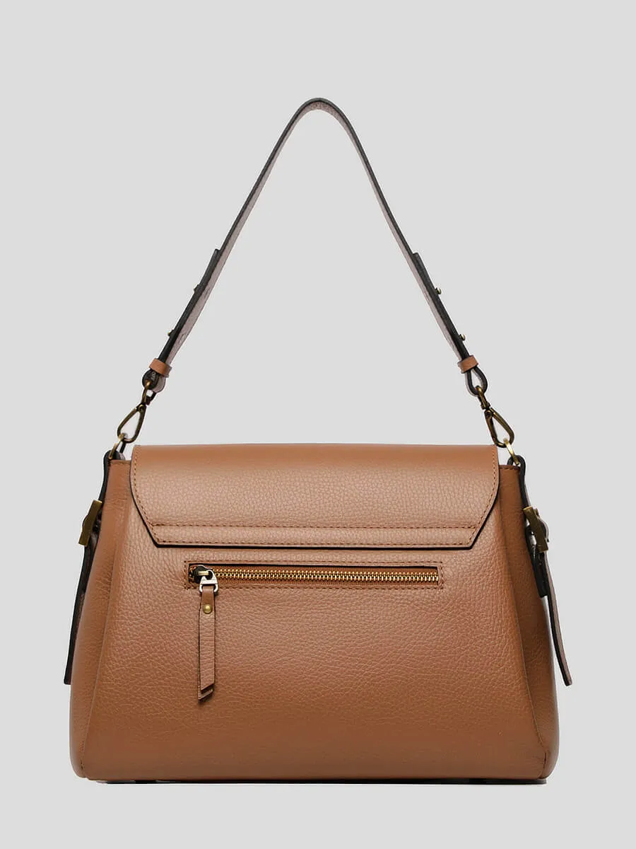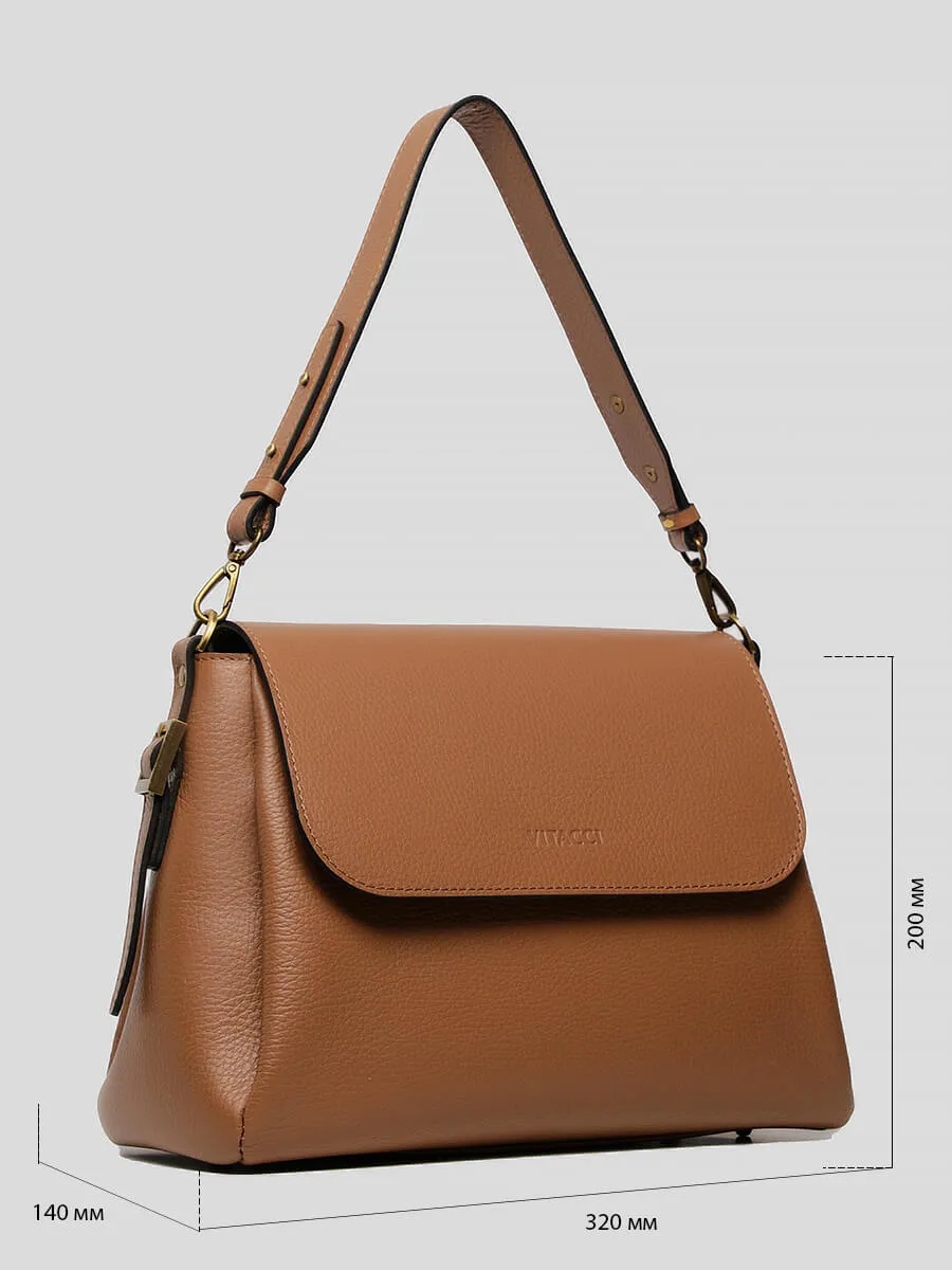 Сумка женская, закрывается клапаном на магнитную кнопку. Внутри один отдел с карманом для телефона и с карманом для документов на молнии. С внешней стороны на задней стенке сумки - карман на молнии.