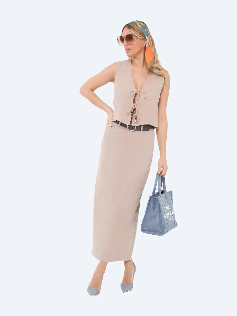 Женская жилетка от бренда VITACCI выполнена из льна. В качестве застежки используются завязки, которые формируют V-образный вырез. Низ изделия фигурный с заострёнными углами.