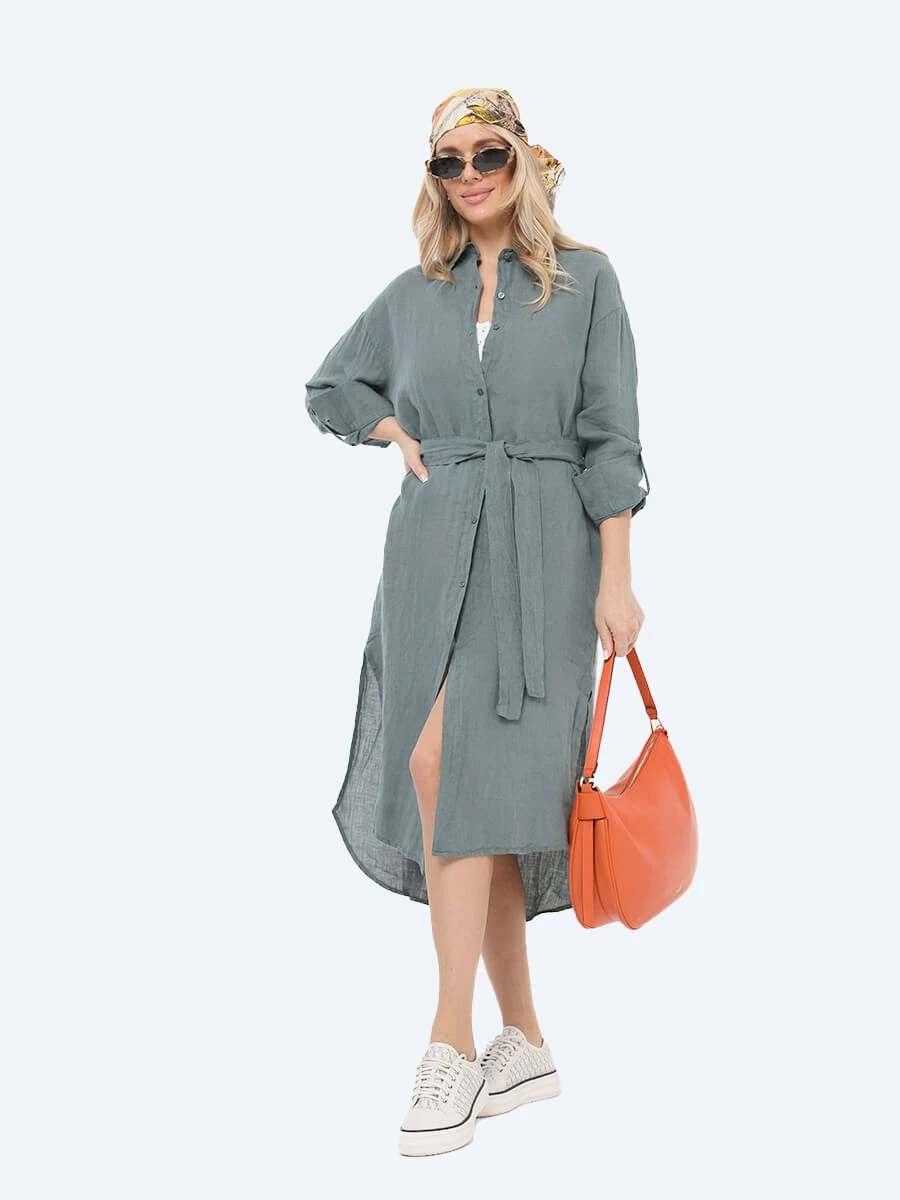 Летнее платье от VITACCI из льна. Платье-рубашка с удлиненной спинкой и с длинными рукавами. В комплекте прилагается ремешок.