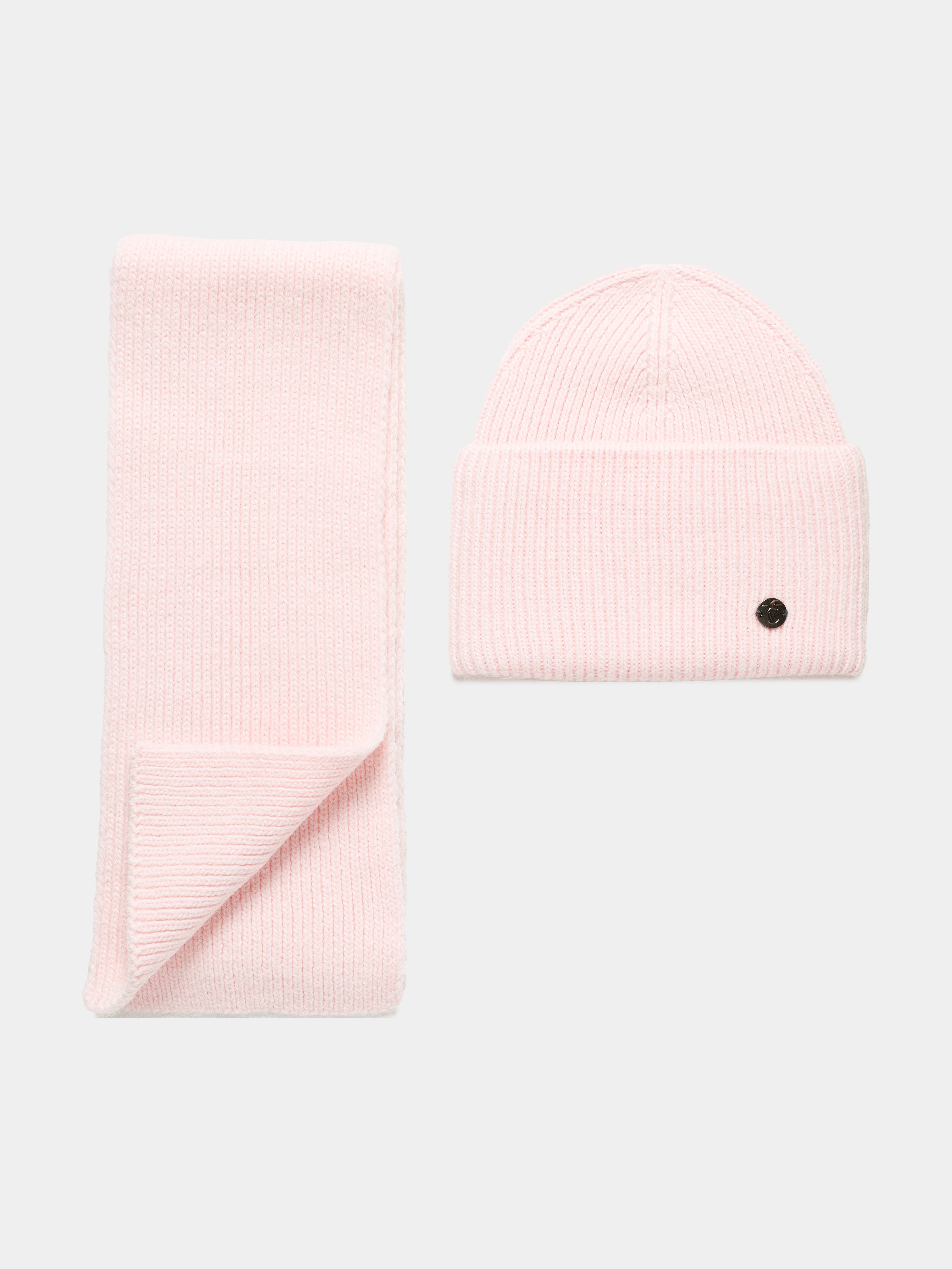 Комплект состоящий из шапки-бини с отворотом и шарфа.