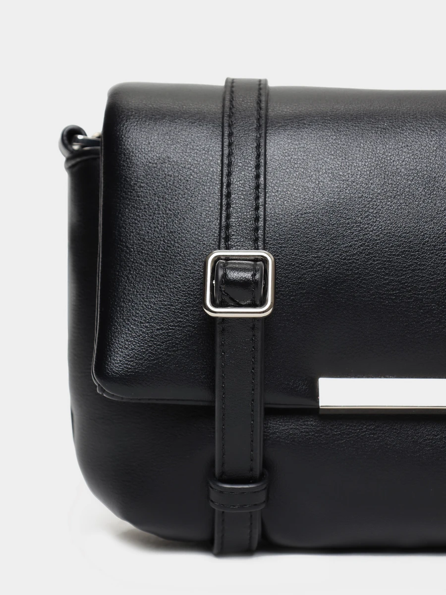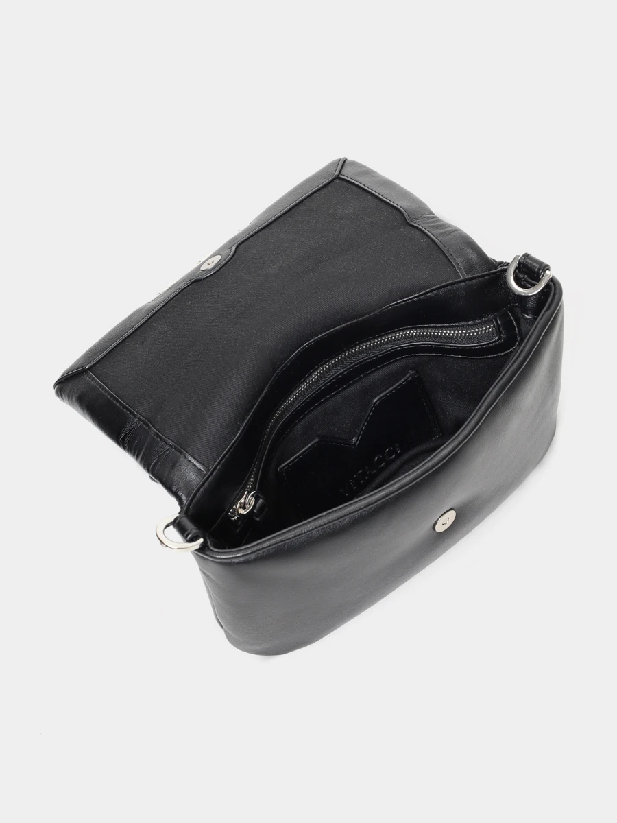 Женская сумка закрывается клапаном с магнитной кнопкой. Внутри открытый карман для быстрого доступа к необходимому и карман на молнии для хранения документов.