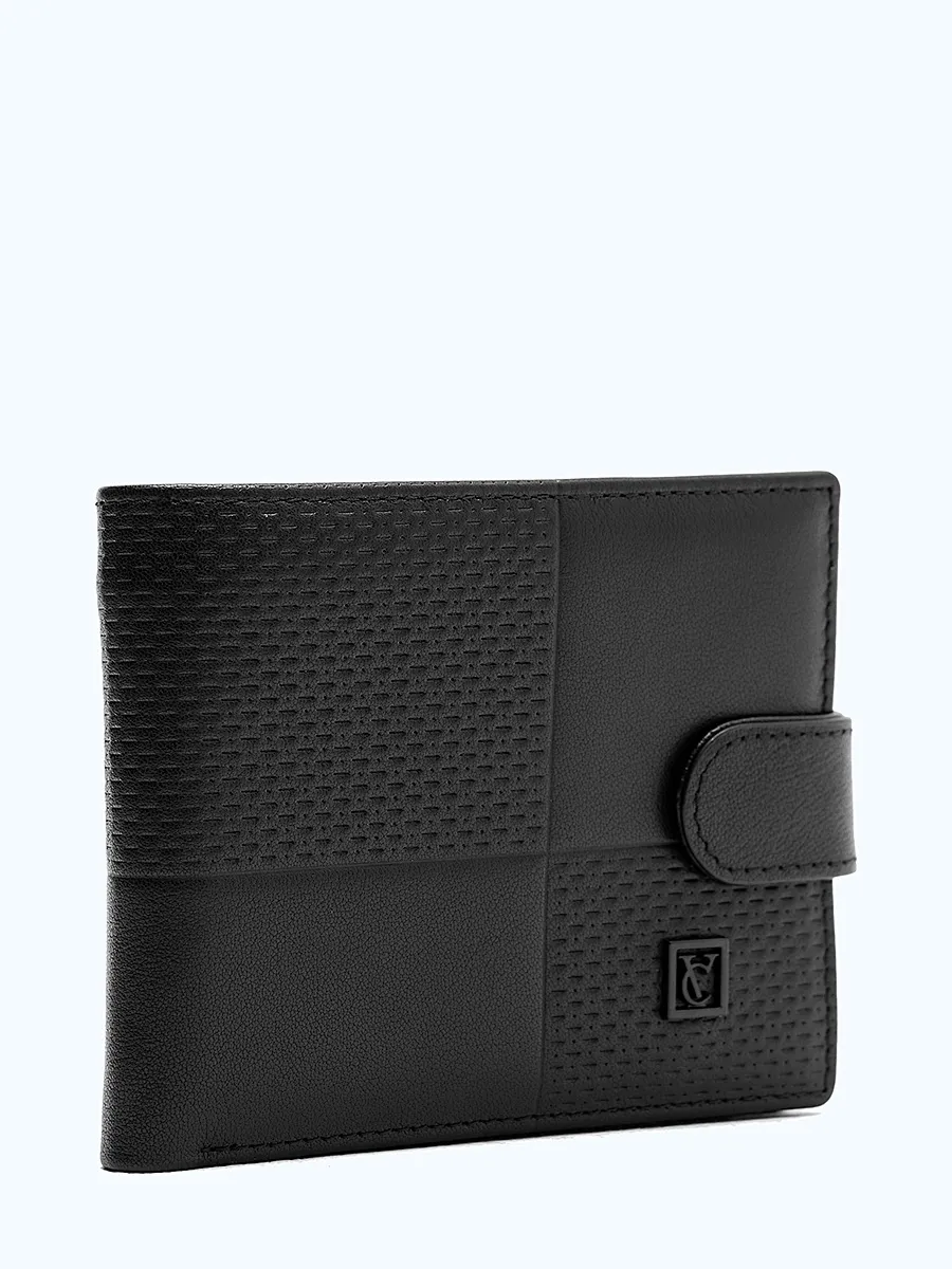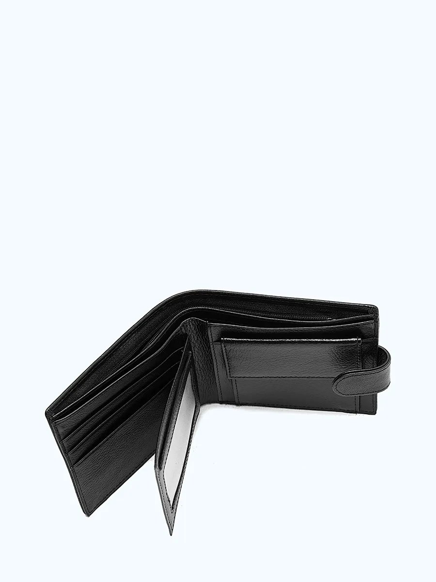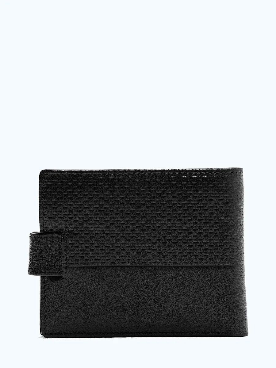 Кошелек выполнен из натуральной кожи. Детали: три отсека для купюр, шесть отсеков для карточек, отсек для водительского удостоверения и отсек для монет на кнопке.