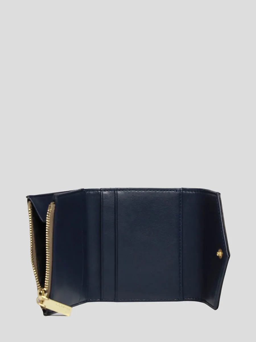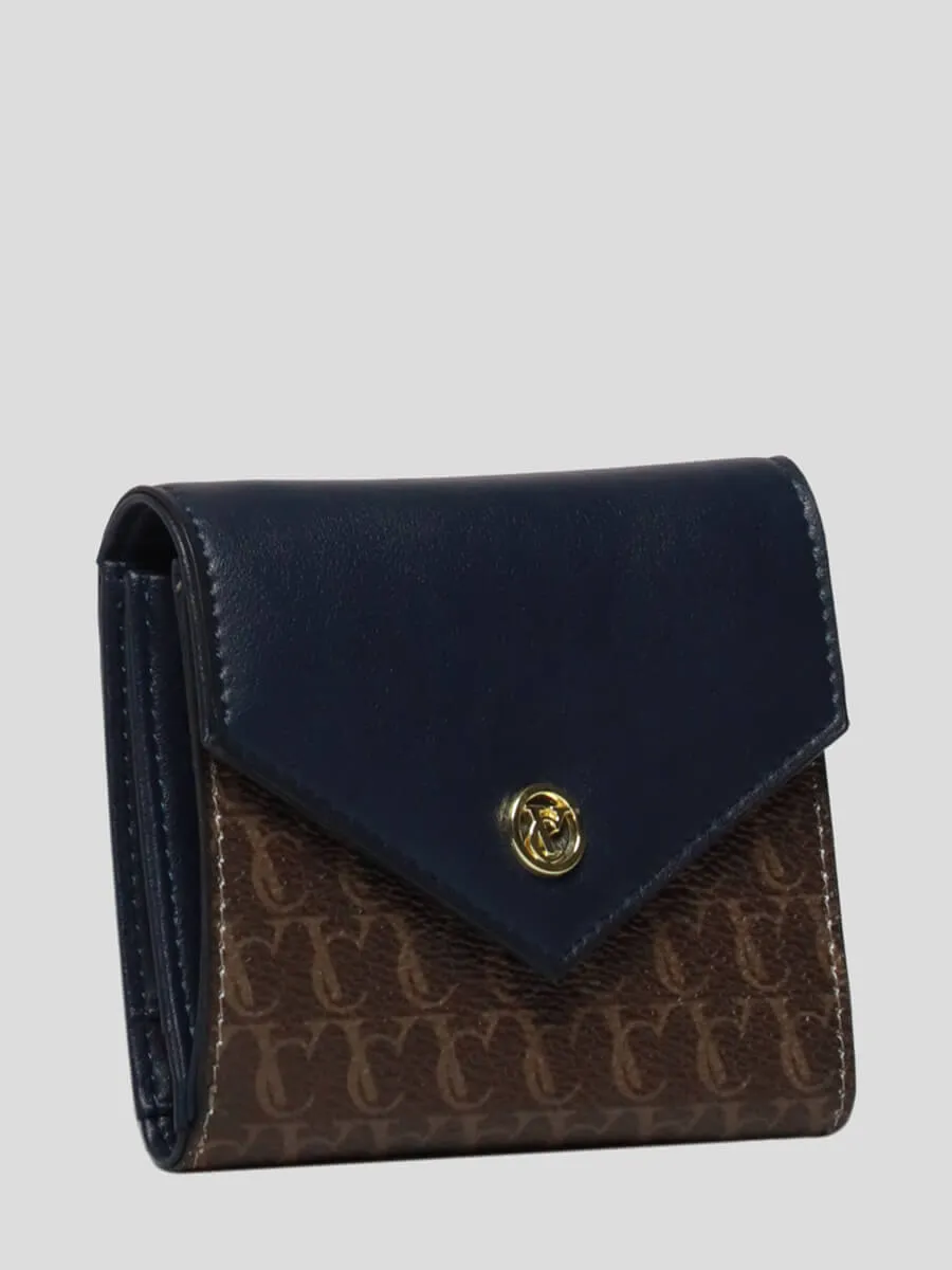 Кошелек закрывается клапаном на кнопку. Внутри: четыре отдела для карточек, карман для мелочи на молнии.