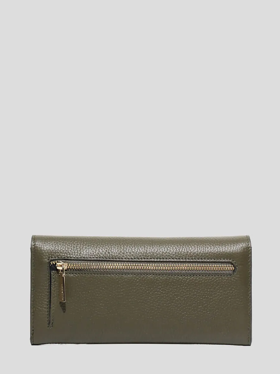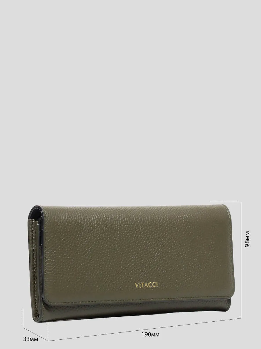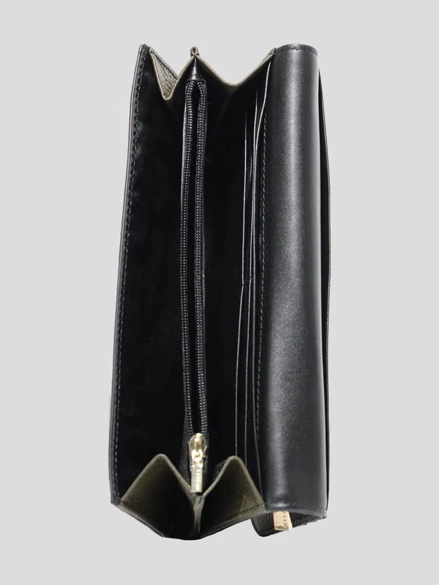 Кошелек женский, закрывается клапаном на две кнопки. Внутри четыре отдела для купюр, один отдел на молнии и 12 карманов для пластиковых карт. Снаружи, на задней стенке кошелька, карман на молнии для мелочи.