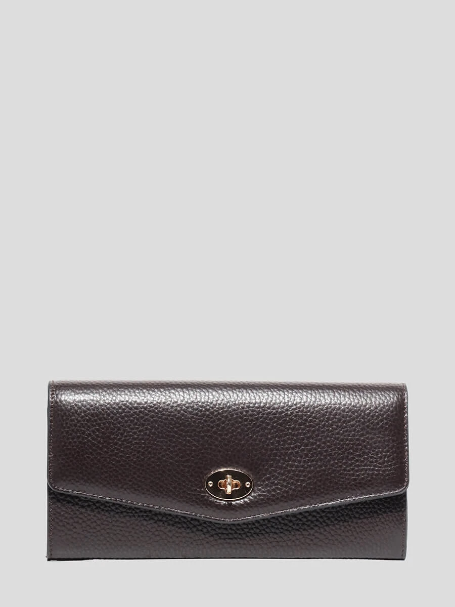 Кошелек женский, закрывается клапаном на поворотный замочек. Внутри три отдела для купюр, один отдел для мелочи на молнии и 5 карманов для пластиковых карт. Снаружи, на задней стенке кошелька, карман для проездного.