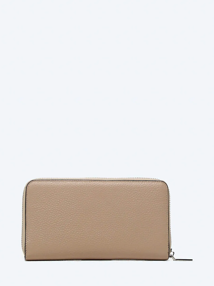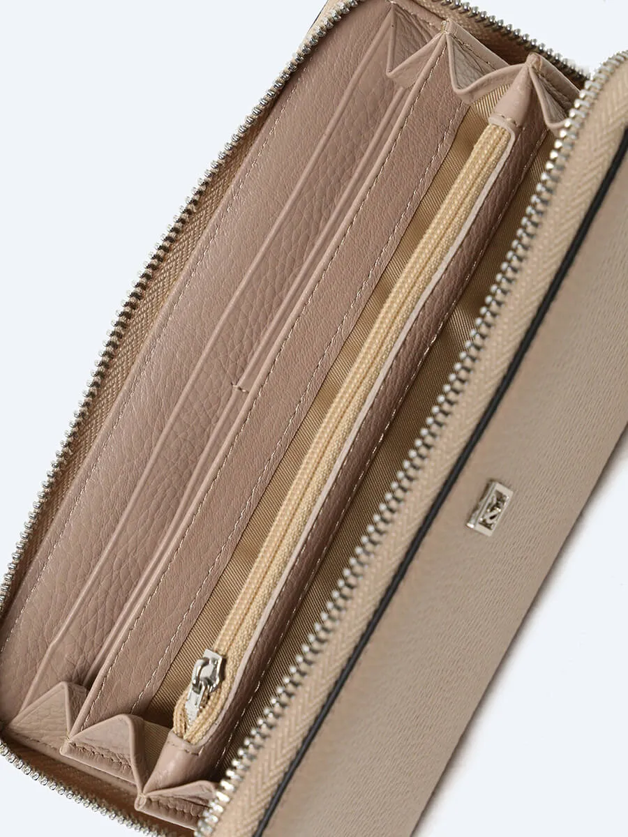 Кошелек женский закрывается на молнию. Внутри три больших и два потайных отдела для купюр, одно отделение для монет на молнии и восемь отсеков для карточек. Дополнительно - ремешок на запястье.