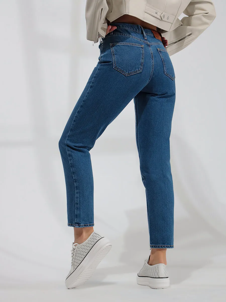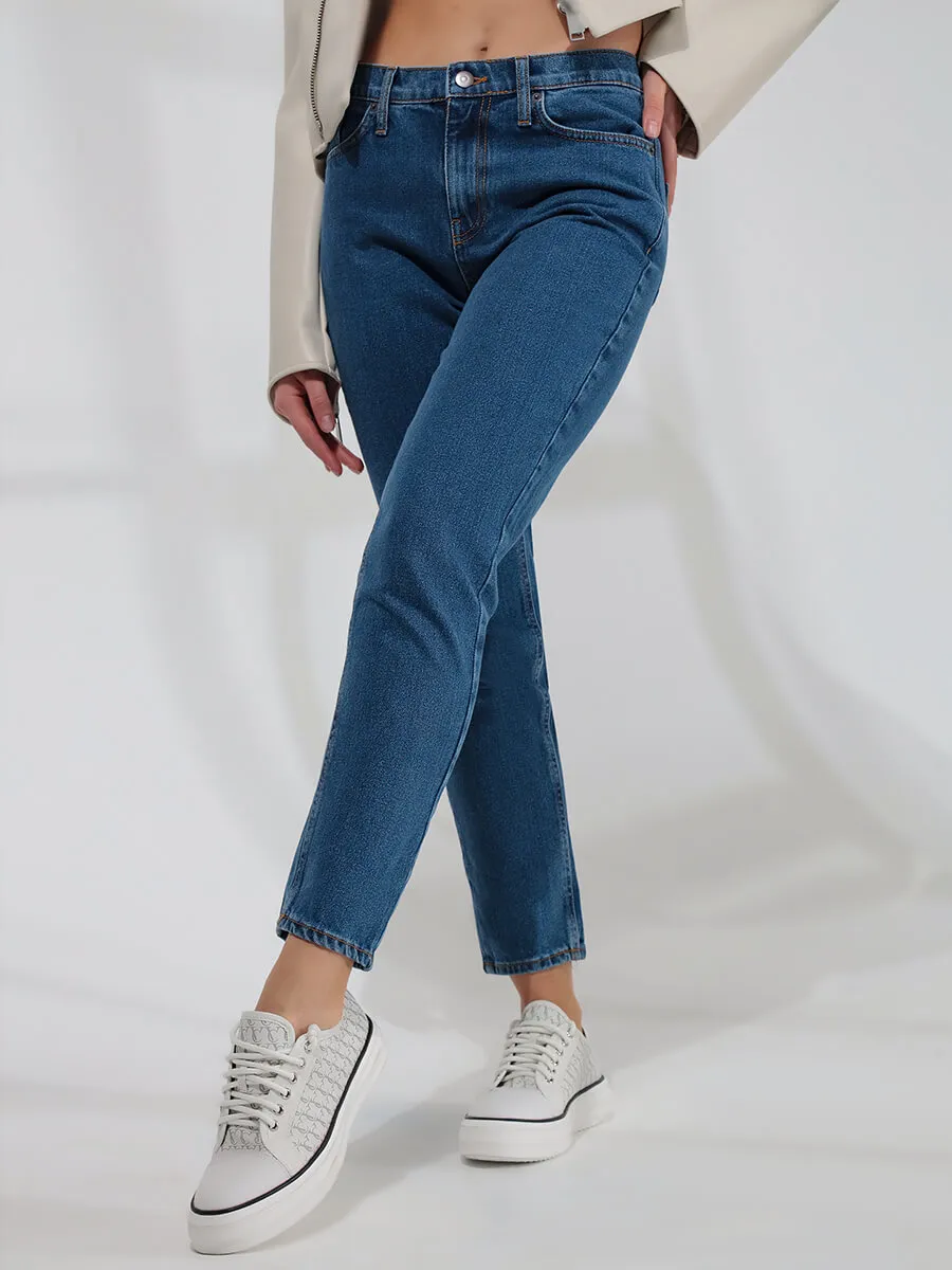 Зауженные джинсы с немного завышенной талией. Выполнены из хлопка. Застежка на молнию и пуговицу. Имеются действующие карманы.