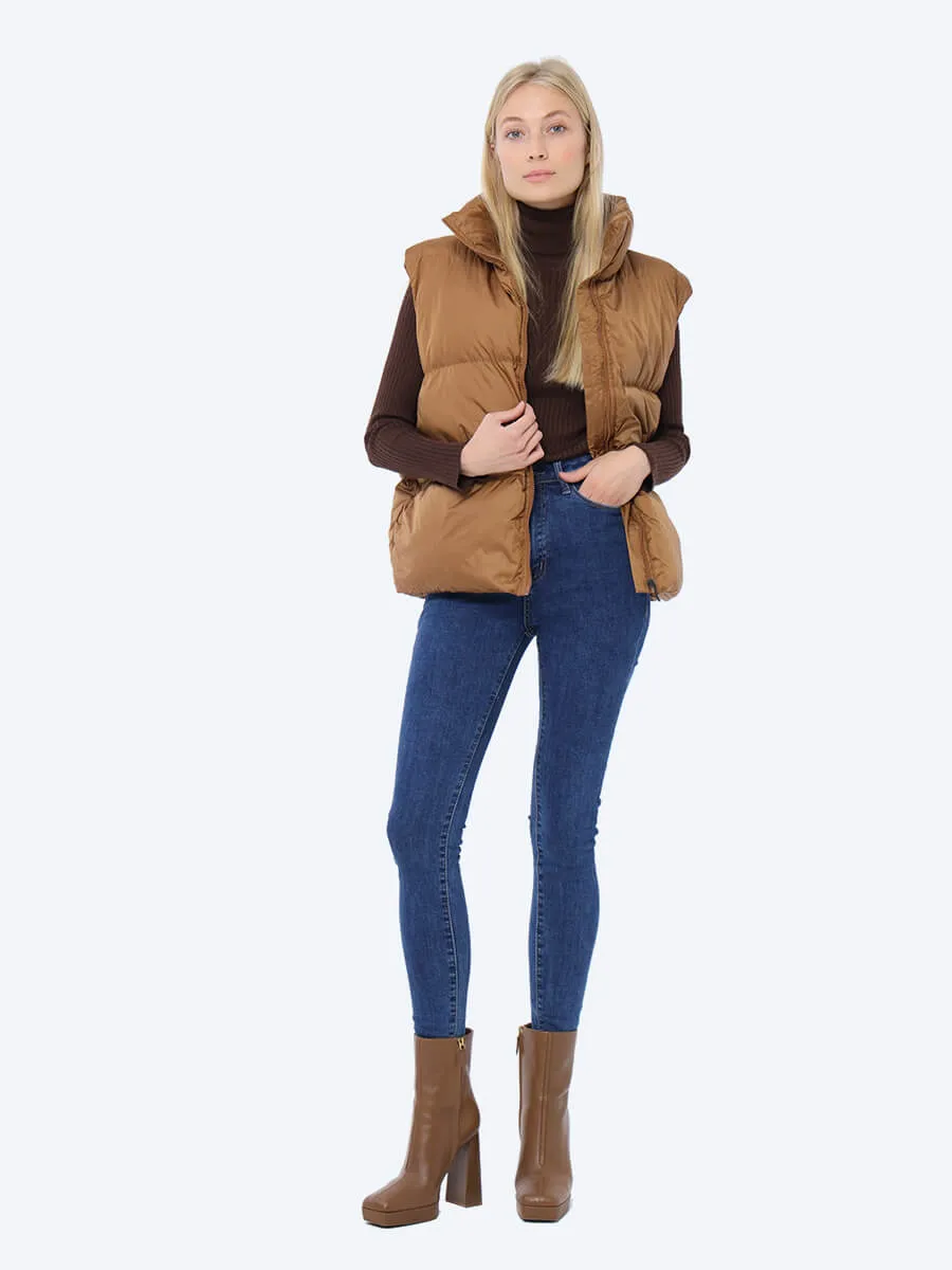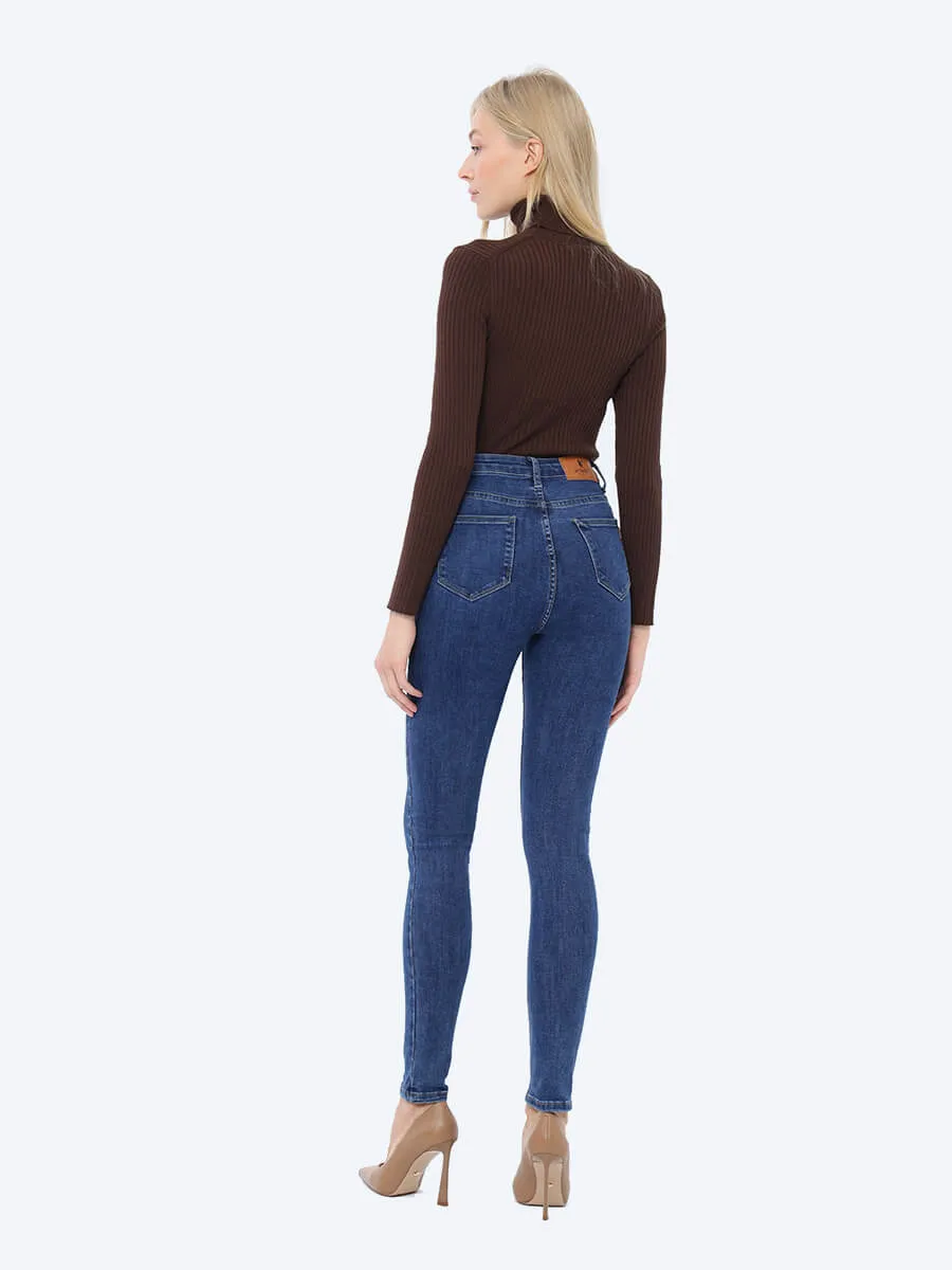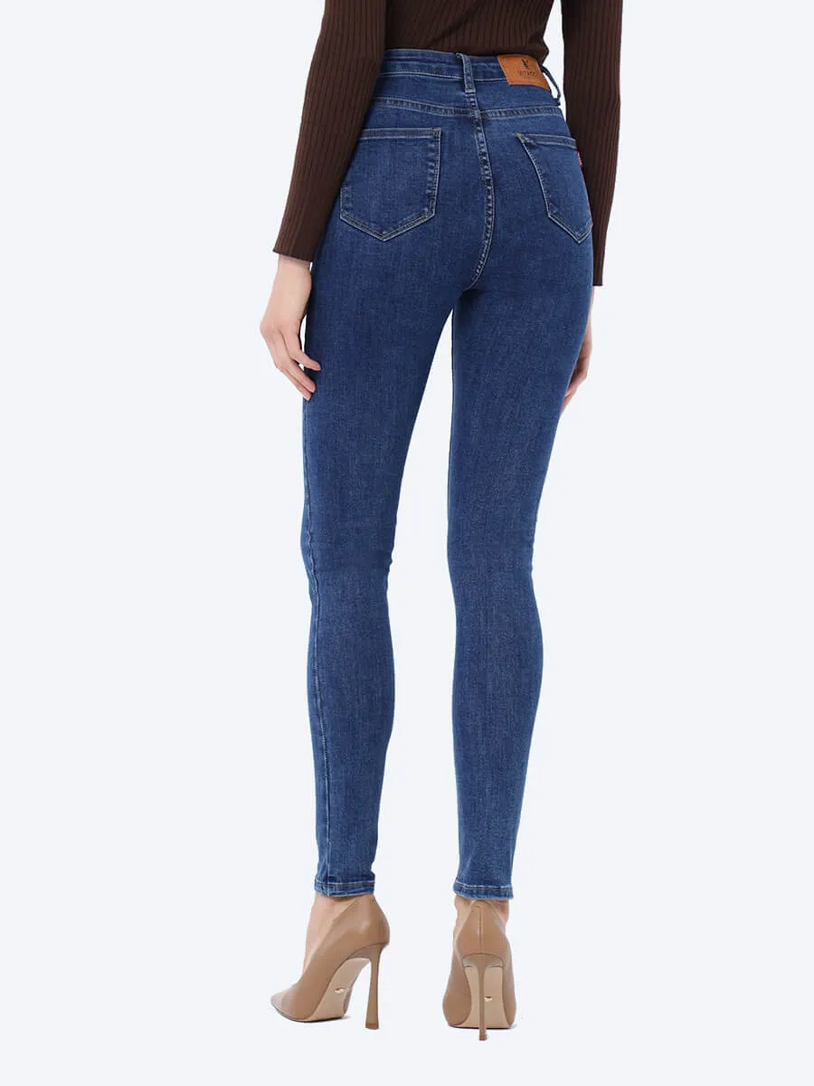 Джинсы-скинни (skinny) с высокой посадкой. В составе хлопок и полиэстер с небольшим включением спандекса, который обеспечивает эластичность ткани. Застежка на молнию и пуговицу. Имеются действующие карманы.