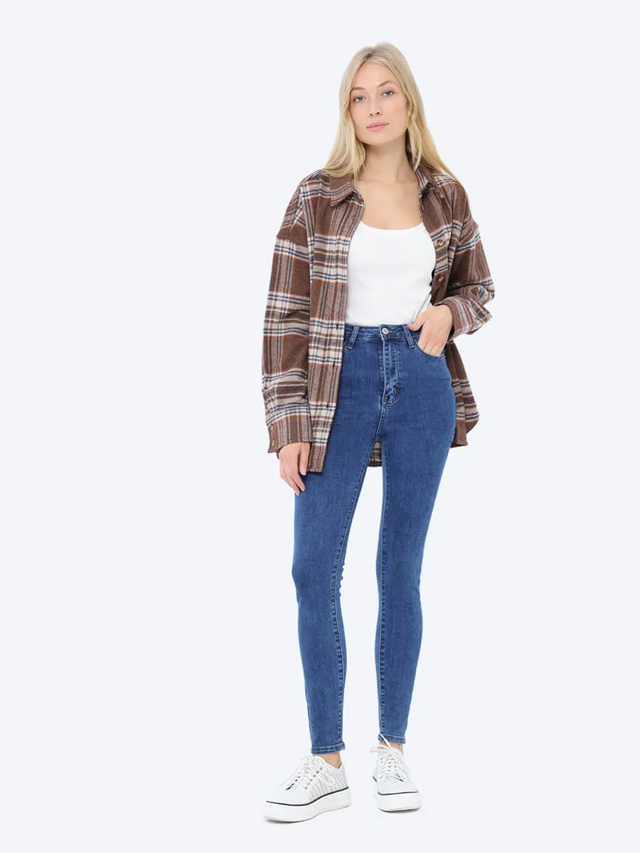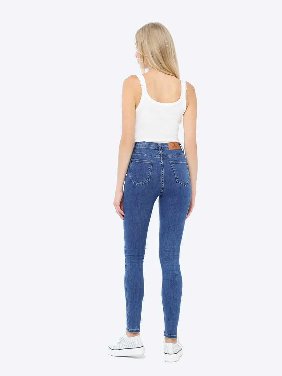 Джинсы-скинни (skinny) с высокой посадкой. В составе хлопок и полиэстер с небольшим включением спандекса, который обеспечивает эластичность ткани. Застежка на молнию и пуговицу. Имеются действующие карманы.