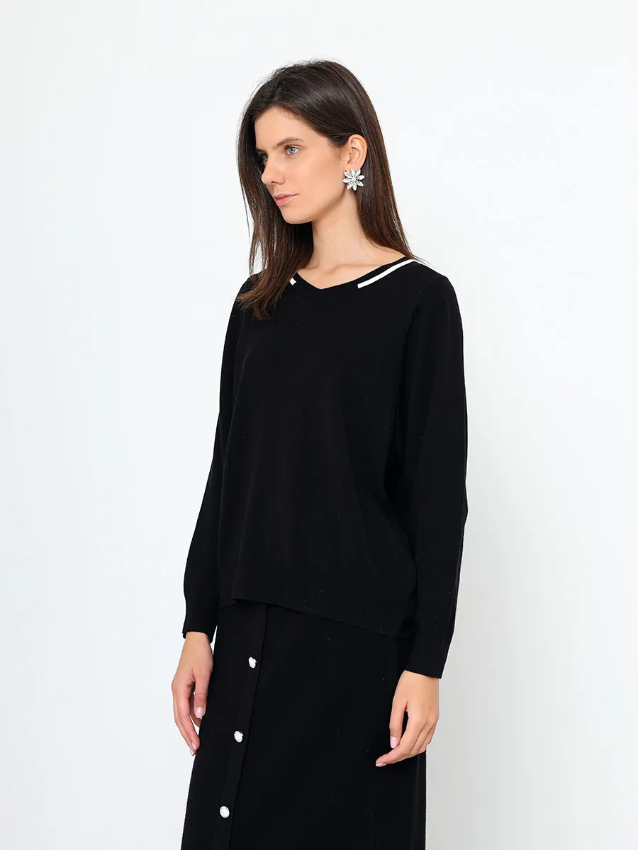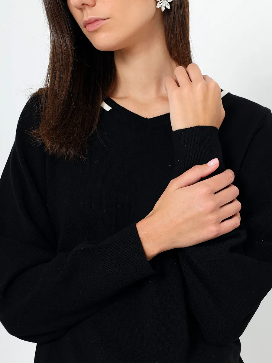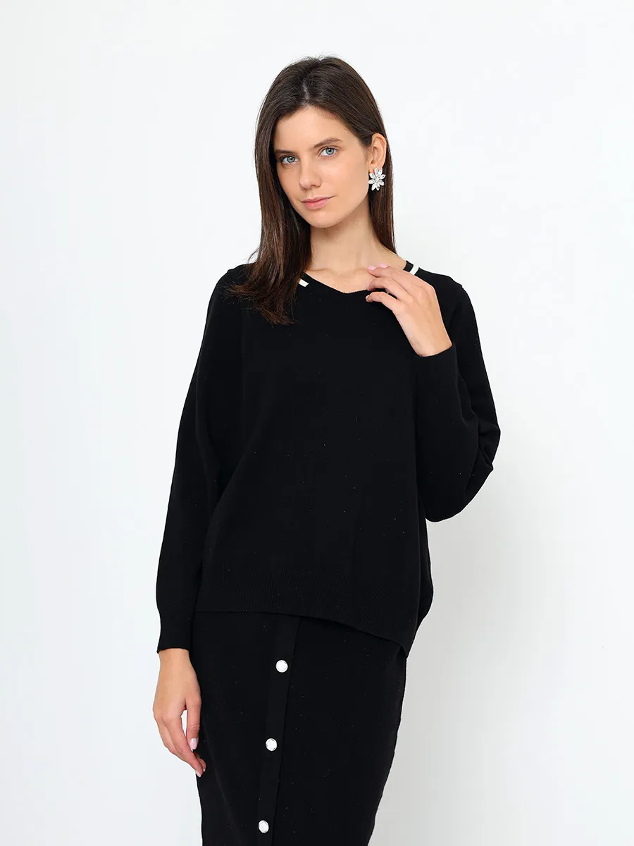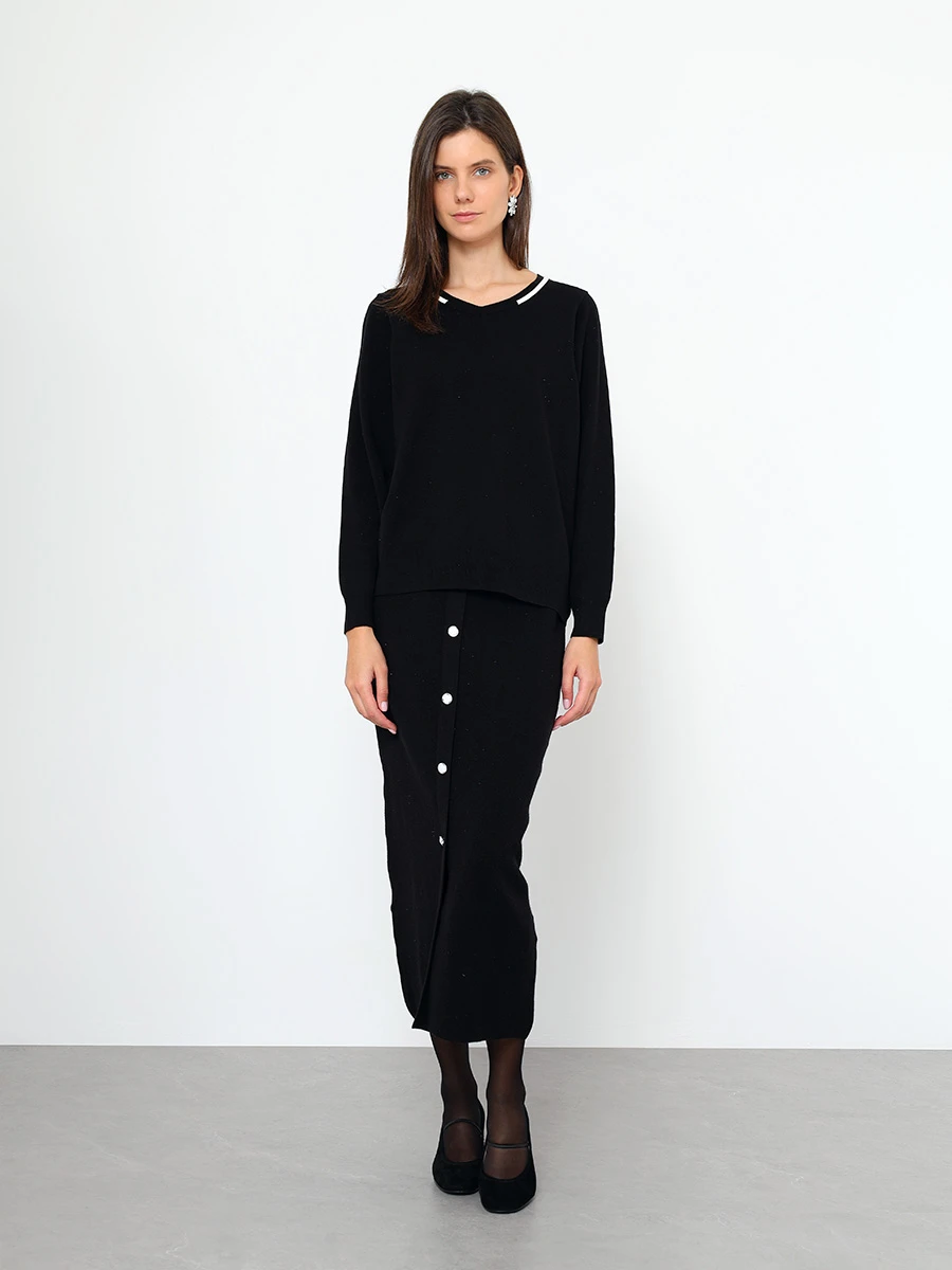Комплект женской одежды состоит из джемпера и юбки. В составе костюма преобладает вискоза. Джемпер выполнен с длинным рукавом фасона "летучая мышь" и V-образным вырезом горловины. Юбка прямого кроя с высокой посадкой и резинкой на талии.