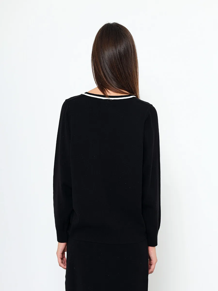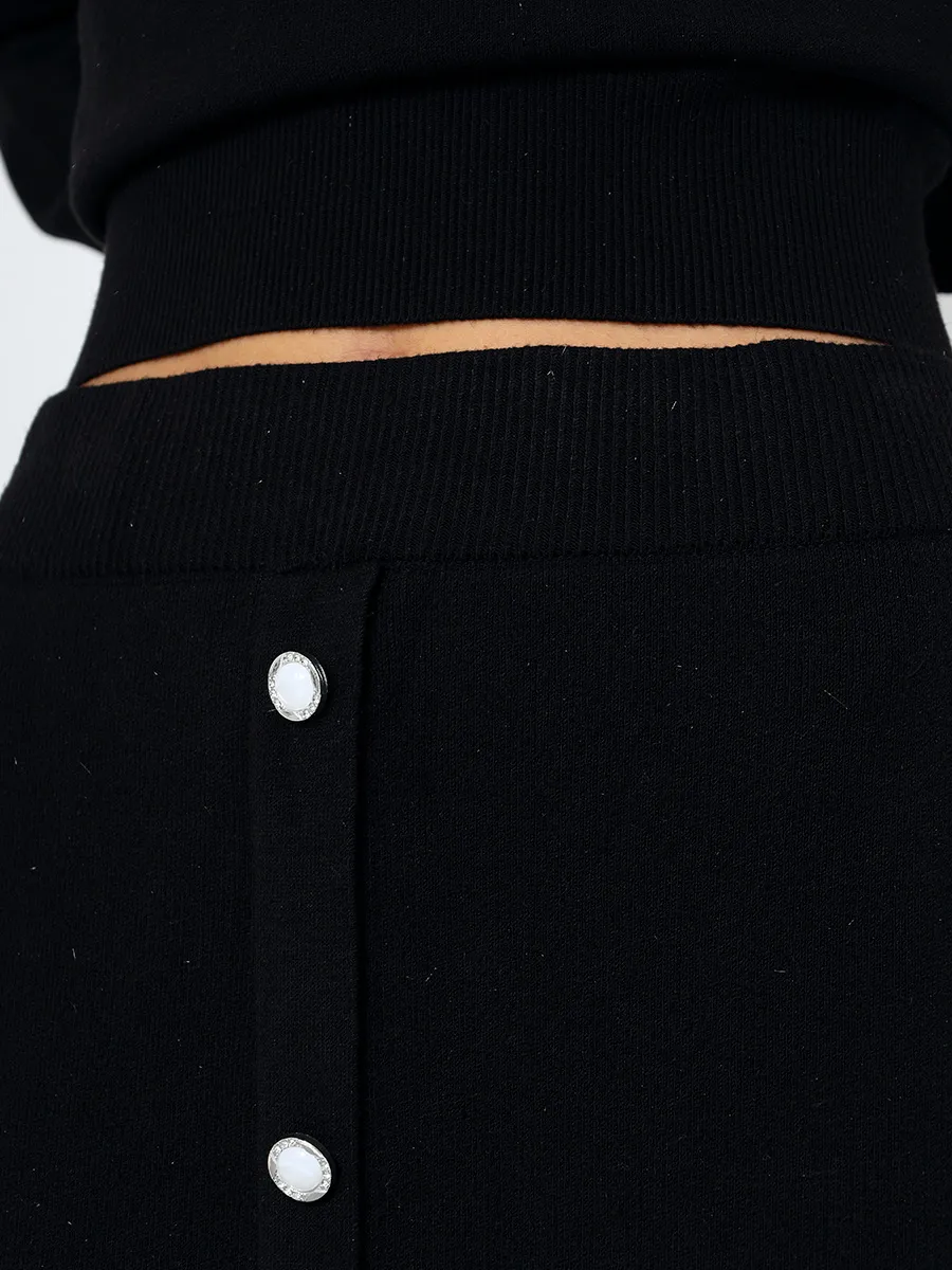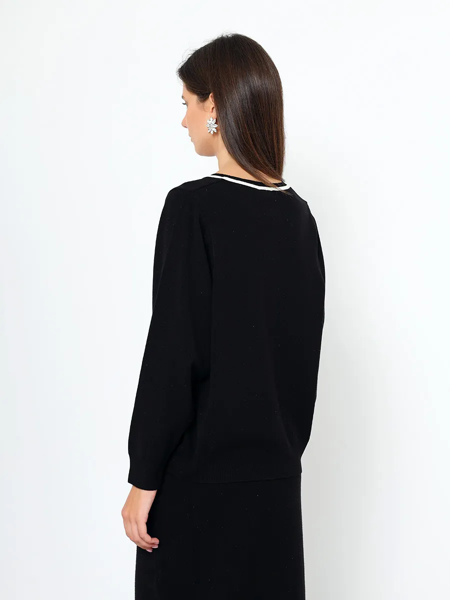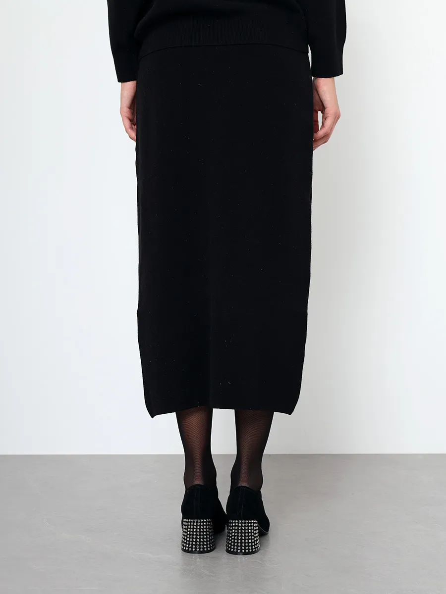 Комплект женской одежды состоит из джемпера и юбки. В составе костюма преобладает вискоза. Джемпер выполнен с длинным рукавом фасона "летучая мышь" и V-образным вырезом горловины. Юбка прямого кроя с высокой посадкой и резинкой на талии.