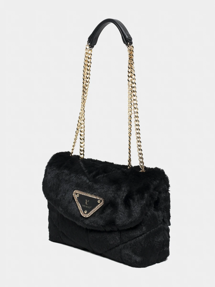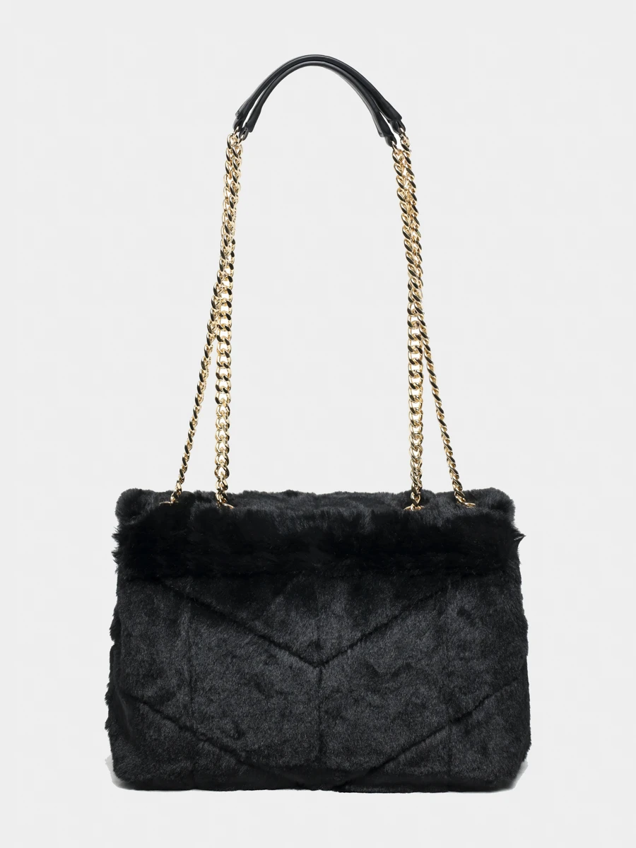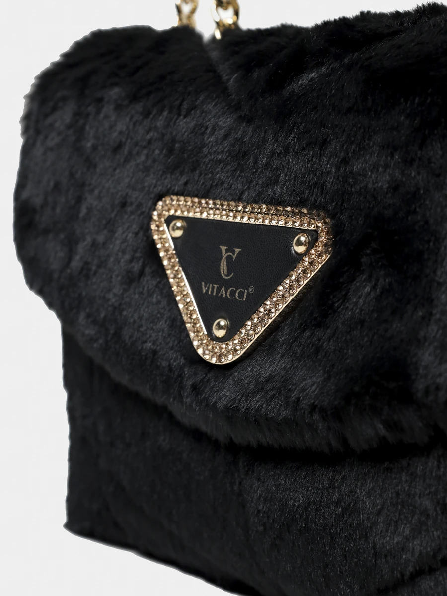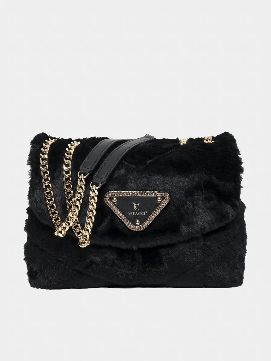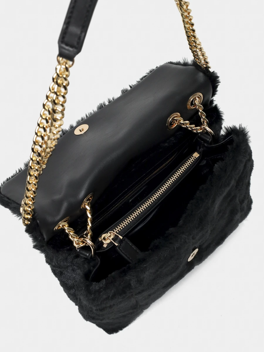 Сумка из искусственного меха закрывается на клапан с магнитной кнопкой, имеет одно отделение посередине, закрывающееся на молнию и два открытых отделения, один внутренний карман на молнии и два открытых внутренних кармана.