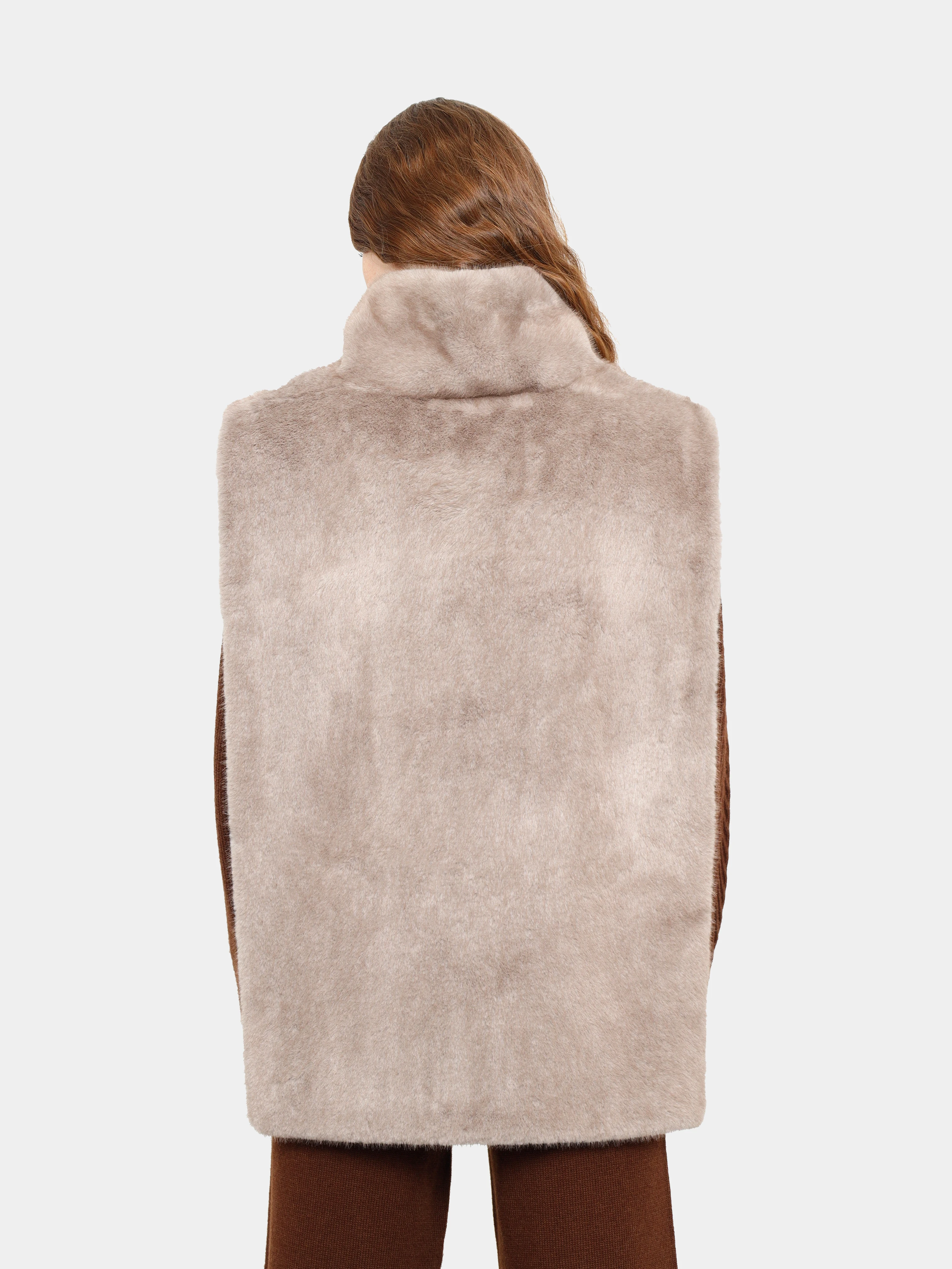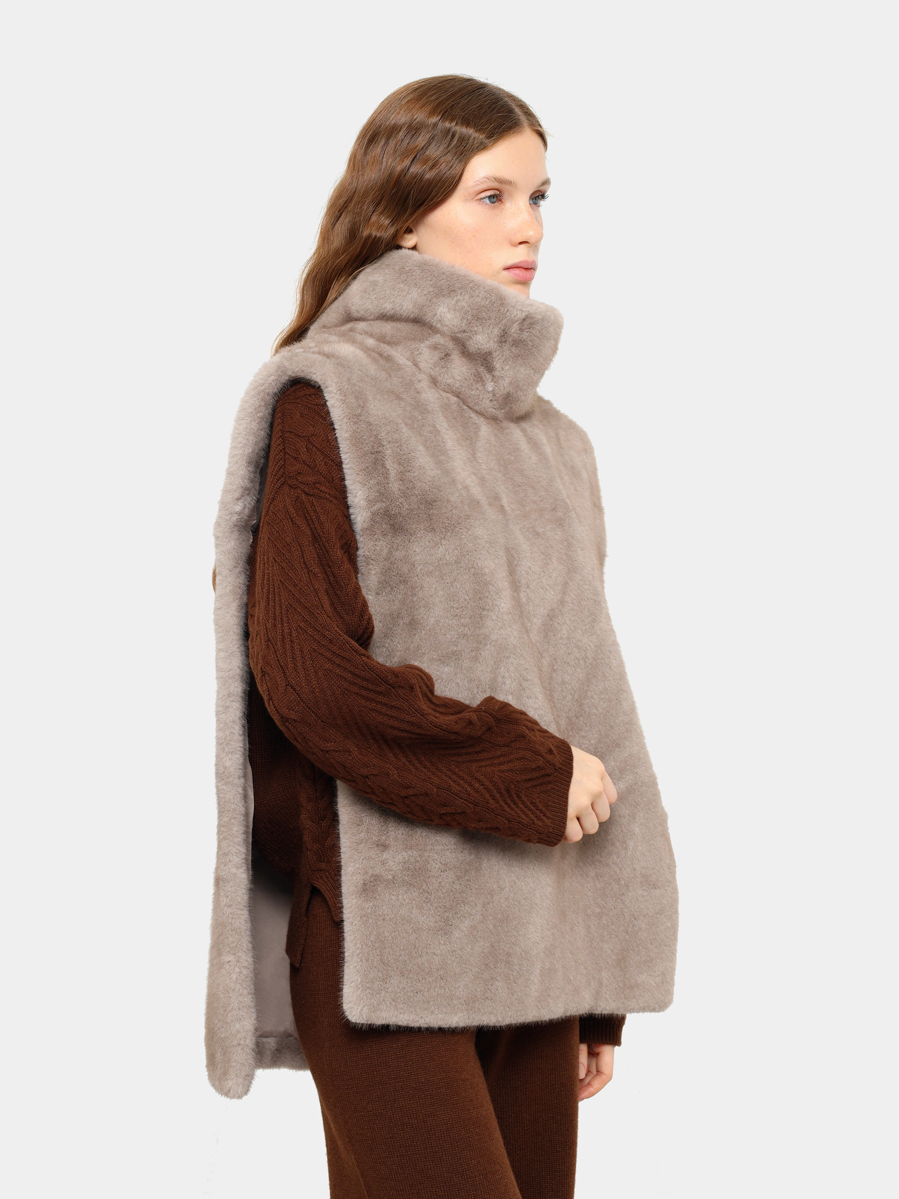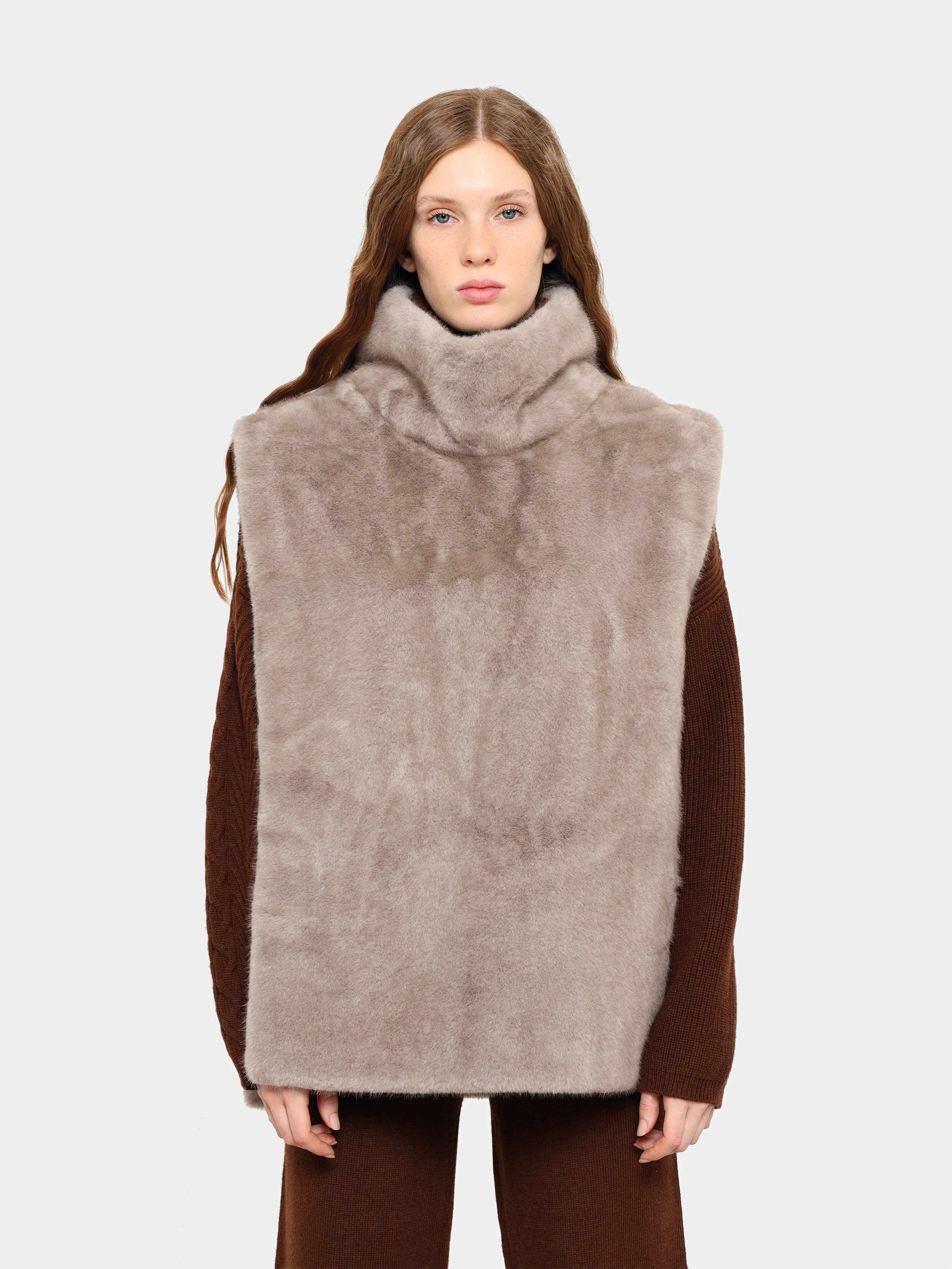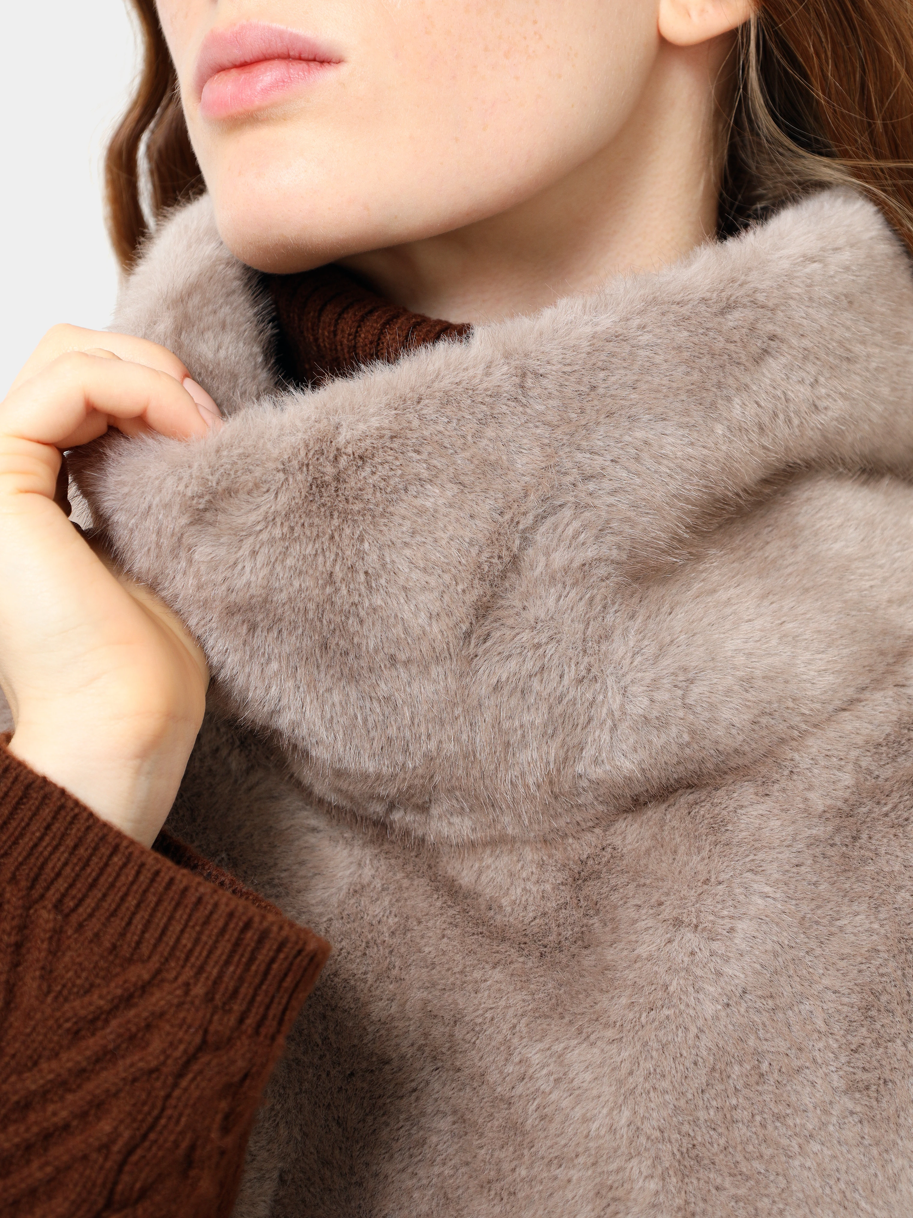 Манишка для женщин с верхом из искусственного меха и с мягкой текстильной подкладкой. Манишку можно носить под пальто или шубой, либо как отдельный предмет верхней одежды, декорировав ремнем или брошью, а также на современный лад – поверх куртки-косухи. Особенности манишки: прямой крой, просторный воротник-стойка.