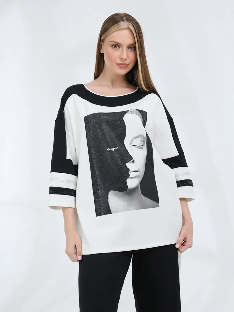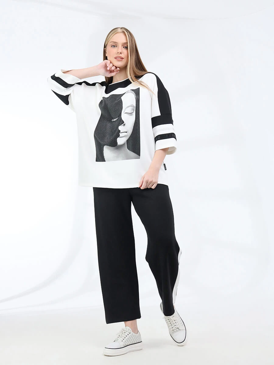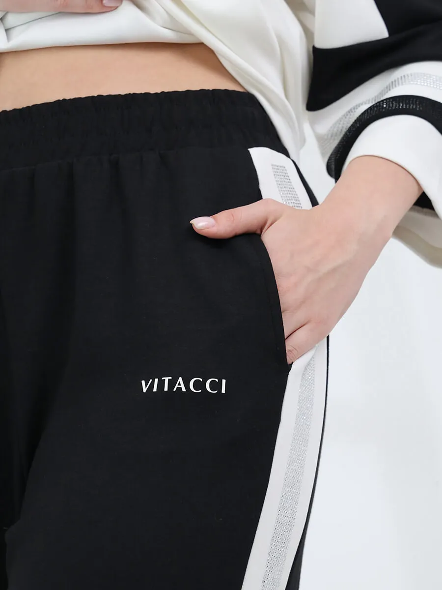 Комплект из джемпера и брюк от VITACCI выполнен из полиэстера и вискозы с включением лайкры. Джемпер с укороченными рукавами "клёш". Брюки оснещены карманами и резинкой. Комплект декорирован стразами и принтом. Обхват талии: 42 (50) - 80 см, 44 (52) - 82 см, 46 (54) - 86 см. Обхват груди: 42 (50) - 120 см, 44 (52) - 122 см, 46 (54) - 128 см. Обхват бедер: 42 (50) - 112 см, 44 (52) - 116 см, 46 (54) - 120 см.