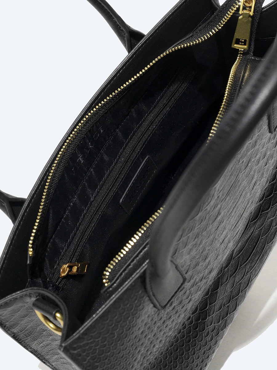 Сумка закрывается на молнию, имеет одно отделение, один внешний карман на молнии сзади, один внутренний карман на молнии, один открытый внутренний карман. В комплекте длинный съёмный ремень с регулировкой длины пряжкой.