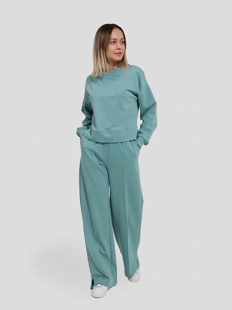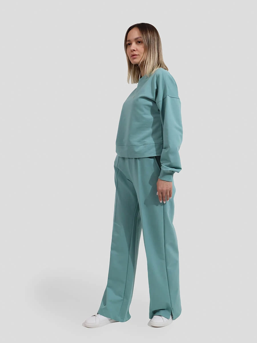 Костюм состоит из джемпера и кюлотов с гладкой фактурой. Материал - футер 2-х нитка с полиэстером. Джемпер и брюки-кюлоты свободного кроя. Данный костюм обеспечит стильный образ и комфорт.