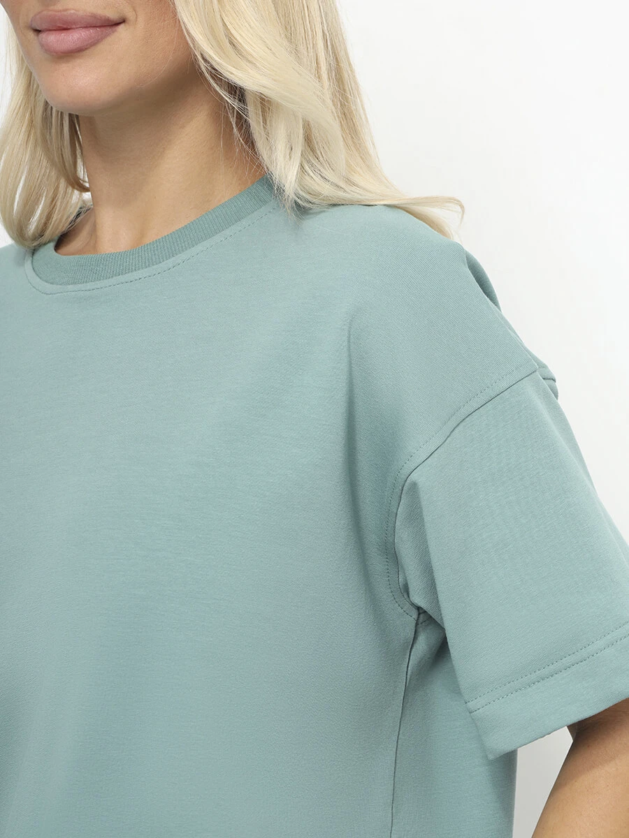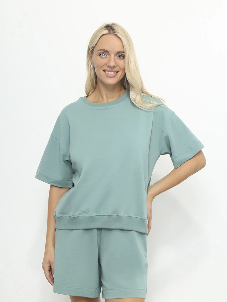 Костюм состоит из футболки и шорт с гладкой фактурой. Материал - футер 2-х нитка с полиэстром. Футболка и шорты свободного кроя. Данный костюм обеспечит стильный образ и комфорт.