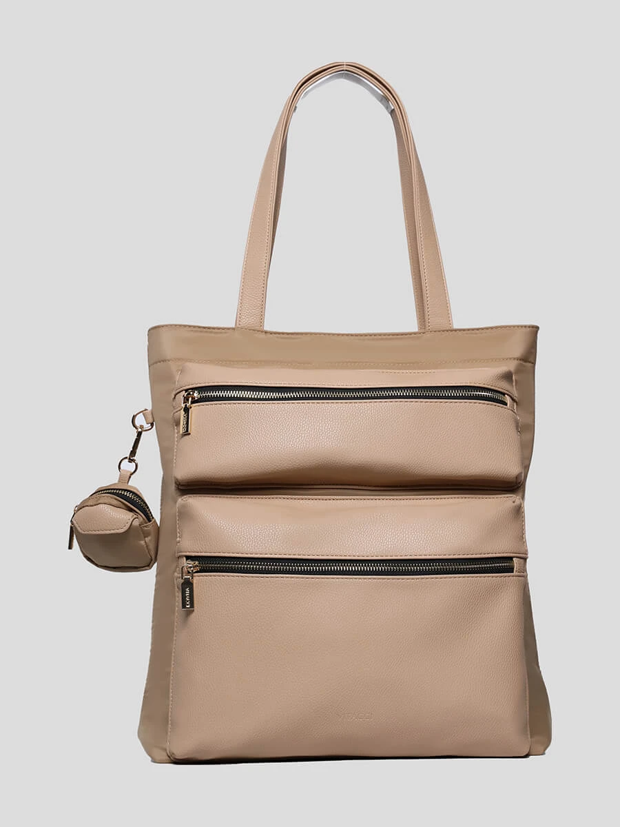 Сумка женская закрывается на молнию. На лицевой стороне и задней стенке имеются карманы, закрывающиеся на молнию. Внутри одно просторное отделение с карманом на молнии и двумя отсеками для мелочей. Прилагается маленький кошелек на карабине.